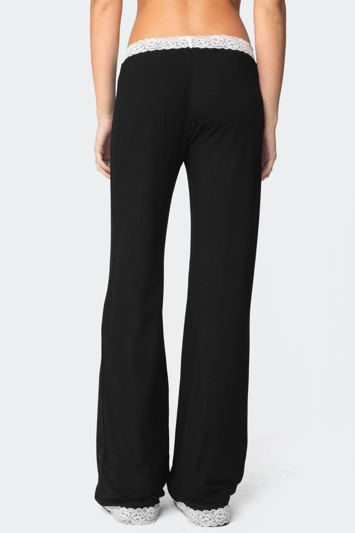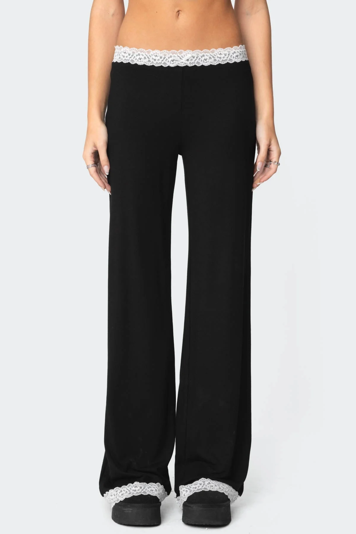 Enjoy comfort and style with our black lace trim sleepwear pants made of Rayon and Spandex. Featuring a contrast lace trim and center bow detail for a chic look. Available in sizes XS, S, M, L, and XL. Ideal for relaxing at home or a good nights sleep. Machine wash cold with similar colors for easy care.