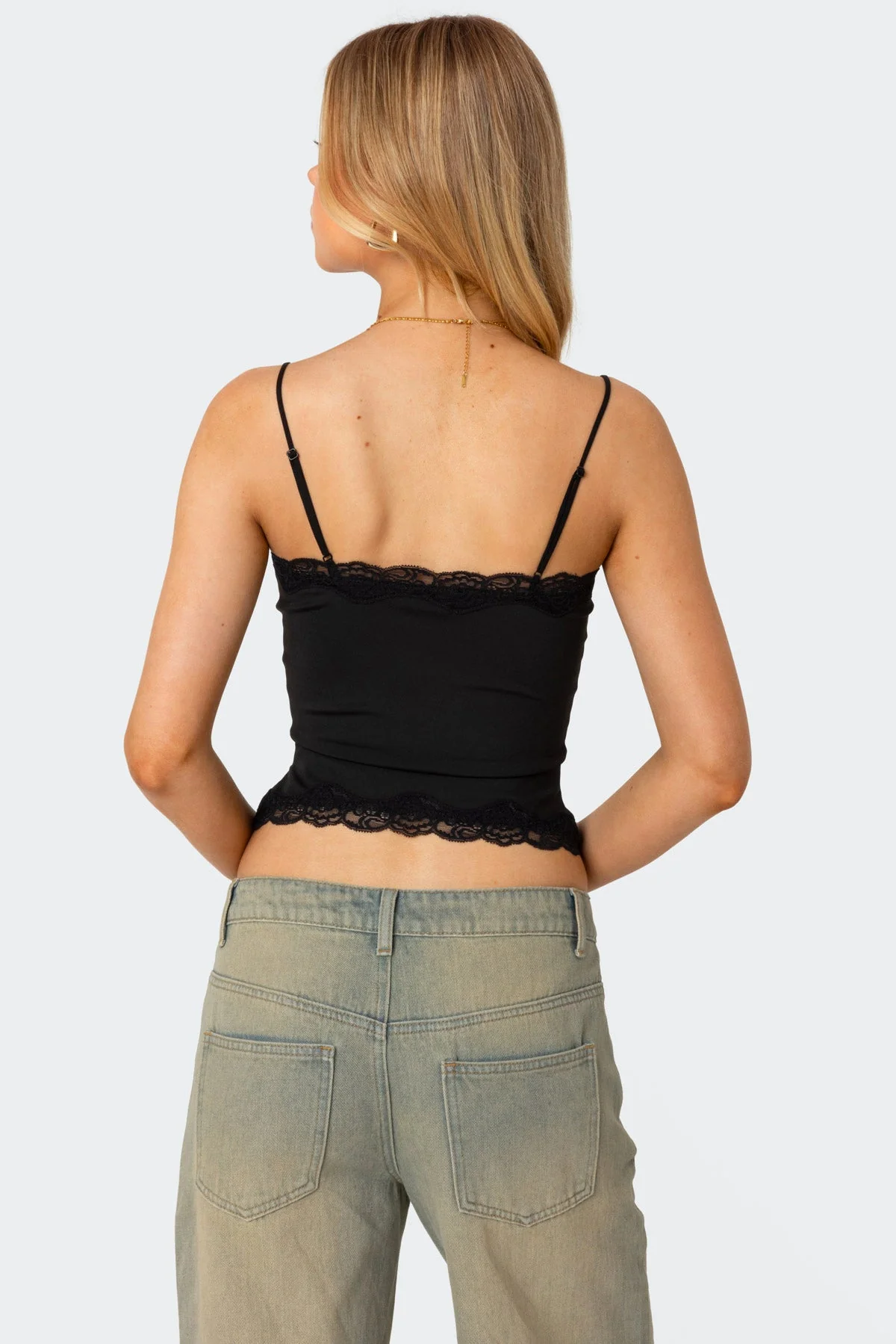 This Black Lace Trim Tank Top is a versatile addition to your wardrobe. Made of high-quality polyester and spandex, this tank features adjustable straps for a comfortable fit. Whether worn on its own or layered, this tank adds a touch of elegance to any outfit. Machine washable for easy care. Model wears size S. Model height is 57.