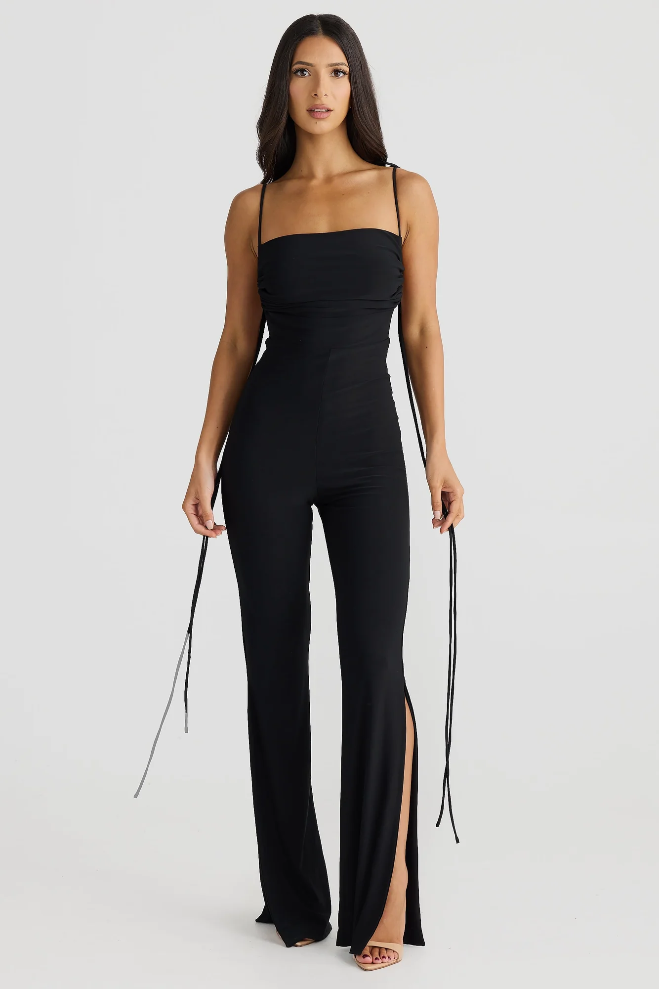 Elevate your wardrobe with Nele Lace Up Jumpsuit in black, crafted from our signature stretch fabric. This versatile jumpsuit features a multi-way neckline, signature back detail, and side leg split for easy movement. With a pleated low back and self-tie elongated strings, this jumpsuit is as stylish as it is comfortable. Fully lined and double-layered, Nele is a wardrobe essential. Available in sizes S, M, L. Fabric composition: 94% Polyester, 6% Spandex.