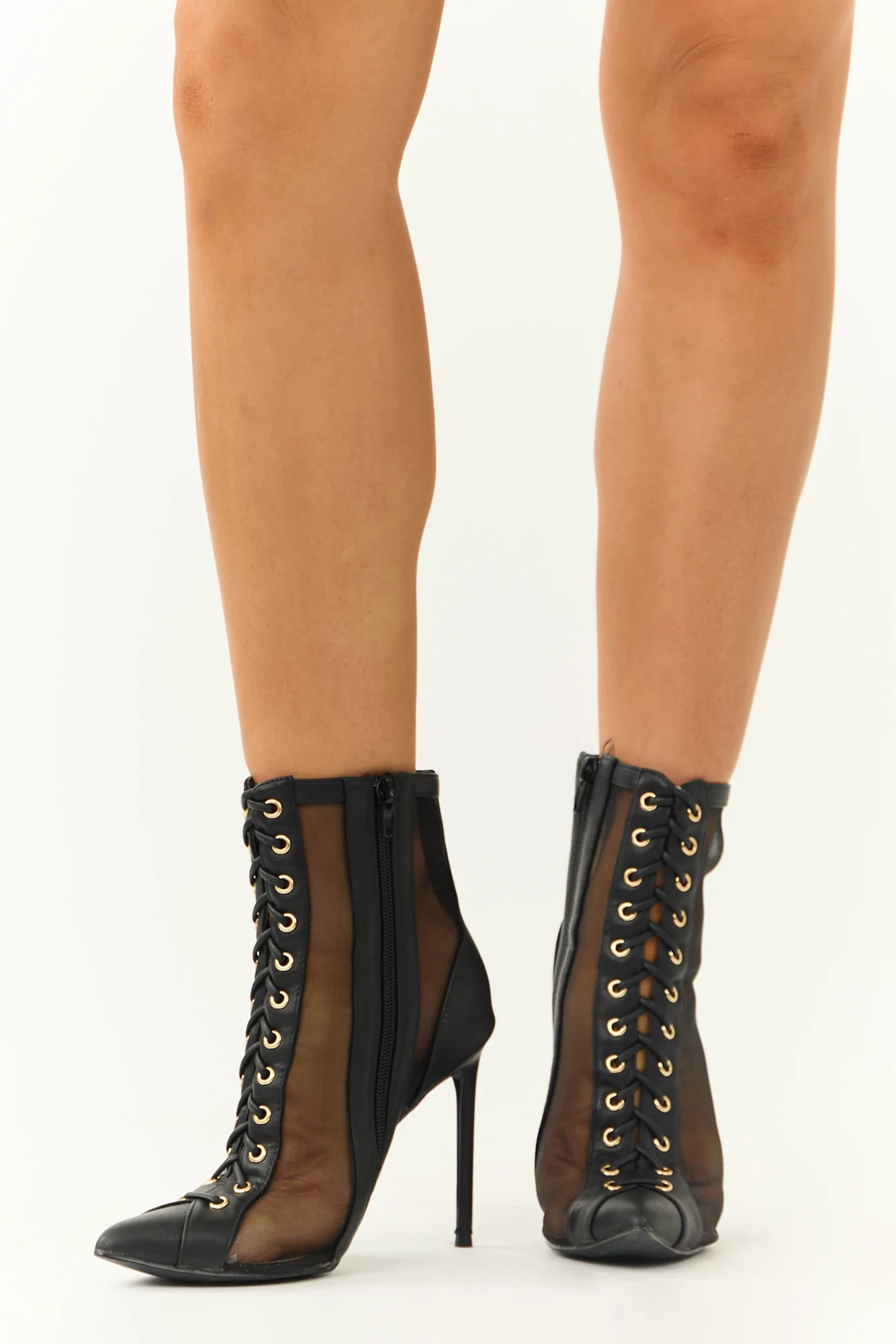 Step up your style with our Black Lace-Up Stiletto Booties. Made from faux leather and featuring a pointed toe, this pair boasts a sleek silhouette. The sheer mesh design adds a touch of allure, while the sky-high heel uplifts your look. These Shin-length booties come with a side zipper for easy wear. The shaft measures 8 inches with a circumference of 10 inches, and the heel stands at 4 inches. Available in sizes 5.5 to 9.