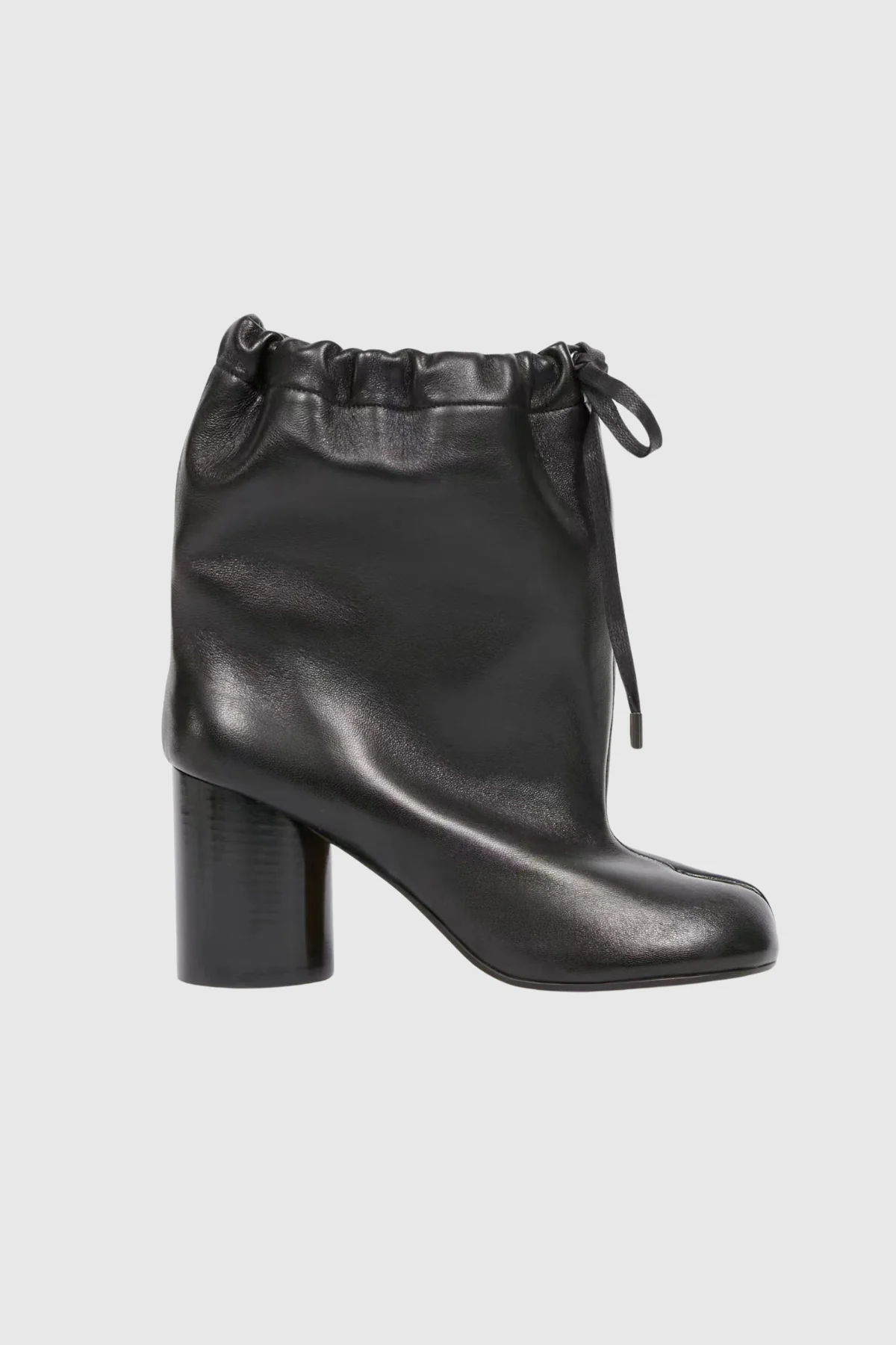 Experience the perfect blend of style and functionality with our black leather drawstring lace-up Tabi boots. These expertly crafted boots feature a unique tabi split toe design for a comfortable fit and a distinctive look. Elevate any outfit with approximately 3.1-inch heels, adding a touch of edge to your wardrobe effortlessly.
