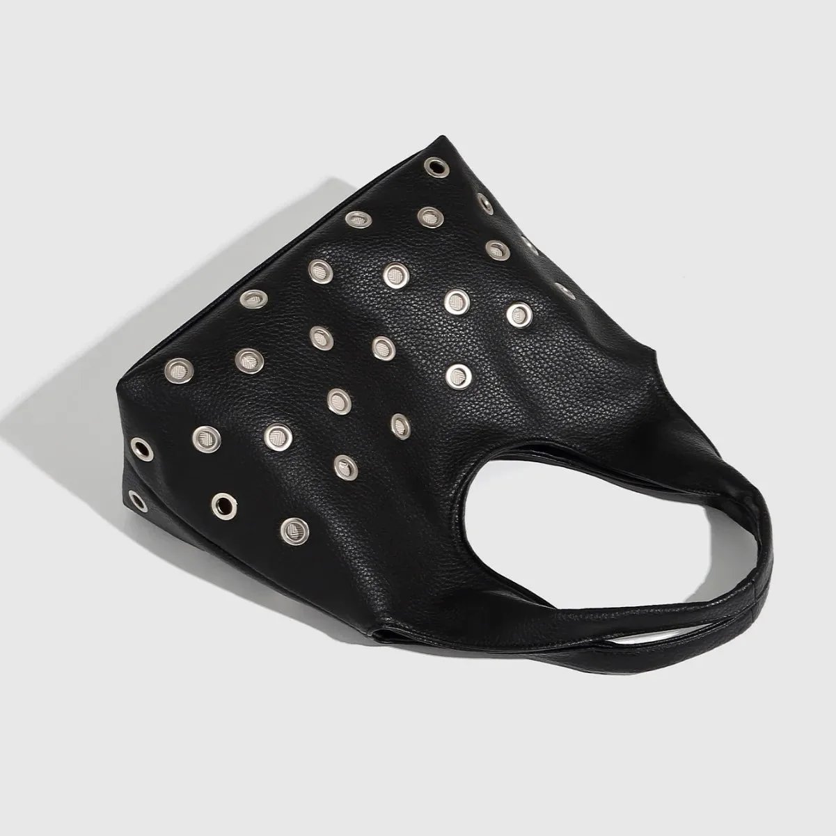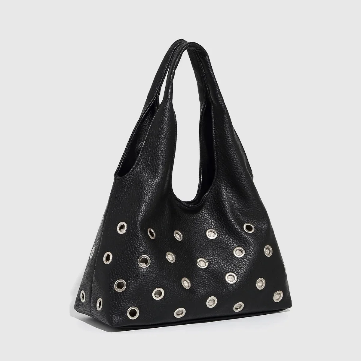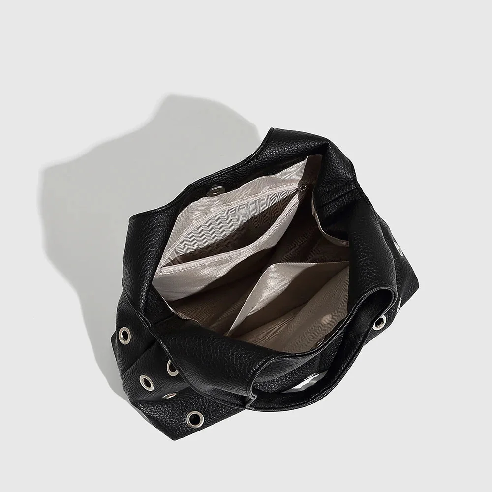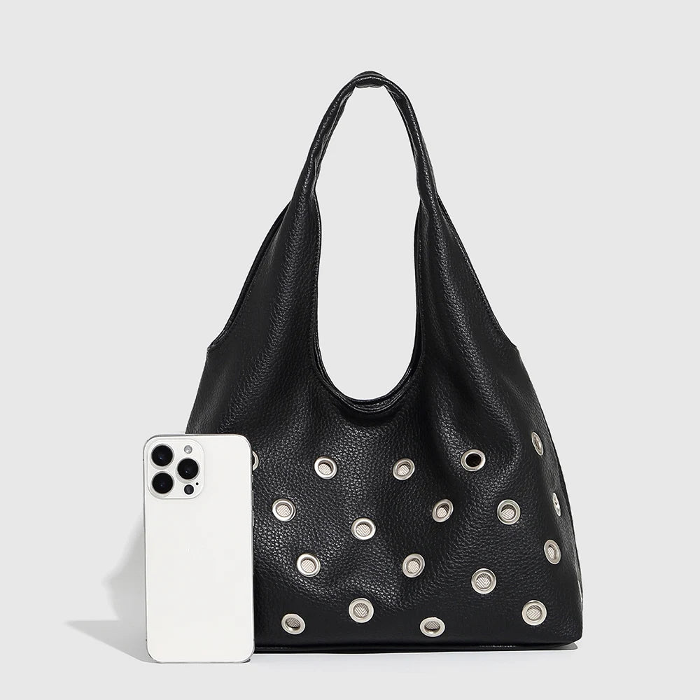 The Black Leather Rivet Shoulder Bag exudes bold style with edgy rivet details and a sleek, modern silhouette. Crafted for durability, it offers both strength and enduring wear, with a spacious interior to effortlessly hold all your essentials. The versatile shoulder strap ensures comfortable use for daily activities or evening outings. This statement piece complements streetwear and rock-inspired outfits, blending attitude with practicality. Dimensions: L – 31 cm / 12.2 inch, W – 14 cm / 5.5 inch, H – 20 cm / 7.9 inch. Discover more fashion inspiration on Instagram @mermaidway.