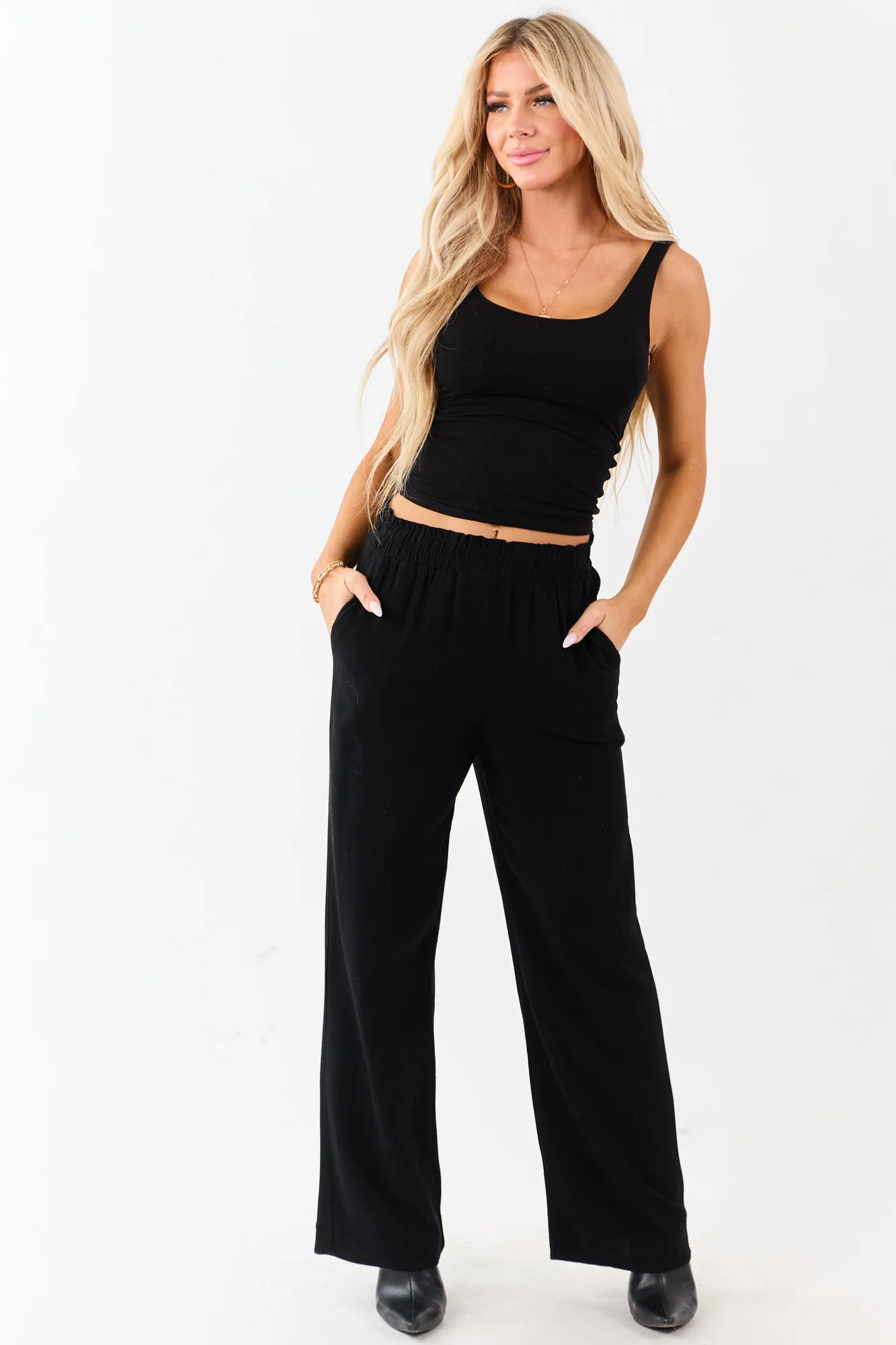 These black linen wide leg pants with a smocked waistband offer a soft, airy, and flattering fit. The stretchy waistband ensures a perfect fit while the high-waisted design provides comfort and style. Featuring side pockets and a 27.5″ inseam, these pants are ideal for a chic and comfortable ensemble. Made of 70% rayon and 30% linen. Imported. Available in sizes XS to XL.