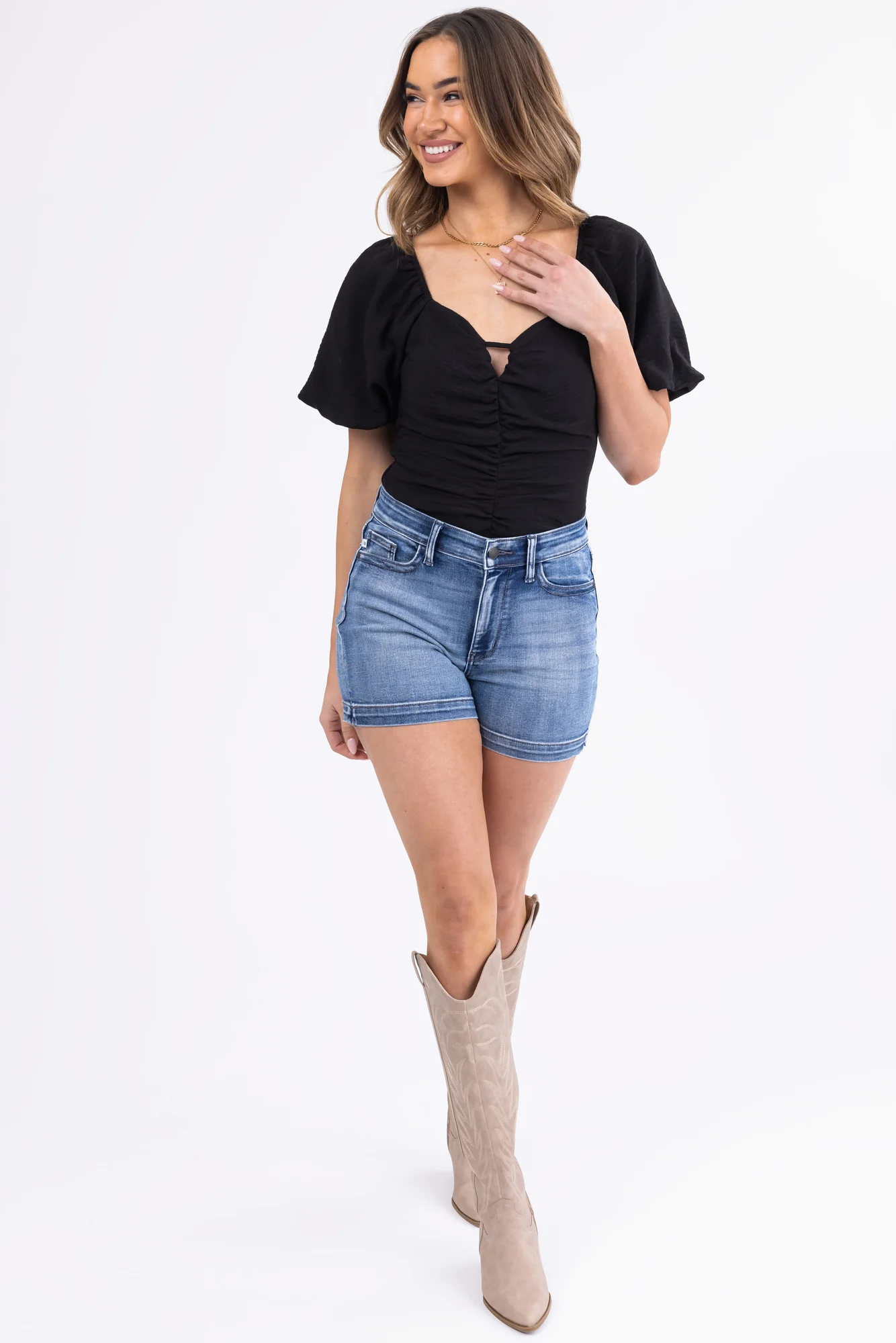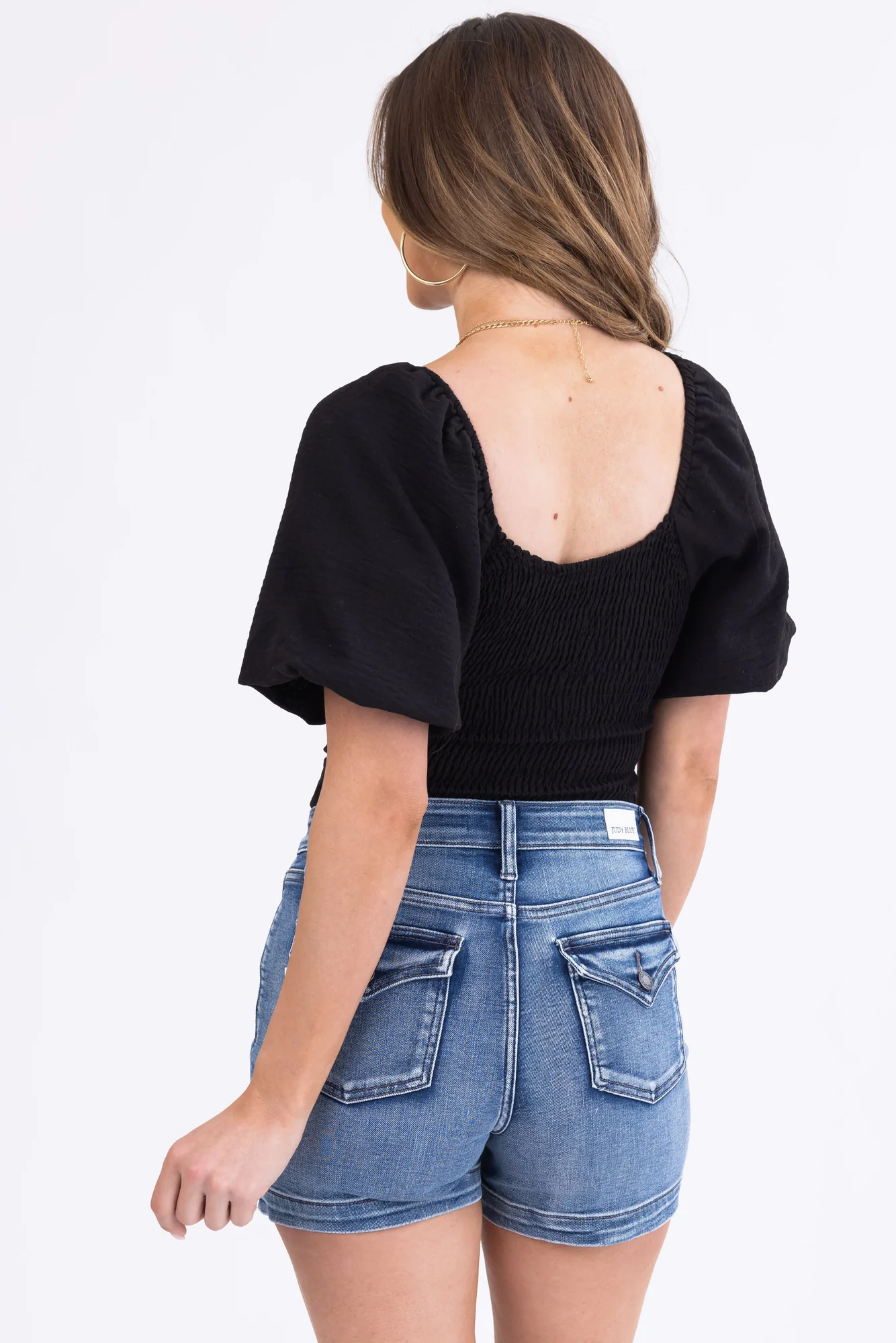 This black bodysuit features trendy puff sleeves, a flattering sweetheart neckline with a cut-out detail, and a stretchy smocked back for a comfortable fit. Made from a blend of linen and polyester-rayon, it offers a non-stretchy bodice and a stretchy knit bottom. Perfect for a variety of occasions, this bodysuit showcases short puff sleeves, elastic cuffs and shoulders, and a thong cut design. Imported and lined at the front, this final sale item requires cold hand washing. Model is wearing size Small (Height: 59″, Bust: 34″, Waist: 28″).