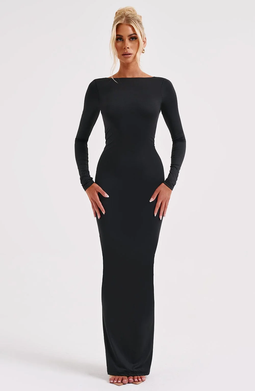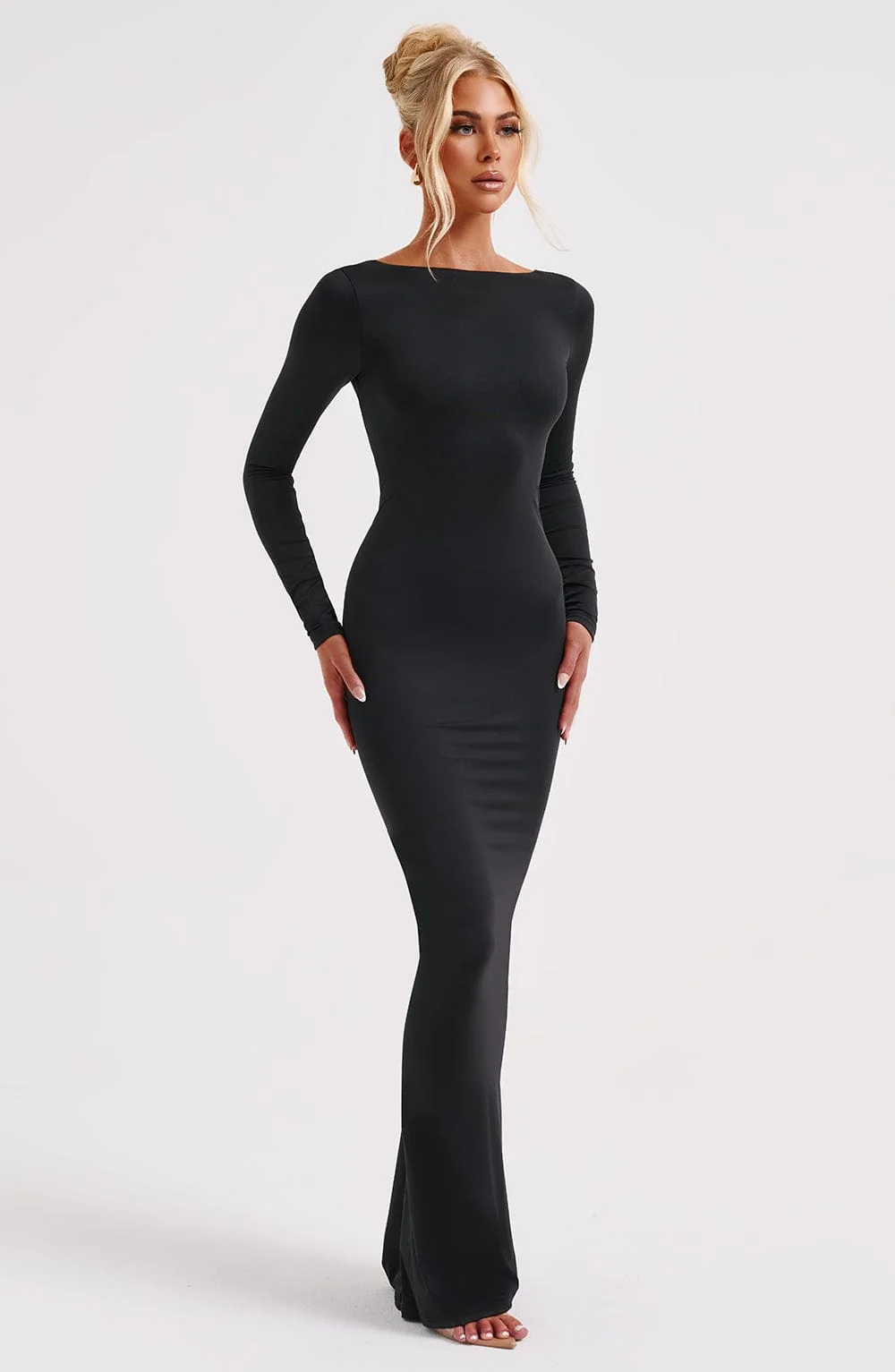 Discover the iconic Rameesha Black Maxi Dress, tailored for party seasons. Crafted from premium double stretch jersey with a figure-hugging silhouette, high neckline, and a stunning low plunge back. The perfect attire for elegant evenings or special occasions. Available in sizes XS to XXL.
