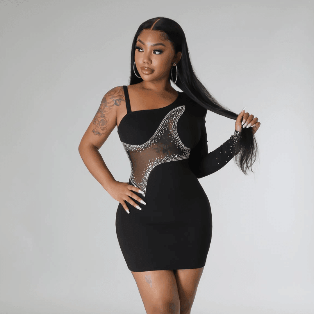 Elevate your style with our Black Mesh Bandage Mini Dress. This stunning dress features a sleek mesh design and a flattering bandage fit. Crafted from high-quality materials, it enhances your figure while ensuring maximum comfort. The Black Mesh Bandage Mini Dress is perfect for any event, offering a chic look for a night out or a special occasion. The unique mesh detailing adds a touch of elegance, making it stand out in any crowd. For an effortlessly glamorous ensemble, pair it with our Showstopper Double Bow Crystal Embellished Heels. Shop now to make a bold statement and showcase your impeccable taste in fashion! Additionally, you can explore more style ideas and inspiration on Instagram @mermaid_way. FEATURES: Semi-stretch dress, One shoulder, Long sleeves, Rhinestones, Sheer details, Side zipper closure. MATERIAL: 96% polyester / 4% spandex. If you are not completely satisfied with your purchase, we offer a free replacement. Alternatively, we can contribute to a local tailoring service for the perfect fit.