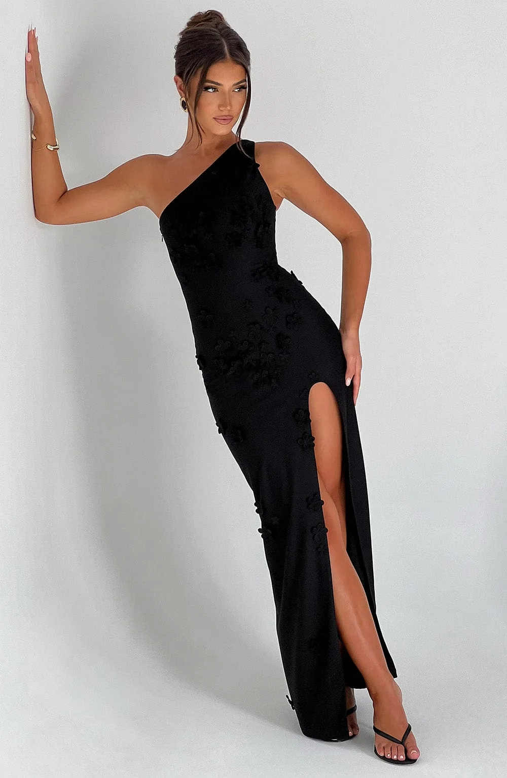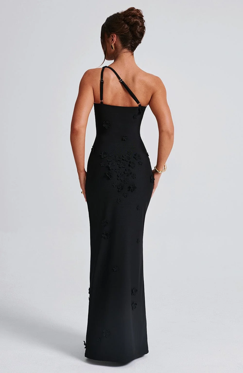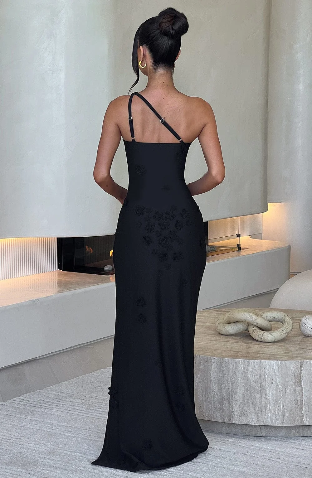 Indulge in the dreamy softness of our one-of-a-kind Black Mesh Maxi Dress adorned with playful 3D flower appliques. This elegant dress features an asymmetric one-shoulder neckline, adjustable straps, thigh-high split, and a flattering fit-and-flare silhouette that accentuates your curves. Expertly crafted from premium stretch mesh for a second-skin fit, this dress is perfect for special occasions. Fully lined for comfort and style. Embrace the enchantment of the Cynthia Maxi Dress in Black.