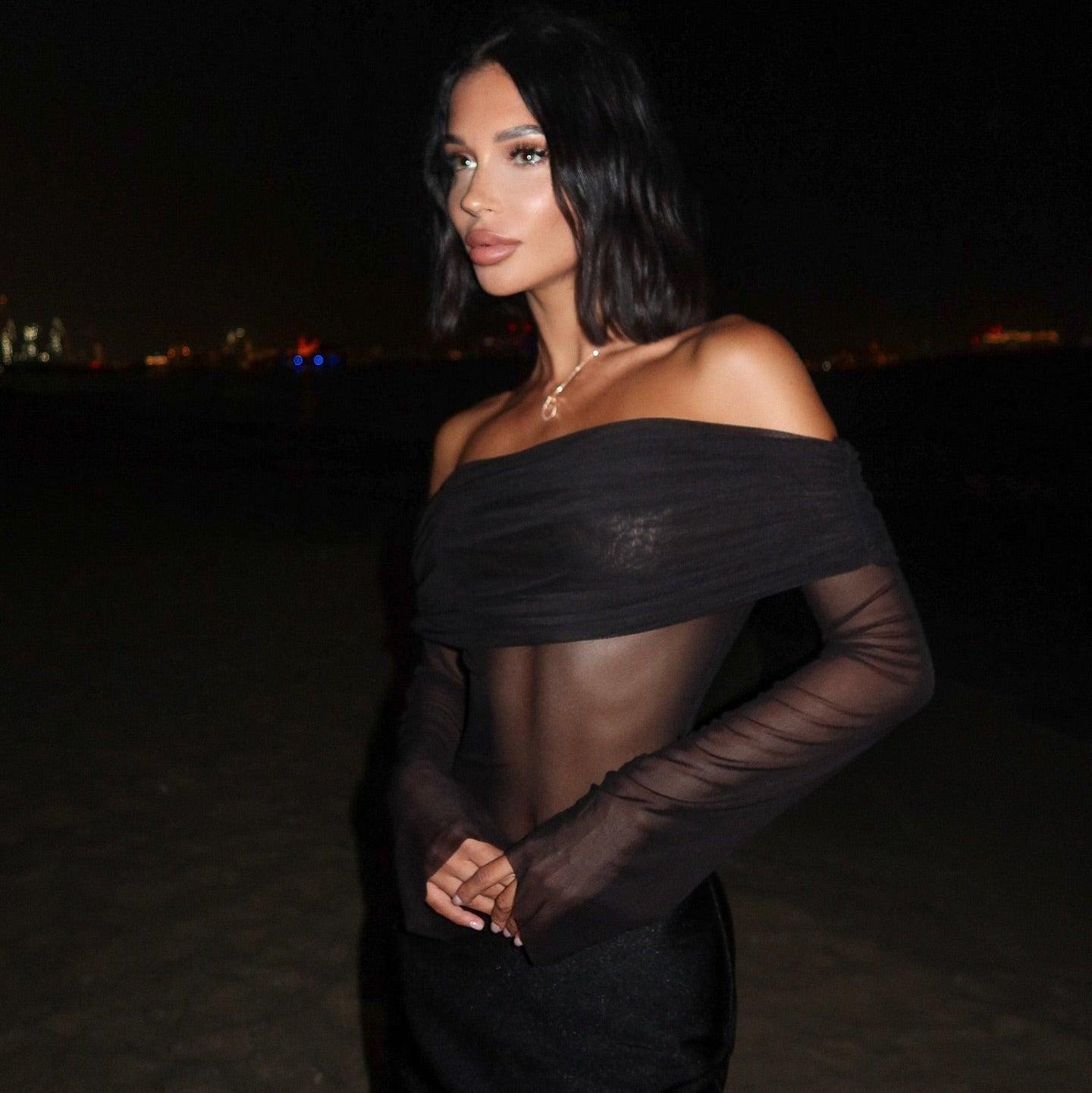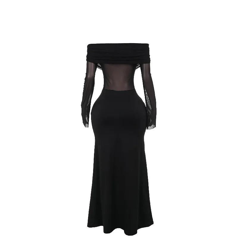 Indulge in the captivating allure of the Black Mesh Off Shoulder Maxi Dress. Crafted in elegant black, this dress features a blend of sheer mesh intricacies and a form-fitting silhouette. The off-shoulder neckline accentuates your collarbones, while the long mesh sleeves exude sophistication. A semi-transparent bodice creates a tantalizing contrast, leading to a fitted waist that gracefully transitions into a floor-length skirt. Ideal for galas, evening affairs, or intimate dinners, this dress promises an unforgettable impression. Showcase your curves elegantly with the mesh and opaque fabric interplay. Complete your look with striking earrings and chic heels for a polished ensemble. Explore styling tips and new collections on our Instagram @mermaid_way. Size exchange available if needed.