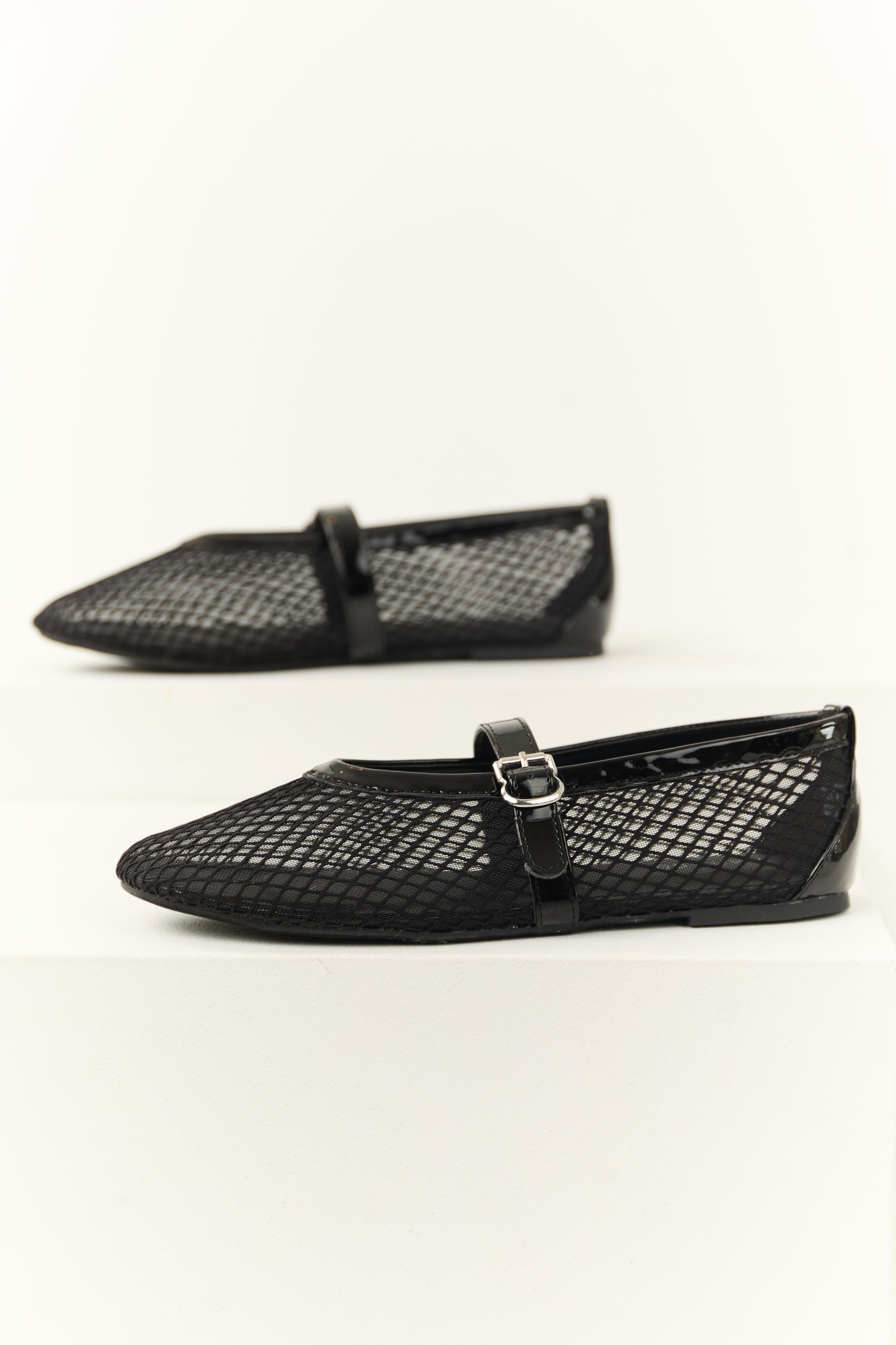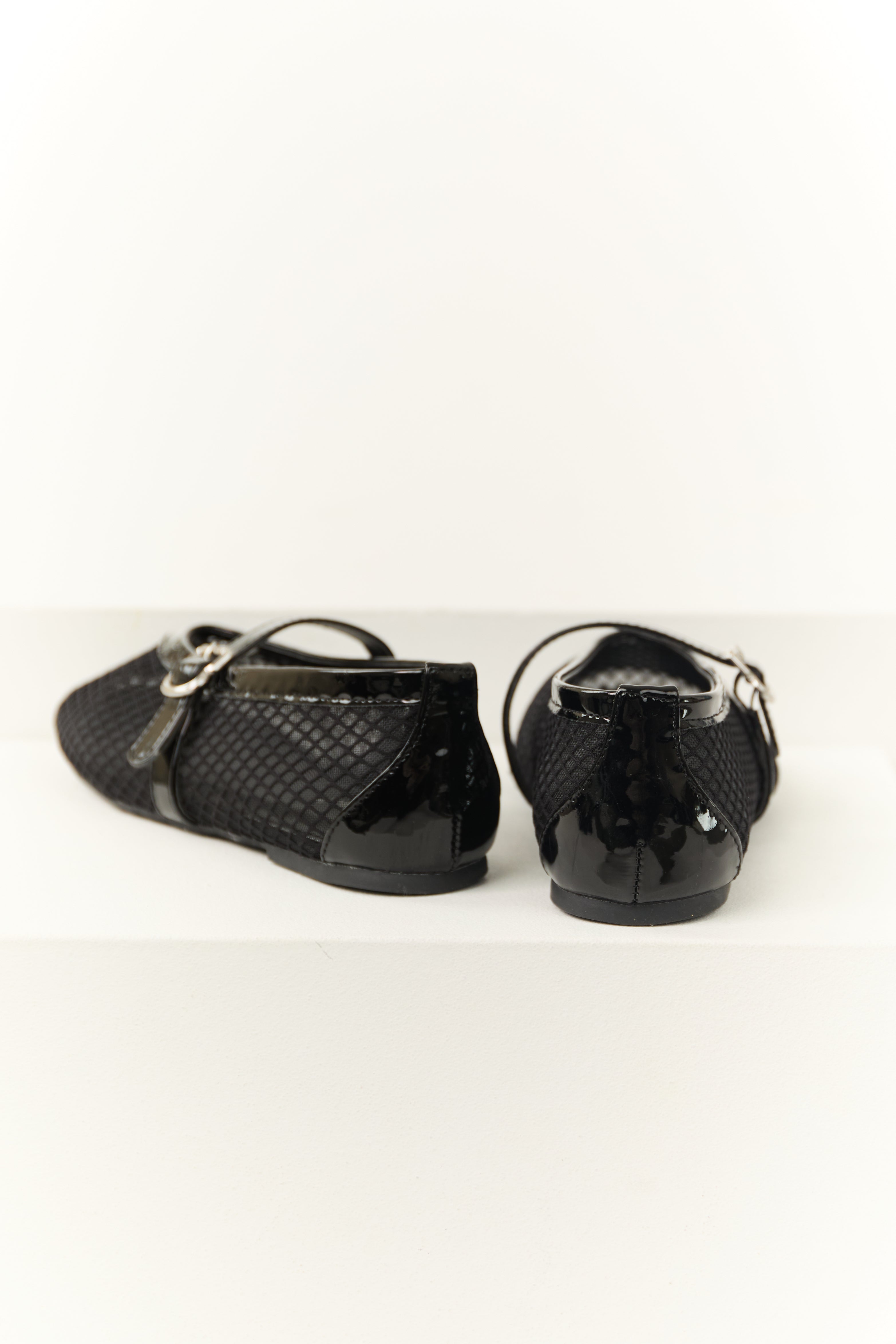 Step out in style with these black flats featuring a unique geometric mesh design. Made of non-stretchy patent faux leather, these flats offer a perfect blend of comfort and fashion. The adjustable buckle strap and slightly cushioned insole add extra flair to your everyday look. These flats are perfect for casual or daytime outings, with a circumference of 14 inches. Imported product available in sizes ranging from 5.5 to 10.
