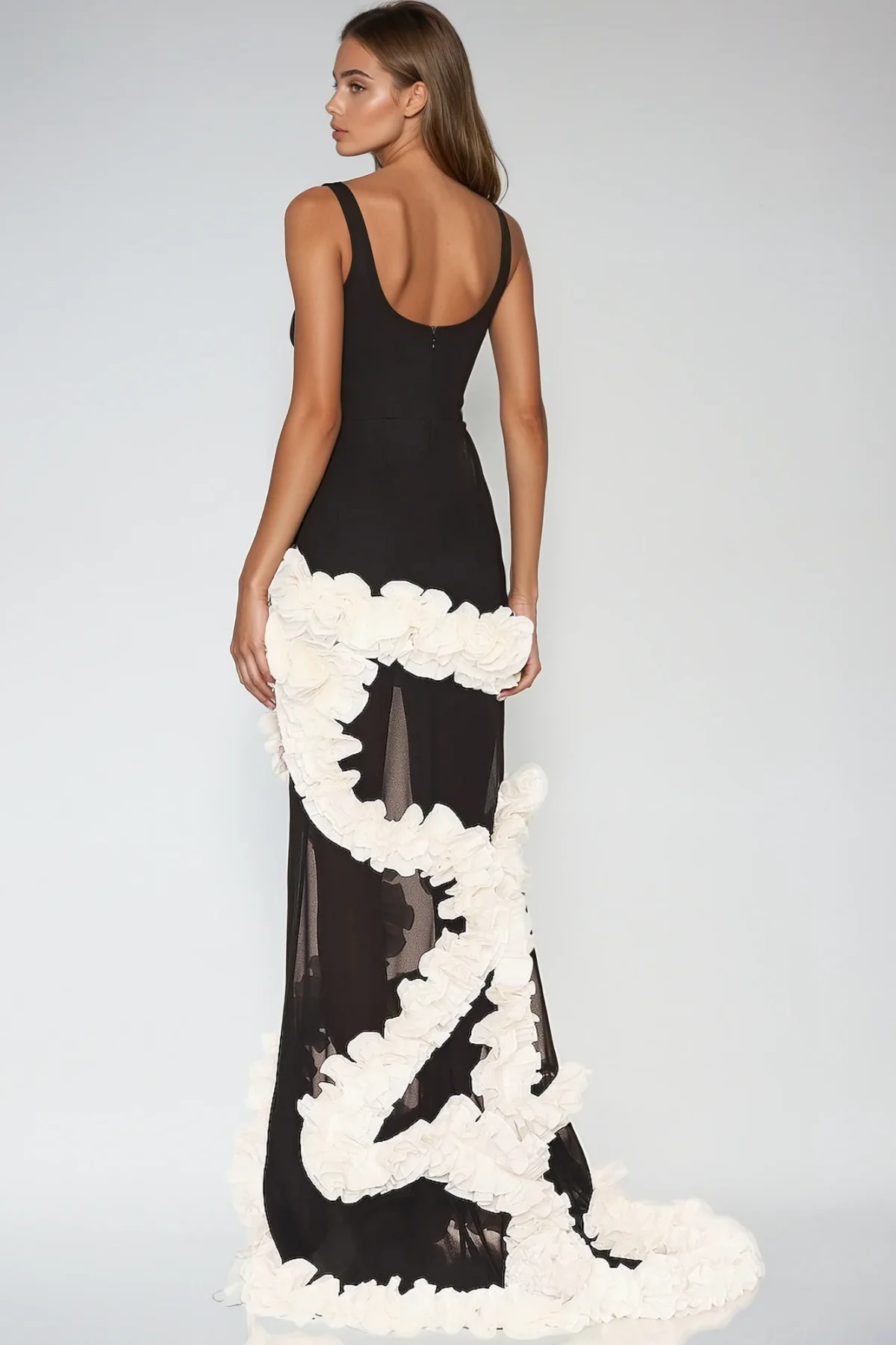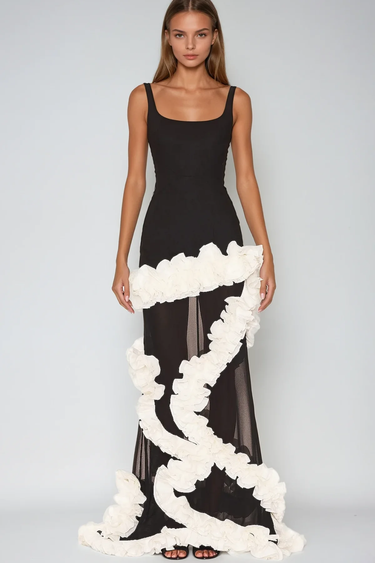 Indulge in elegance and style wearing the Black Mesh Ruffle Asymmetric Maxi Dress. This stunning dress features a captivating design merging mesh and ruffles, ideal for any event. The asymmetrical silhouette exudes modern sophistication, while the maxi length ensures a flattering look. Elevate your wardrobe with this essential piece. Crafted from a blend of 50% Polyester and 50% Cotton, this dress offers a slight stretch for comfort. Care instructions: Machine wash gently. Please note, color variations may occur due to lighting differences in images.