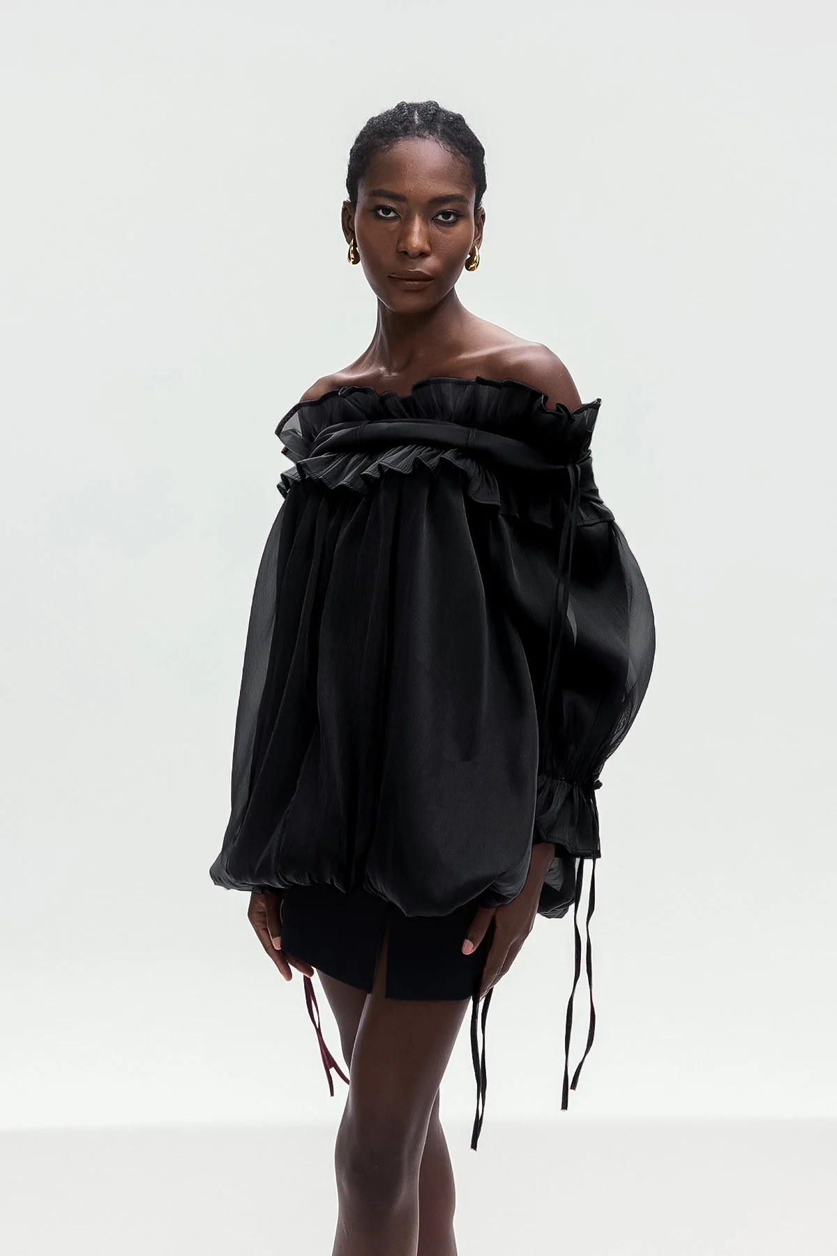 Elevate your style with the Black Mesh Ruffle Off Shoulder Top . This chic top combines trendiness with sophistication, featuring an off-shoulder design for a playful touch and a mesh ruffle detail for elegance. Crafted from high-quality materials, this comfortable and stylish top is a must-have in your wardrobe. Make a fashion statement with this versatile piece that is perfect for any occasion. Please note that the color may vary slightly due to lighting effects in images. Experience luxury and grace with this top! Stretch Factor: Non-Stretch. Care Instructions: Gentle machine wash.