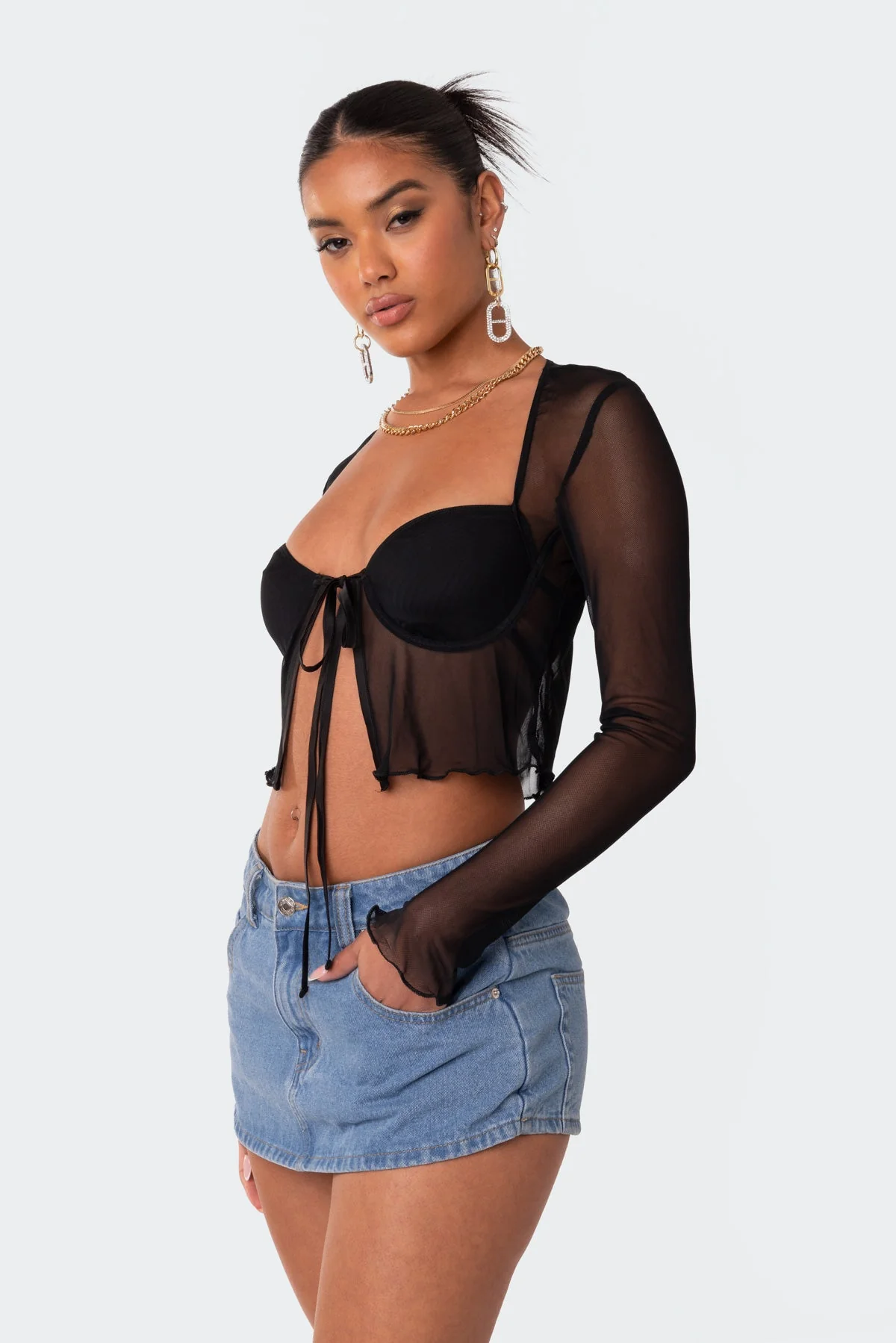 This stunning Black Mesh Tie Front Corset Top features a cupped construction, long sleeves, and a charming tie front closure. Made from high-quality sheer mesh fabric with a lovely lettuce hem, this top exudes elegance and style. Perfect for a night out or special occasion. Easy to care for, just wash with similar colors. Elevate your wardrobe with this trendy piece today!