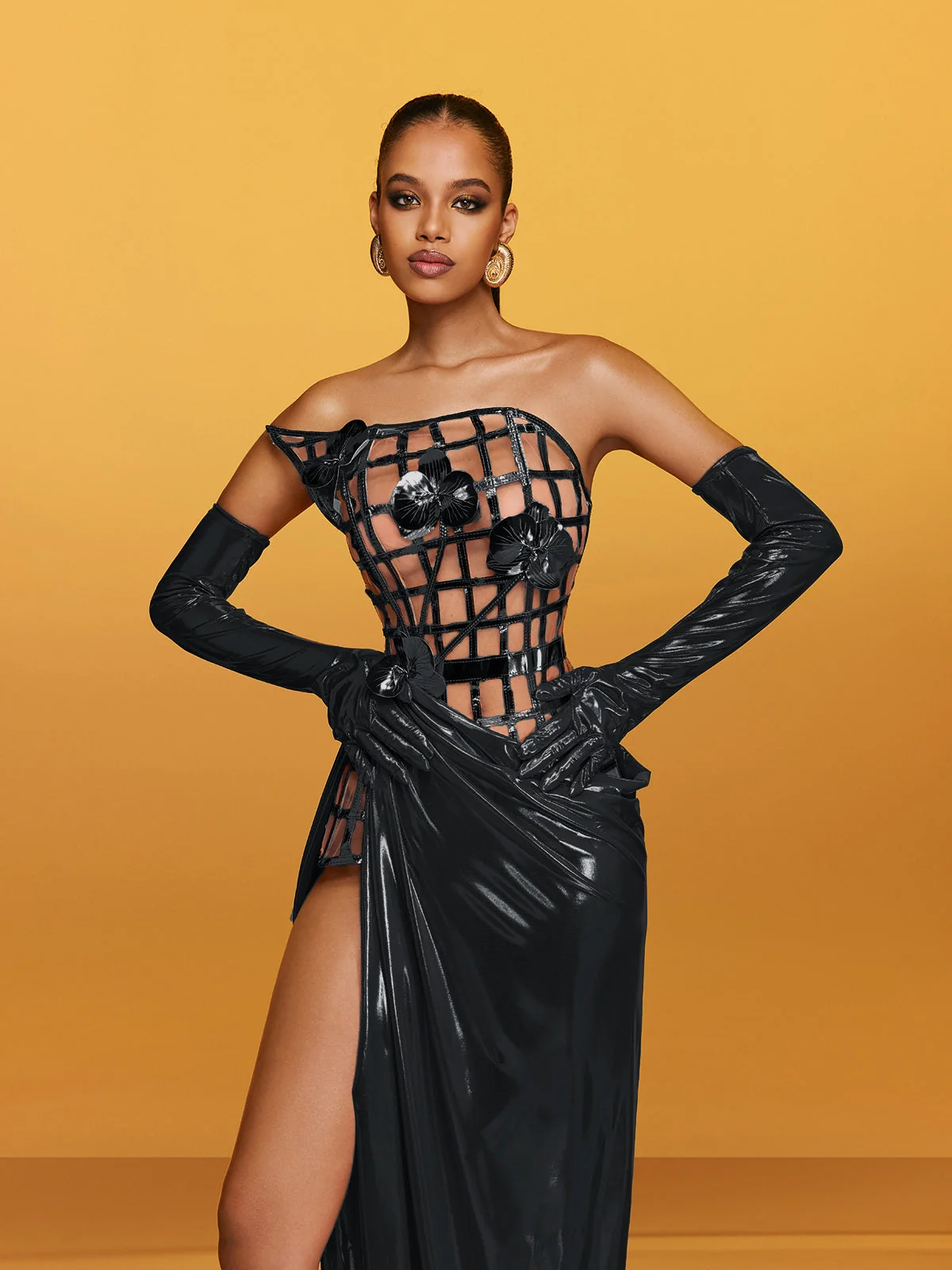 Tags: black dress, Evening gown, maxi dress, Metallic Floral Dress, strapless dress