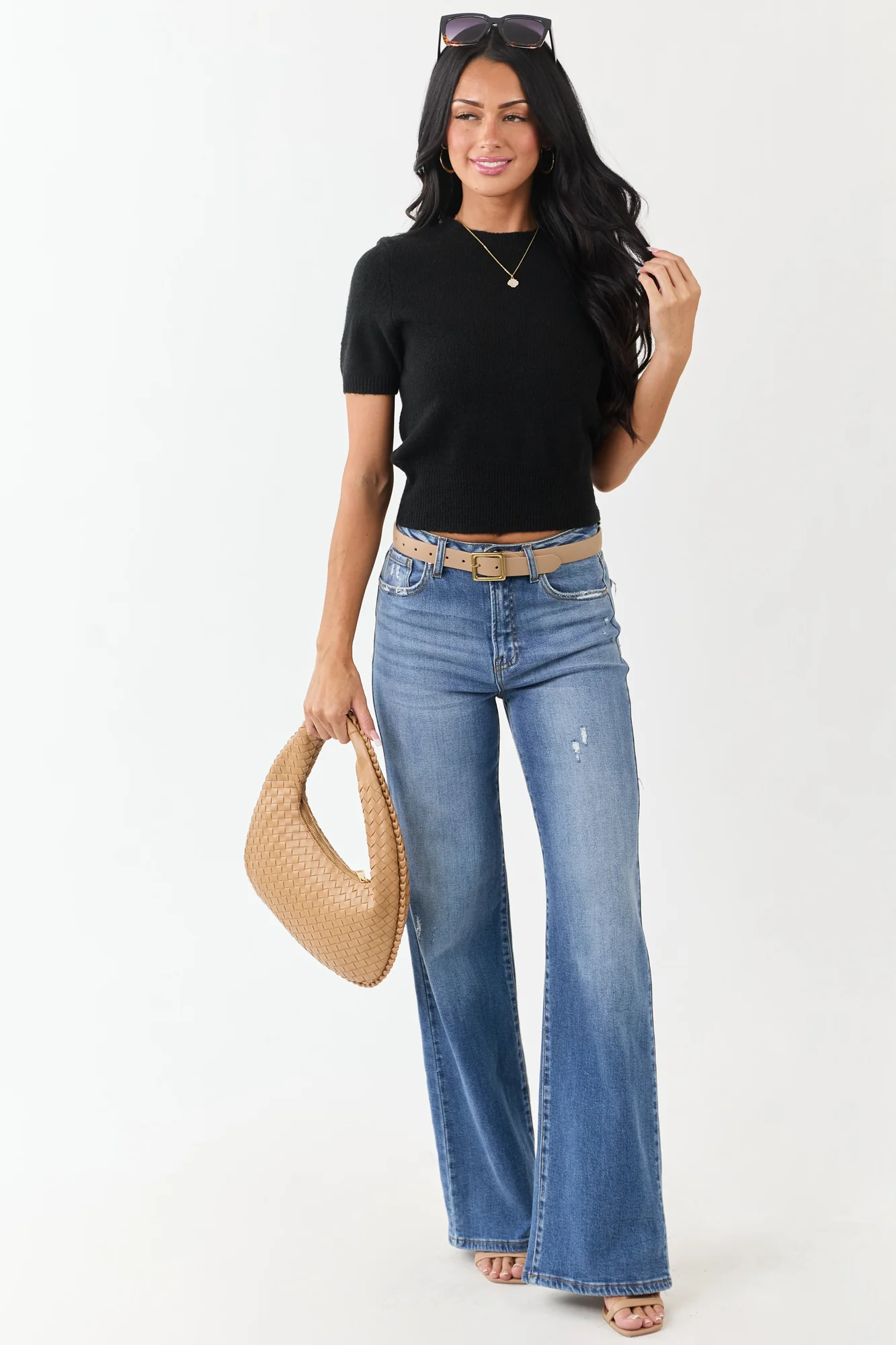 Elevate your style effortlessly with this timeless black mid-length knit sweater top. Perfect for layering or solo wear, featuring a stretchy soft knit with banded trim for a sleek look. Made of 72% Acrylic, 25% Polyester, 3% Spandex. Available in sizes S, M, and L. Imported.