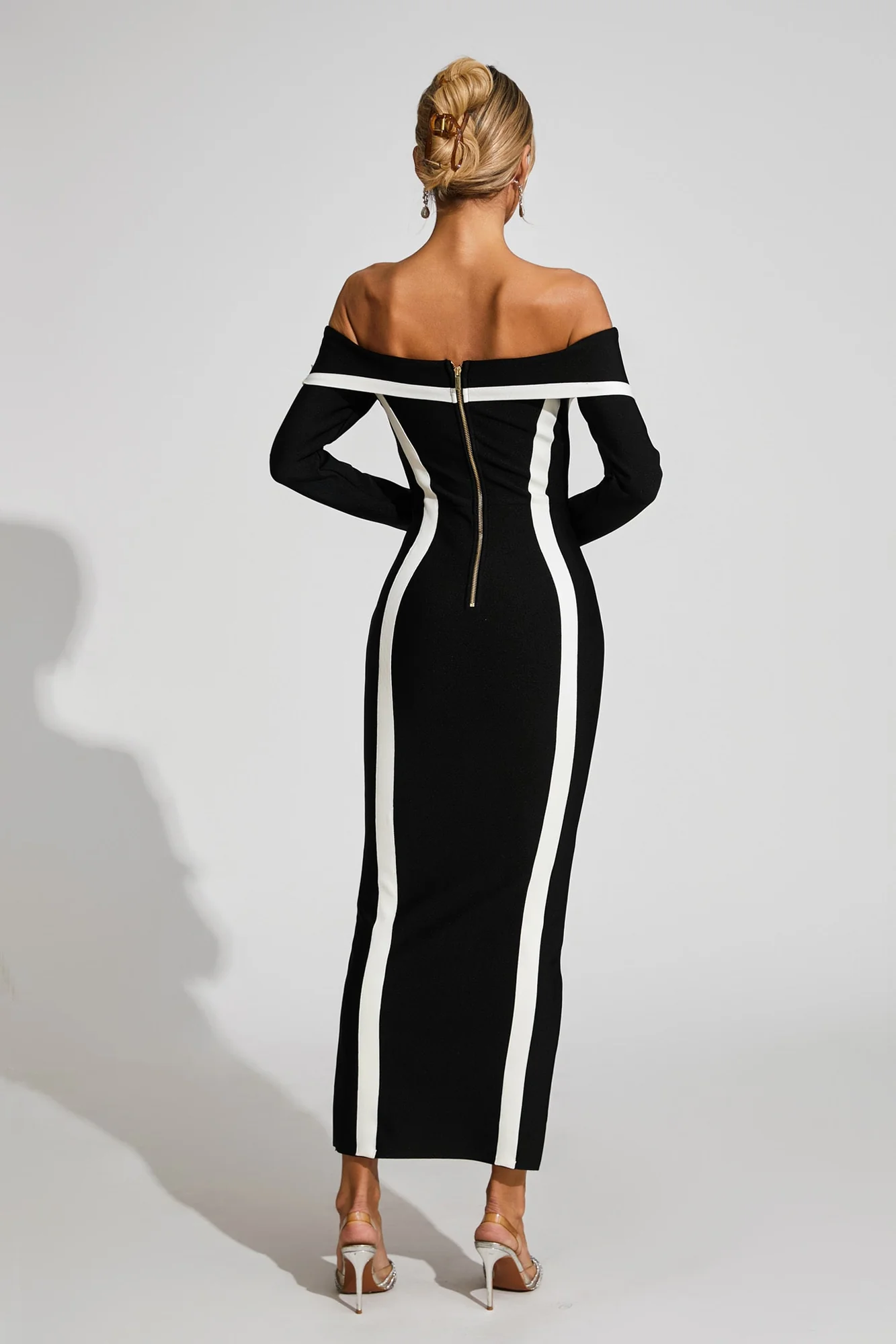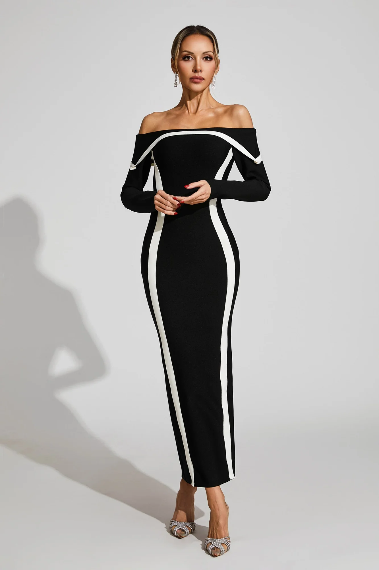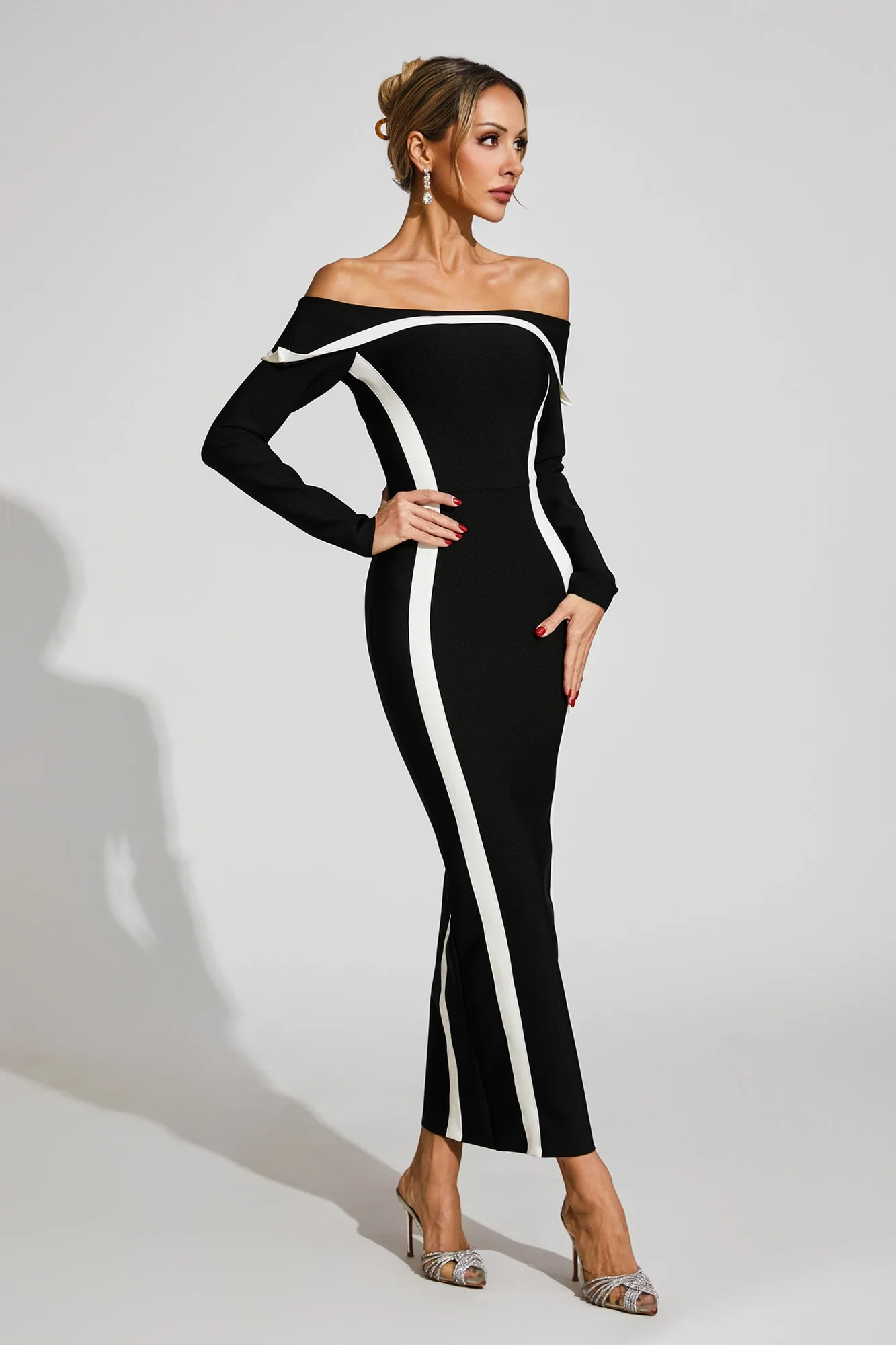 Indulge in the elegance and sensuality of the Black Off-Shoulder Bandage Maxi Dress. This stunning evening dress features an off-shoulder design, long sleeves, and a figure-flattering silhouette. Crafted from premium bandage fabric, this dress is perfect for a classy affair. Elevate your style with this bodycon dress that exudes sophistication and charm. Dress Length Approximately 120cm. Care: Gentle Dry Clean Only. Model height: 5 ft 7 in, wearing size S. Color may vary due to lighting. Refer to the size chart for the best fit.
