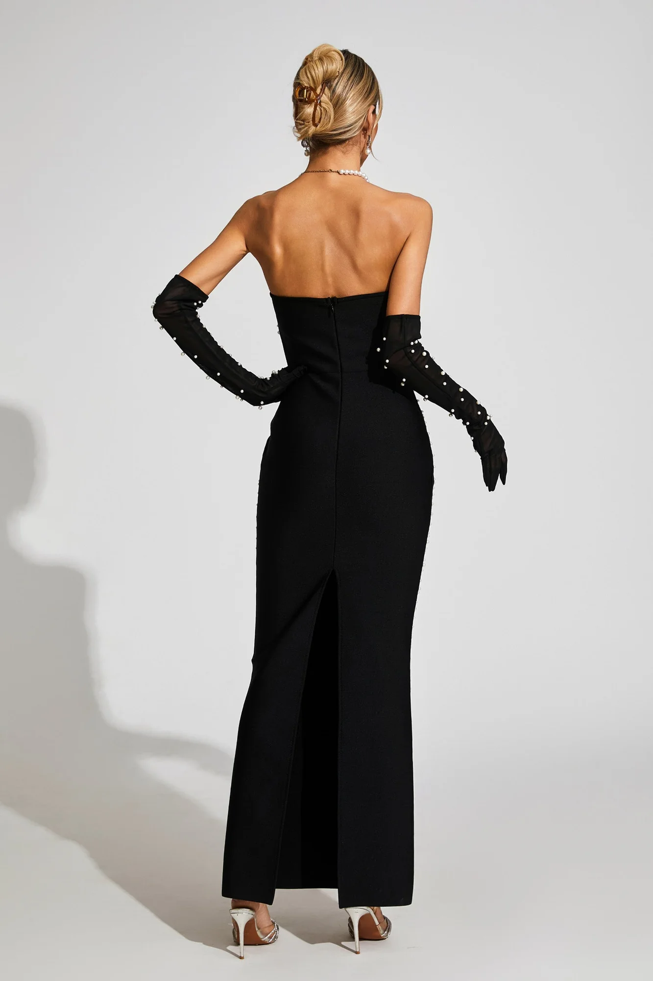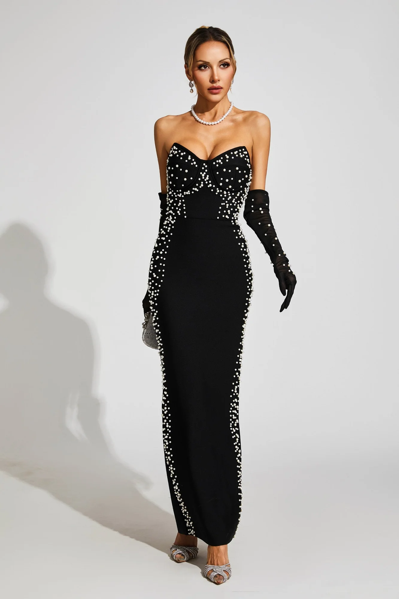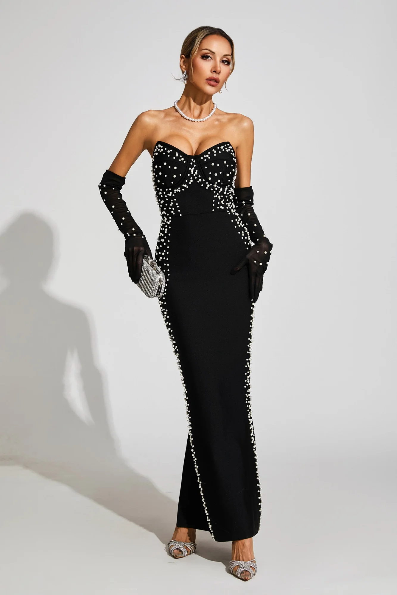Step into sophistication and charm with the Black Off-Shoulder Pearl Embellished Bandage Maxi Dress. This elegant gown features a stylish off-shoulder design accented with exquisite pearls, reflecting the essence of a classy socialite. Complement your ensemble with chic black gloves for a glamorous flair. Dress Length is approximately 120cm. Care Instructions: Dry clean gently. The model is 5 ft 7 and wears size S. Please note that the color may slightly vary due to lighting effects. The product images (excluding model) offer a true representation of the items color. The sizing runs true to our size chart, ensuring a perfect fit. Please consult our size chart for accurate sizing guidance. Avoid sizing up or down for the best fit.