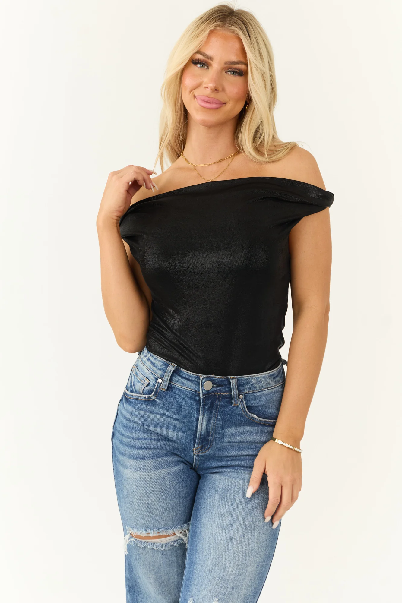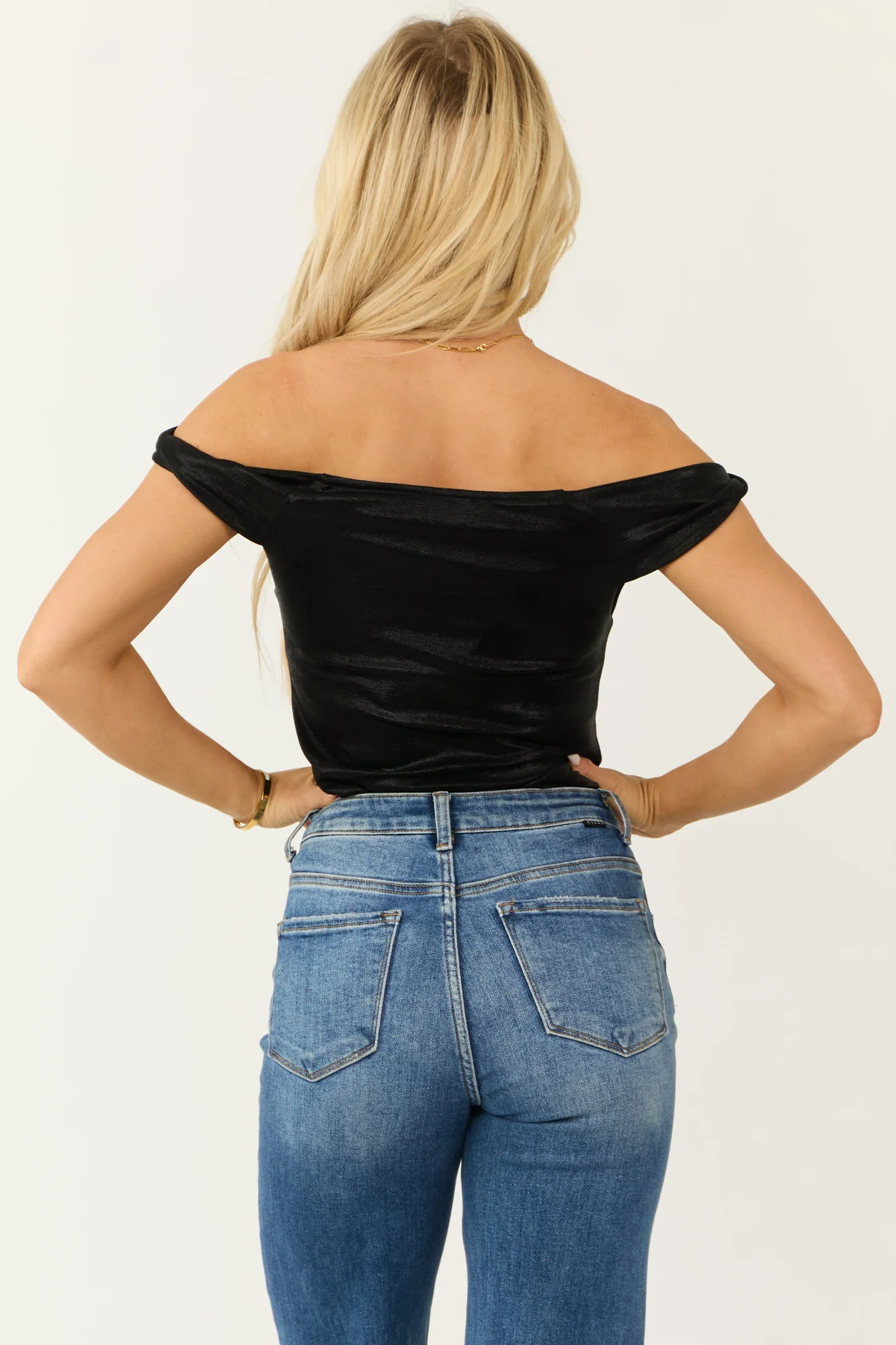 Indulge in the chic styling of our Black Off-the-Shoulder Knit Bodysuit with a subtle shimmer touch. Crafted from a stretchy knit fabric for a perfect fit, this bodysuit features short twist sleeves, a cheeky cut, and a double snap closure for convenience. Stay effortlessly trendy in this must-have piece that blends comfort with sophistication. Self: 95% Polyester, 5% Spandex. Imported. Hand wash cold, line dry. Iron on low if needed. Model is wearing a size Small. Model’s Profile: Size 1, Height 57″, Bust 34″, Waist 26″