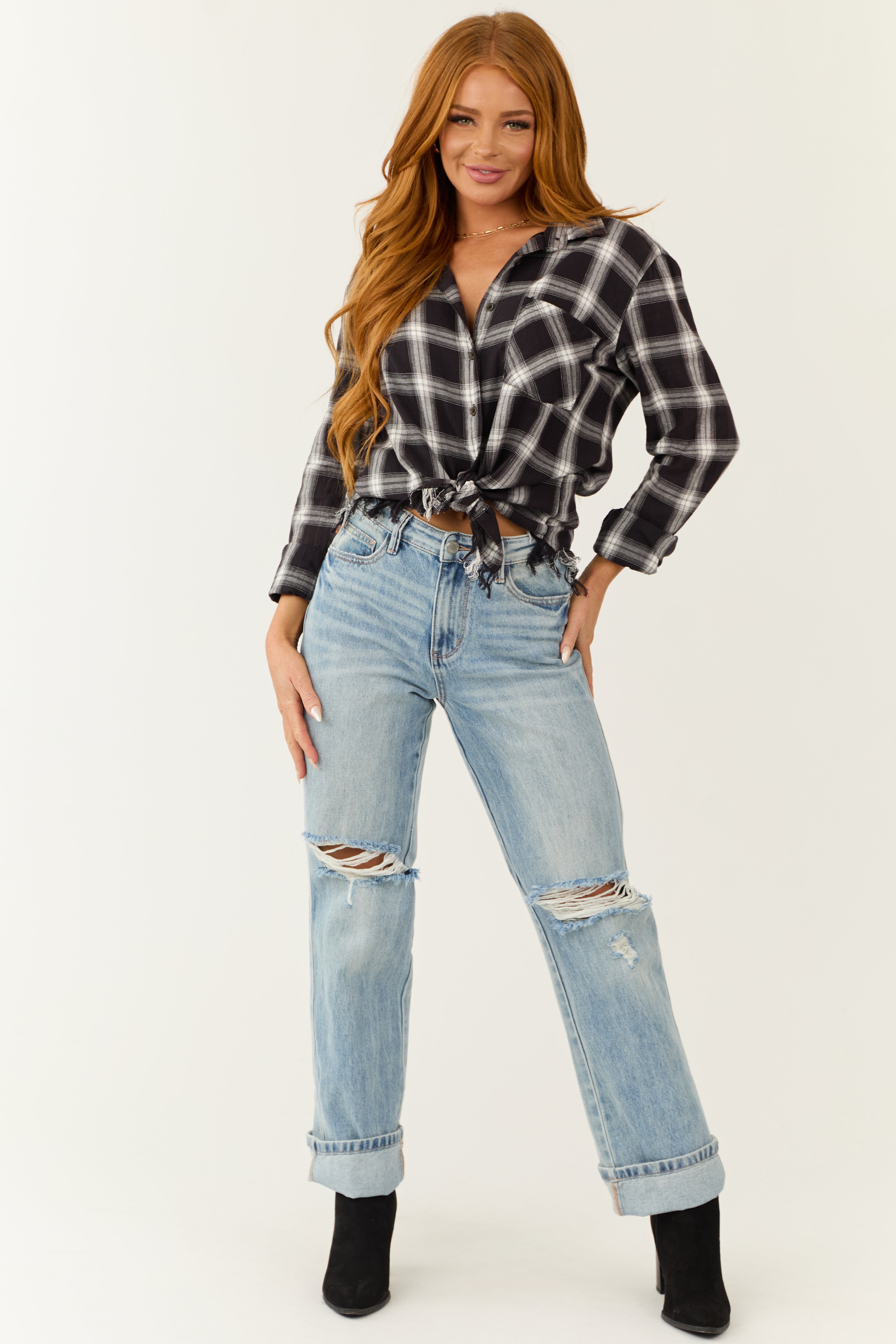 This Black Off-White Plaid Button-Down Shirt offers a classic yet stylish look for any occasion. Made from non-stretchy woven 100% Cotton, it features a frayed hem, banded button cuffs, and subtle bleach wash fading. The collared design with a chest pocket and button-down front adds versatility to this wardrobe essential. Whether for daytime outings or casual events, this shirt exudes charm and comfort. Care Instructions: Hand wash cold, drip dry, avoid bleach, iron on low. Model is wearing a size Small. Model’s Profile: Size 1, Height 55″, Bust 33″, Waist 24″.