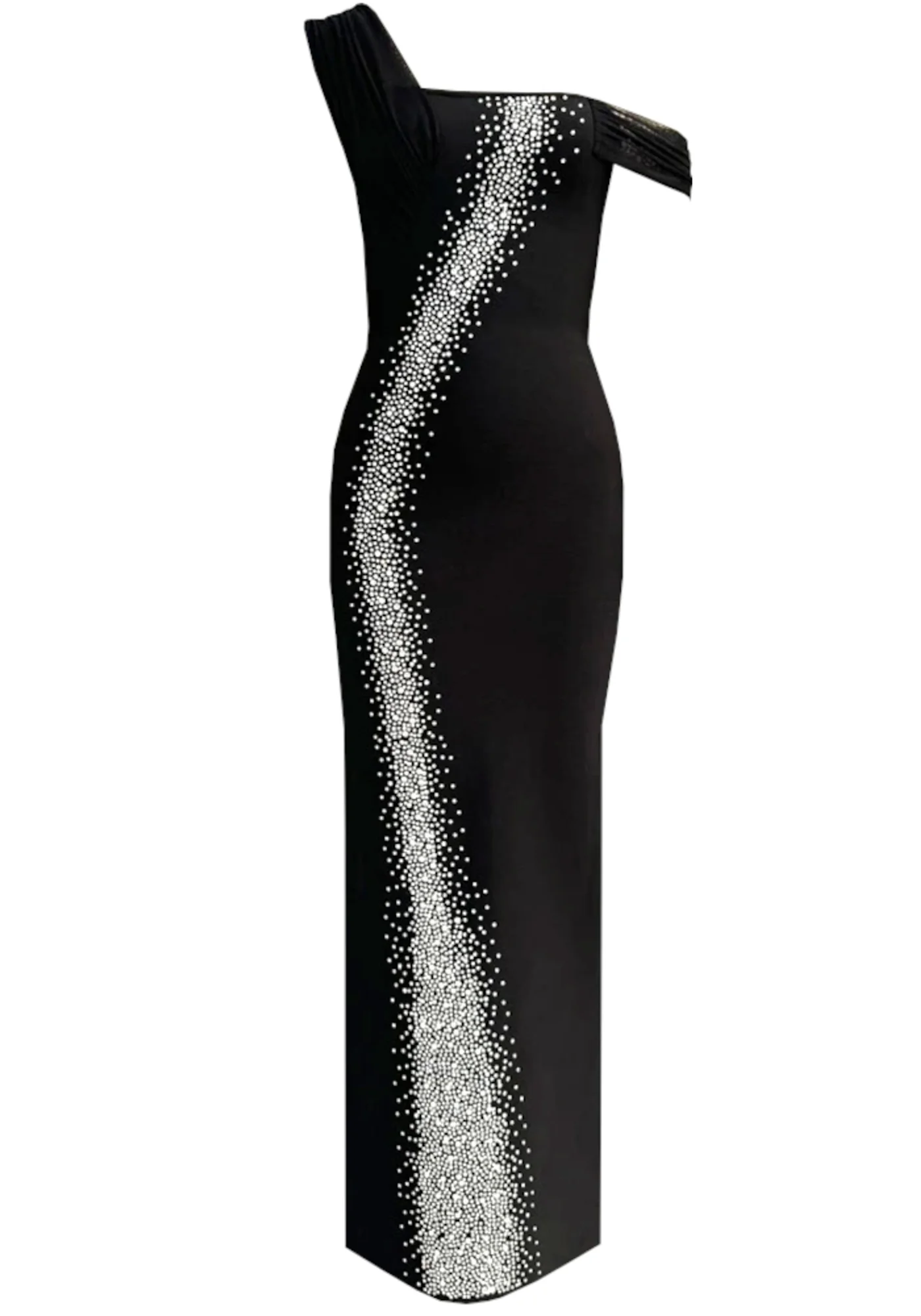 Indulge in the sophistication of the Black One Shoulder Crystal Maxi Dress. This stunning dress features a black hue, one-shoulder design, sleeveless style, mesh insert, and draped bardot detail adorned with exquisite rhinestones for a touch of glamour. Crafted from a blend of 90% Rayon, 9% Nylon, and 1% Spandex, this dress offers top-quality, anti-wrinkle fabric with vibrant colors. The high elasticity ensures a comfortable and flattering fit. Complete with a YKK zipper for durability. Carefully crafted for elegance and durability, this dress is perfect for special occasions. Please note that actual color may vary based on lighting. Gentle dry clean recommended.