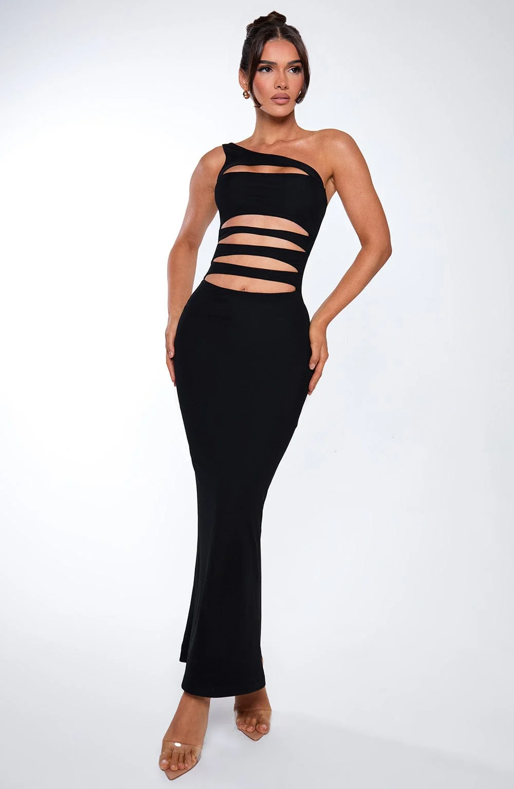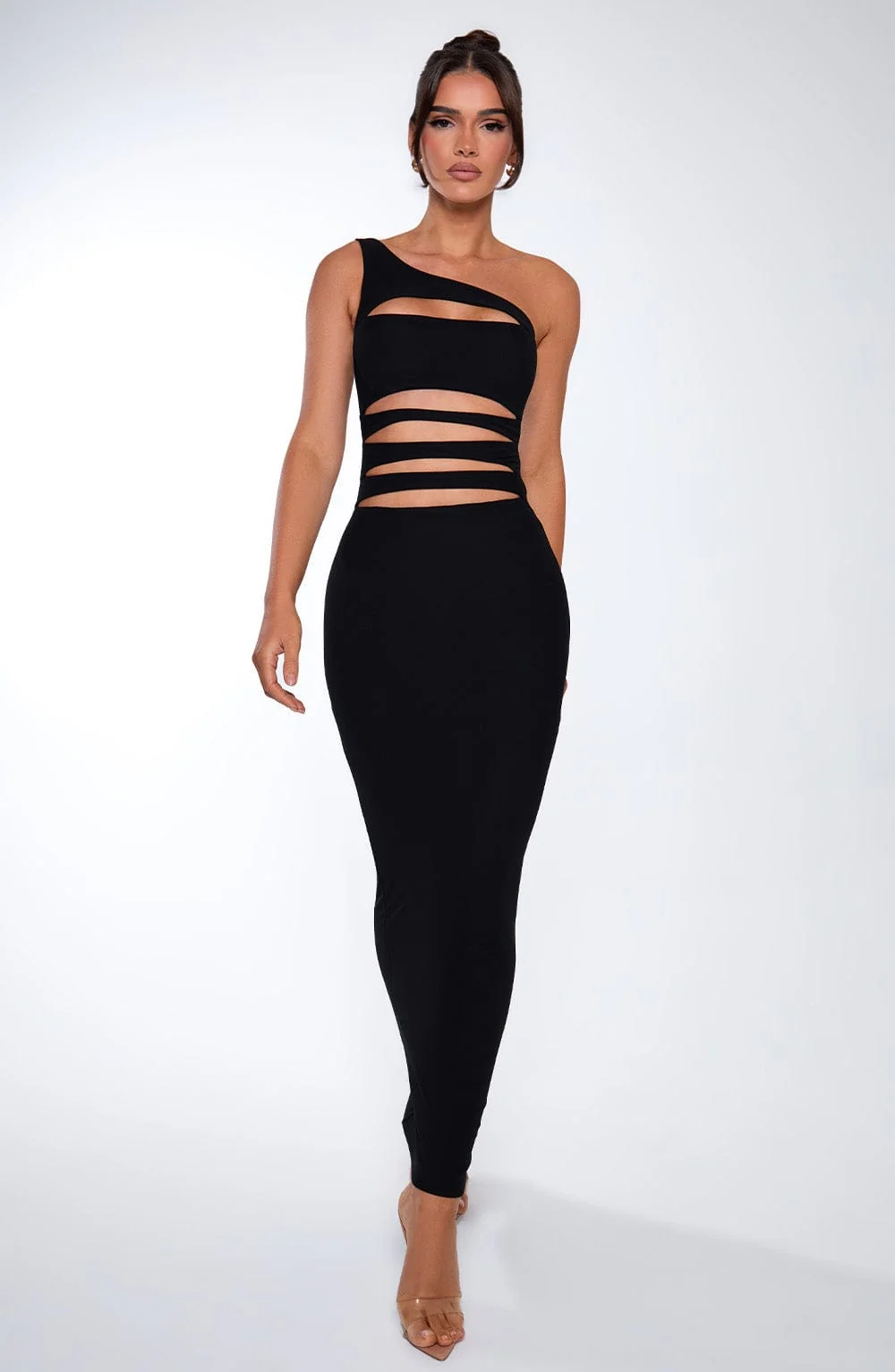 Step into dark romance with our black one shoulder maxi dress made from premium stretch mesh, defining your silhouette with a seductive cut. This fully lined dress features slashed style cut outs, hugging your figure elegantly for a dreamy look. Perfect for evenings, festivals, parties, and more. Model in the picture wears size XS.
