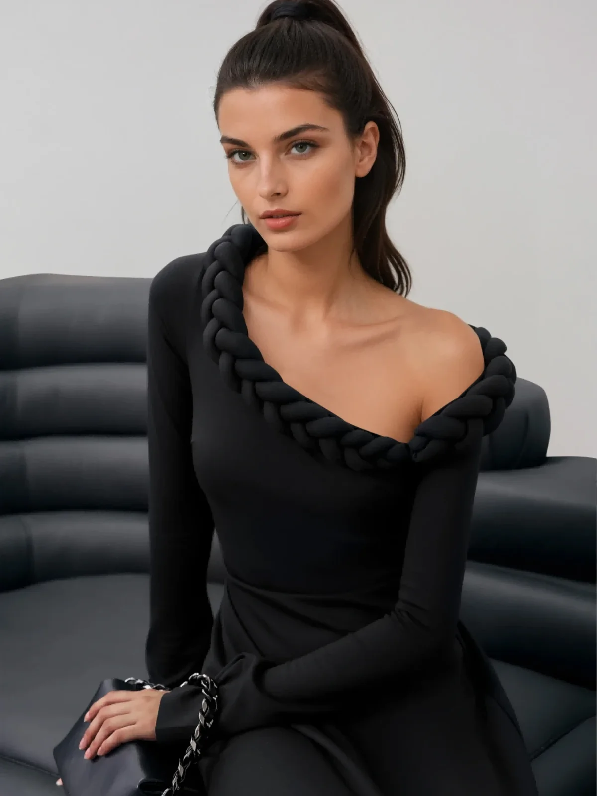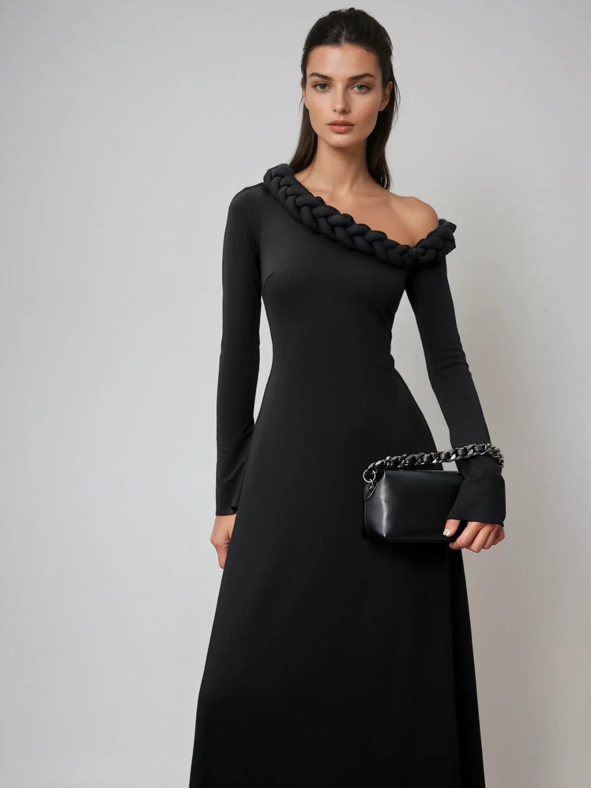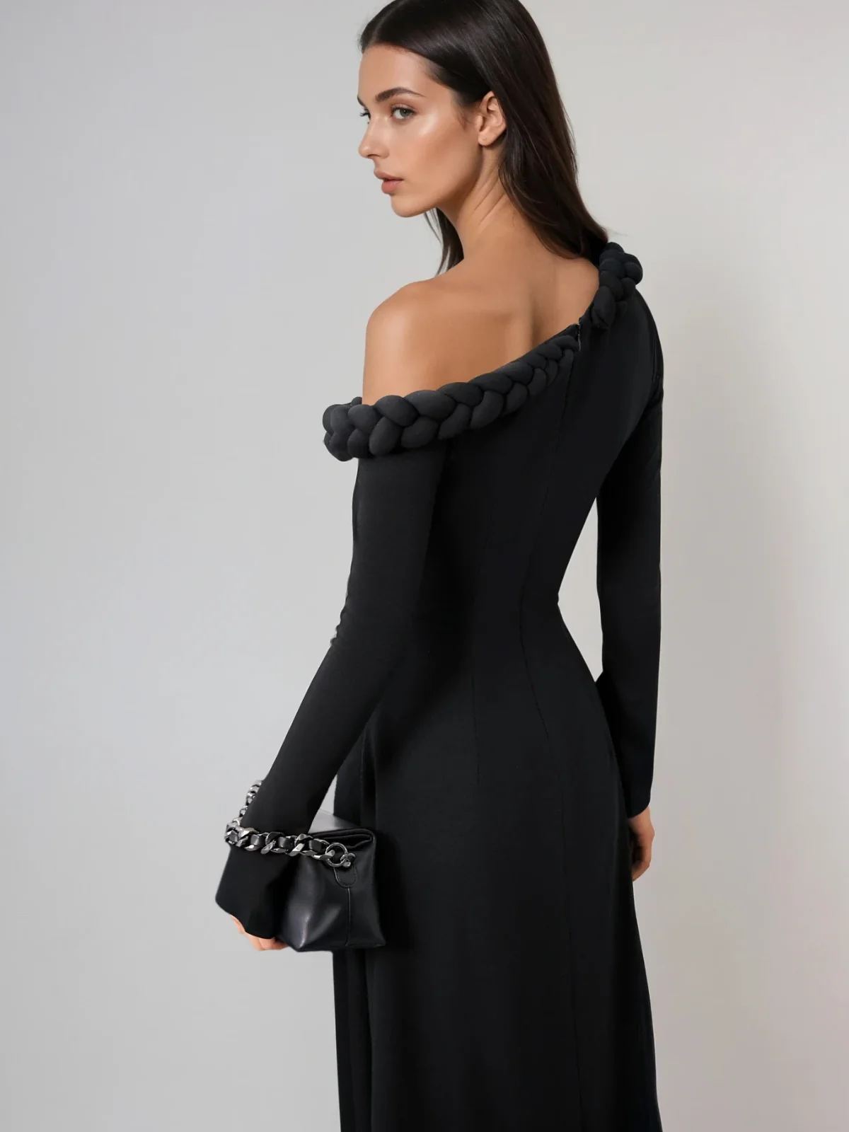 Elevate your style with the Black One Shoulder Twisted Midi Dress. Featuring a unique twisted detail and an asymmetric neckline, this dress exudes elegance and sophistication. The midi length offers versatility for formal occasions or chic evenings out. Made from 100% Polyester with a slight stretch, it ensures both comfort and style. The invisible zipper at the back adds a classy touch. Look effortlessly charming and confident in this timeless piece. Color variations may occur due to lighting. Available sizes: S, M, L.
