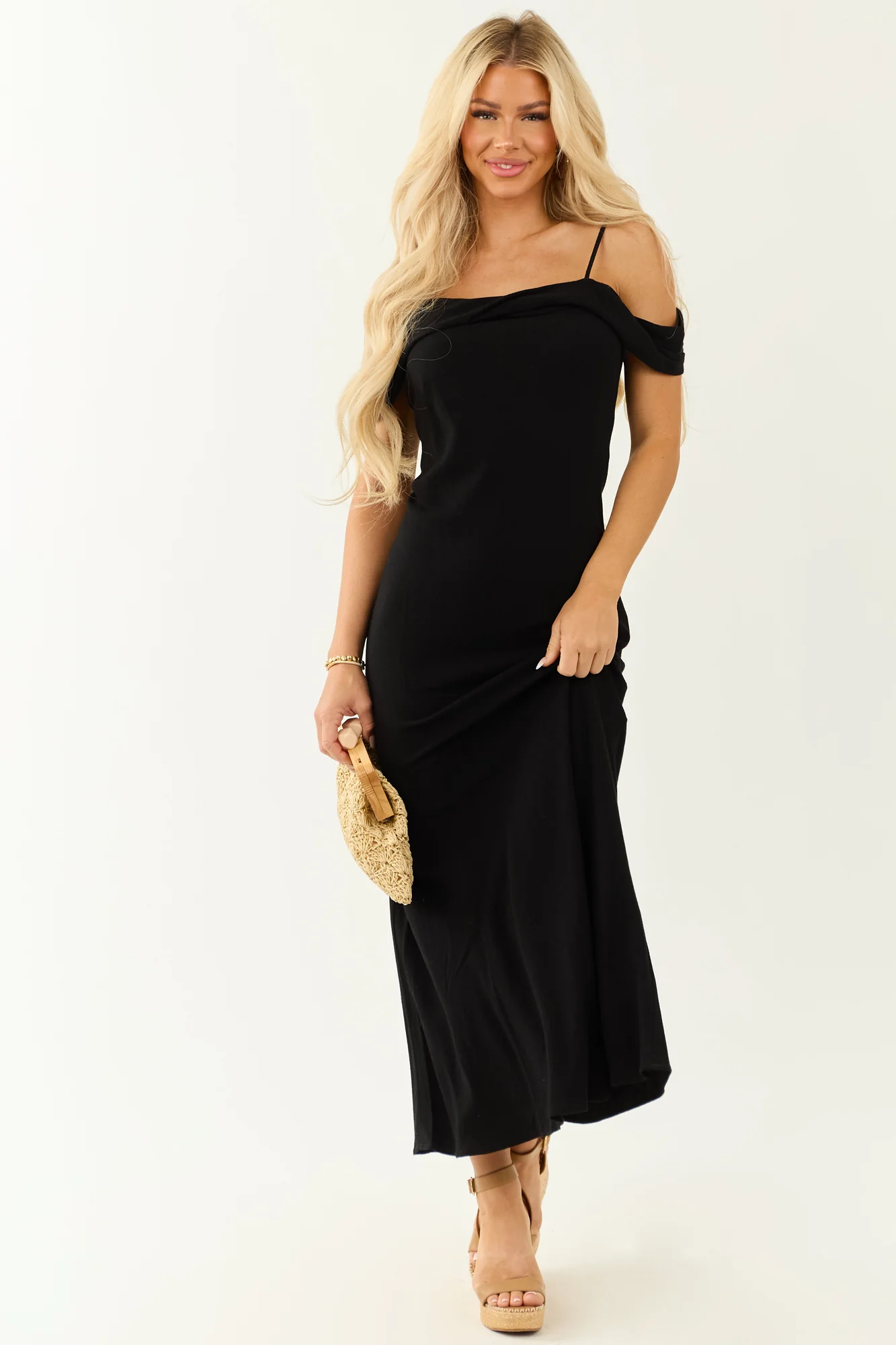 Indulge in the midnight sleek charm with a hint of flirt in this Black Overlay Maxi Dress. Slightly loose fit, adjustable spaghetti straps, off-shoulder cap sleeves, striking open back, and front bust overlay add allure to your outfit. Unleash your style in this unlined dress made of 75% Rayon and 25% Linen blend. Model is wearing size Small: Size 1, Height 57″, Bust 34″, Waist 26″.