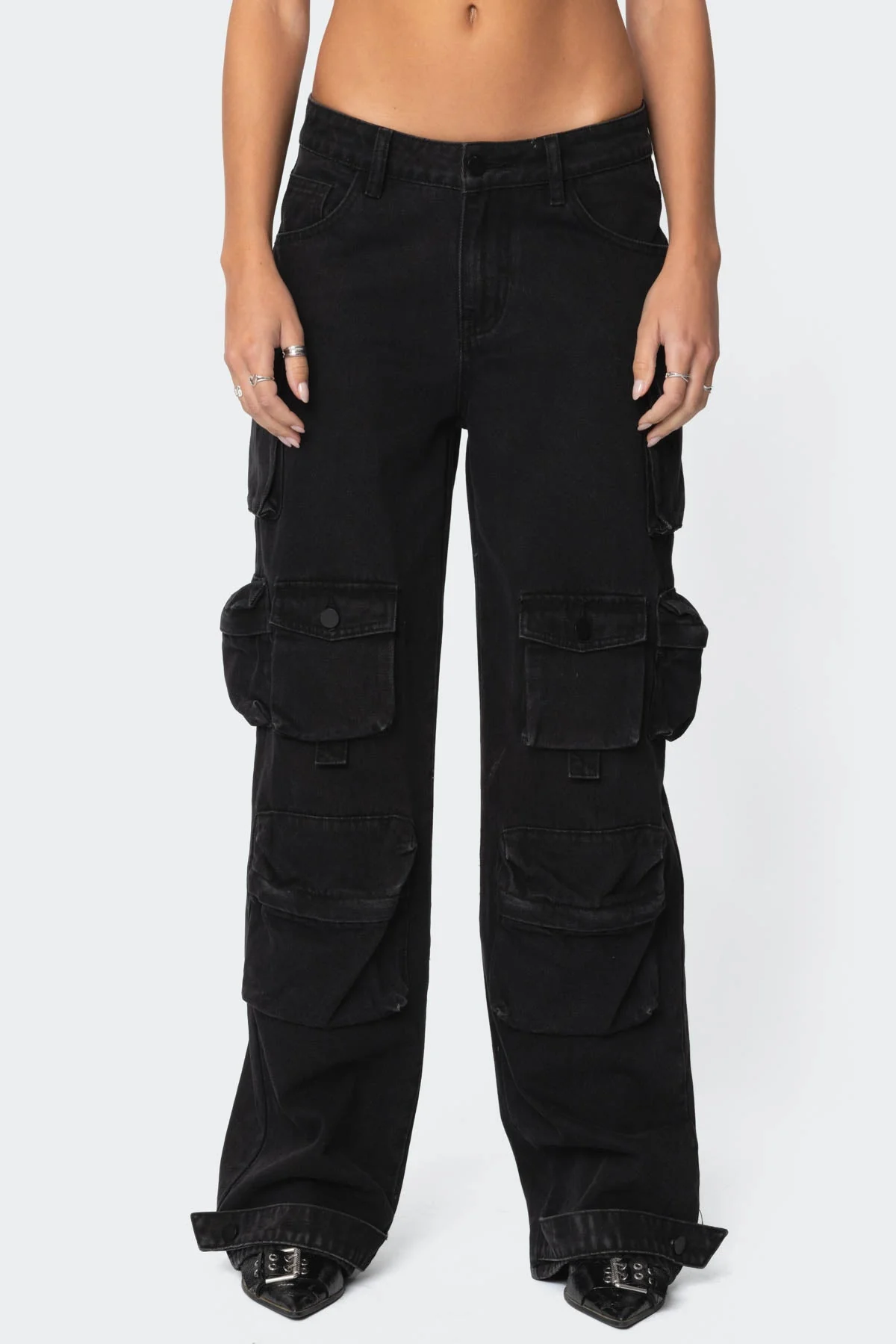 Upgrade your wardrobe with these Black Oversized Cargo Pants made of durable 100% cotton. Features a relaxed fit, military pockets, and versatile style for everyday wear. Pair with your favorite tops for a trendy look. This model wears size S and is 58 tall. Care instructions: Machine wash with similar colors.