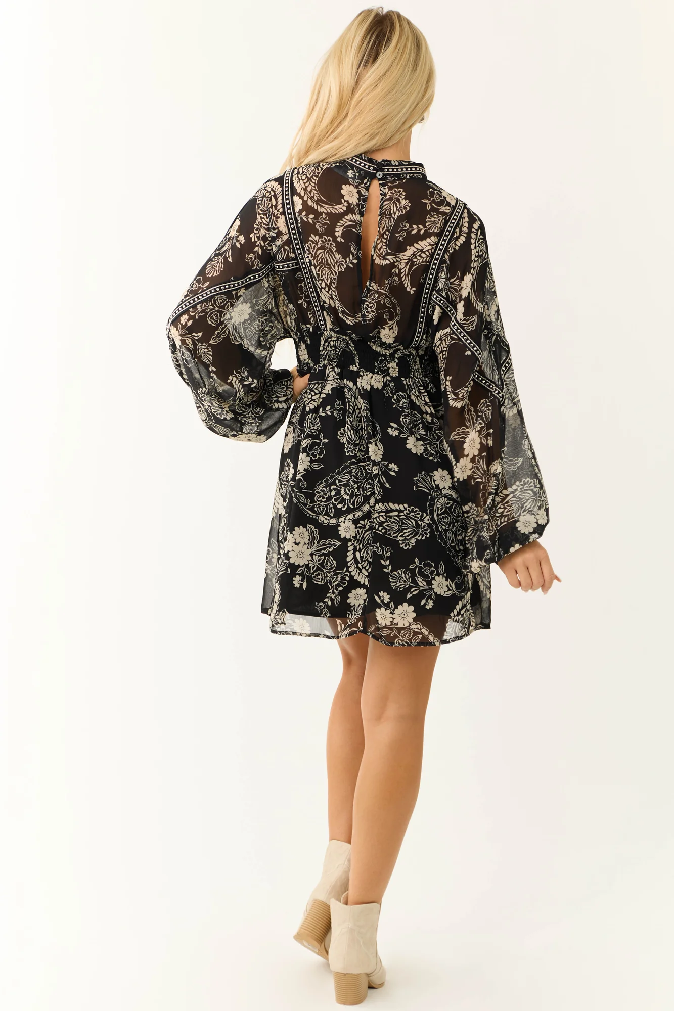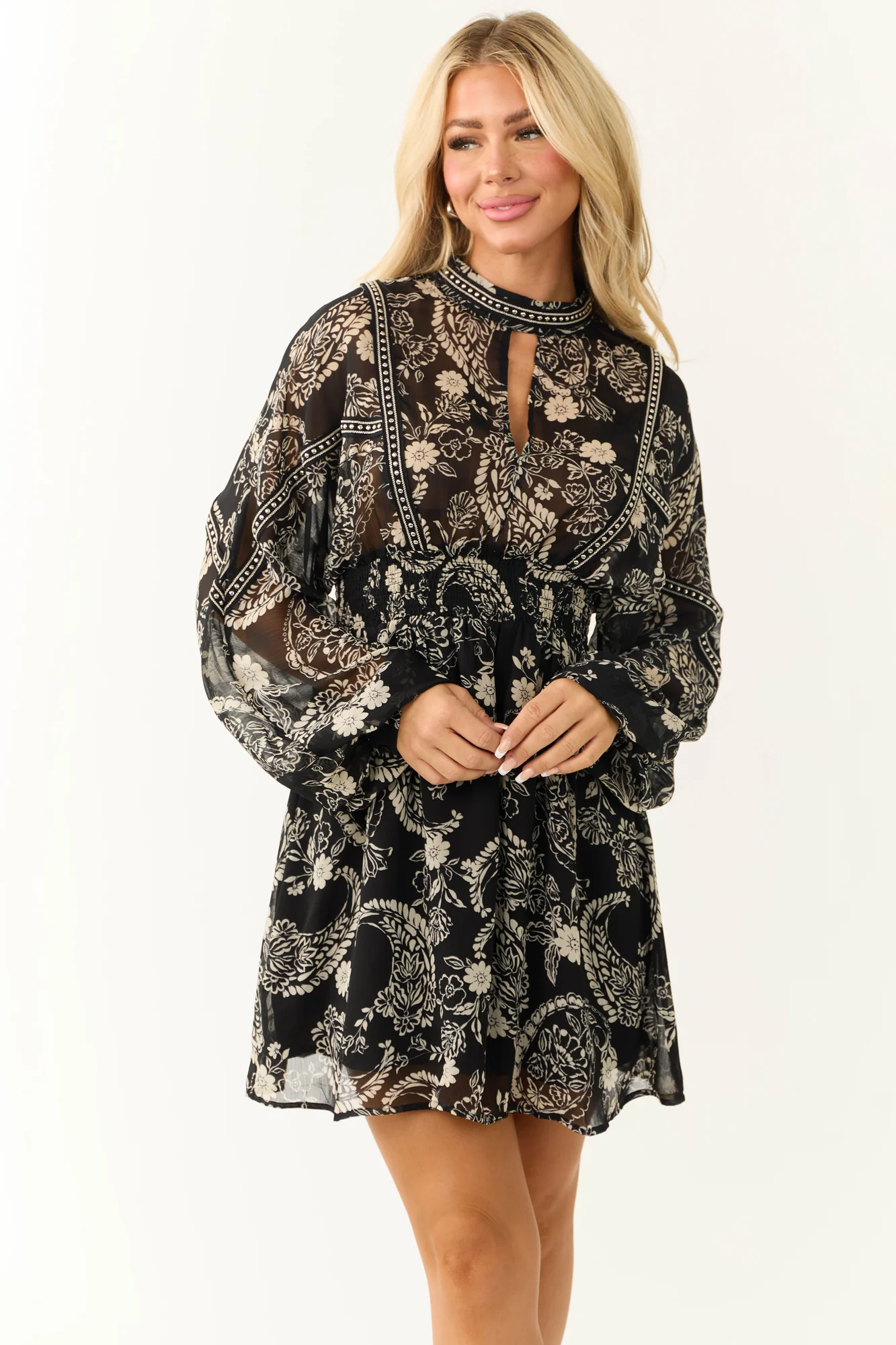 This sophisticated Black Paisley Print High Neck Short Dress is a timeless piece that exudes elegance. Available in sizes Small, Medium, and Large, this delightful dress features a loose blouson bodice, long sleeves with silver stud details, a cutout neckline, and a keyhole back with double button closure. The elastic ruched waistband provides a comfortable fit, while the lined skirt adds a luxurious touch. Crafted from non-stretchy woven polyester, this dress is perfect for date nights or going out. Additionally, it is easy to care for with instructions for hand washing. Add a touch of chic style to your wardrobe with this black paisley dress.