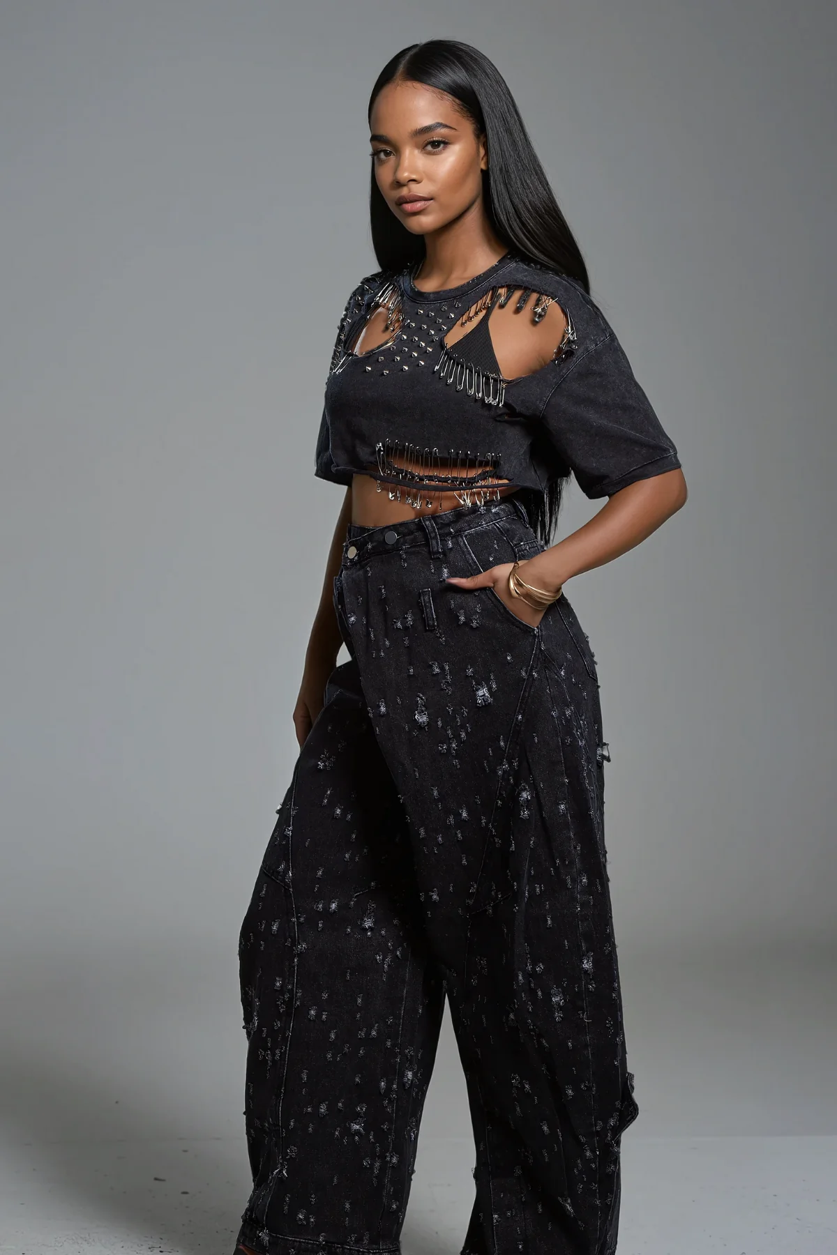 Unleash your daring side with the Harlee Hollow Paperclip Embellished T-Shirt! This black tee features an edgy paperclip embellishment and a bold design, adding a touch of adventure to any outfit. Stand out from the crowd and make a statement with this unique piece made of 100% Polyester with a slight stretch for added comfort. Hand wash cold for best care. Please note, color may vary due to lighting in images.