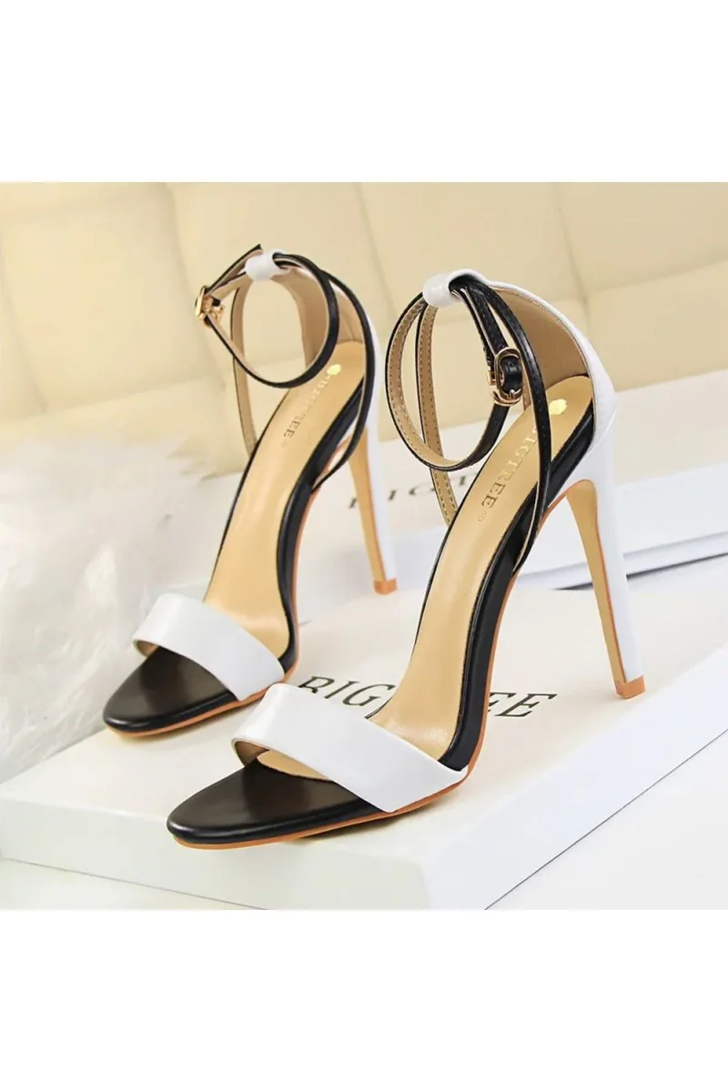 Elevate your style with these black patent leather stiletto heels. Featuring a one-band open toe design and an adjustable ankle strap, these heels exude sophistication and elegance. The glossy patent finish adds a touch of shine, making them perfect for evenings, parties, or special occasions. Step into luxury and confidence with every stride. Heel Height: 11 cm. Material: Satin, Imitation Pigskin, Rubber.