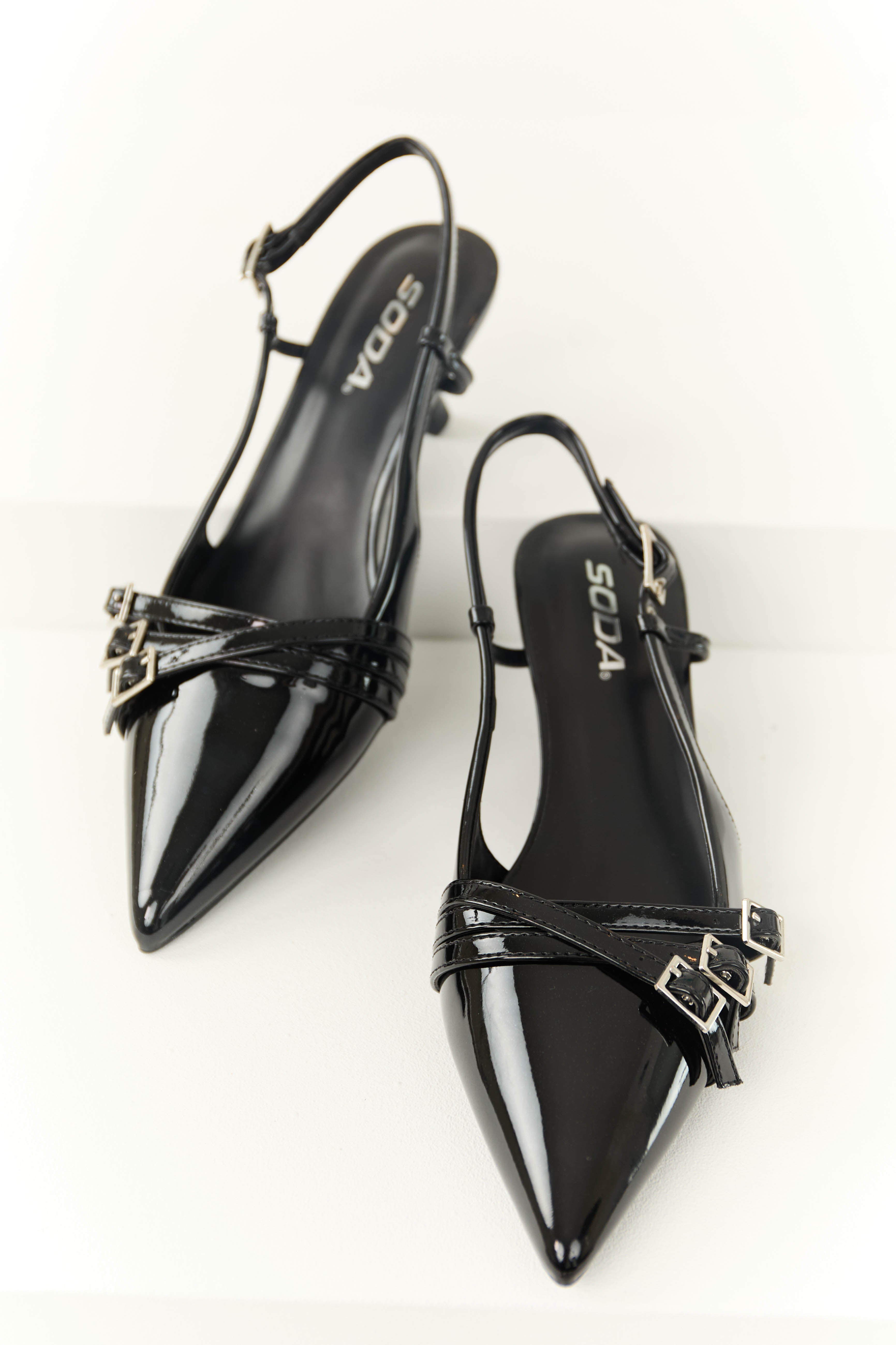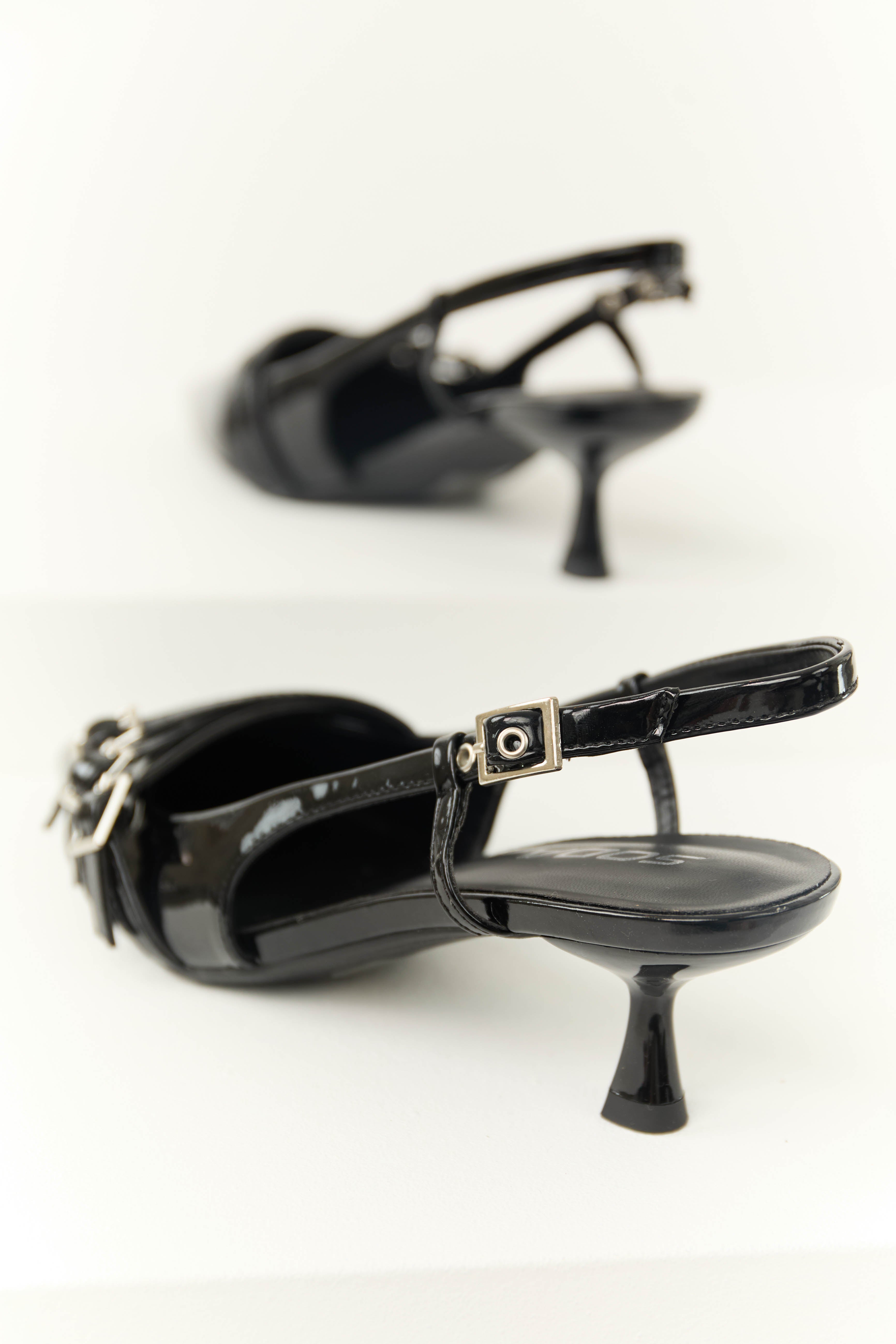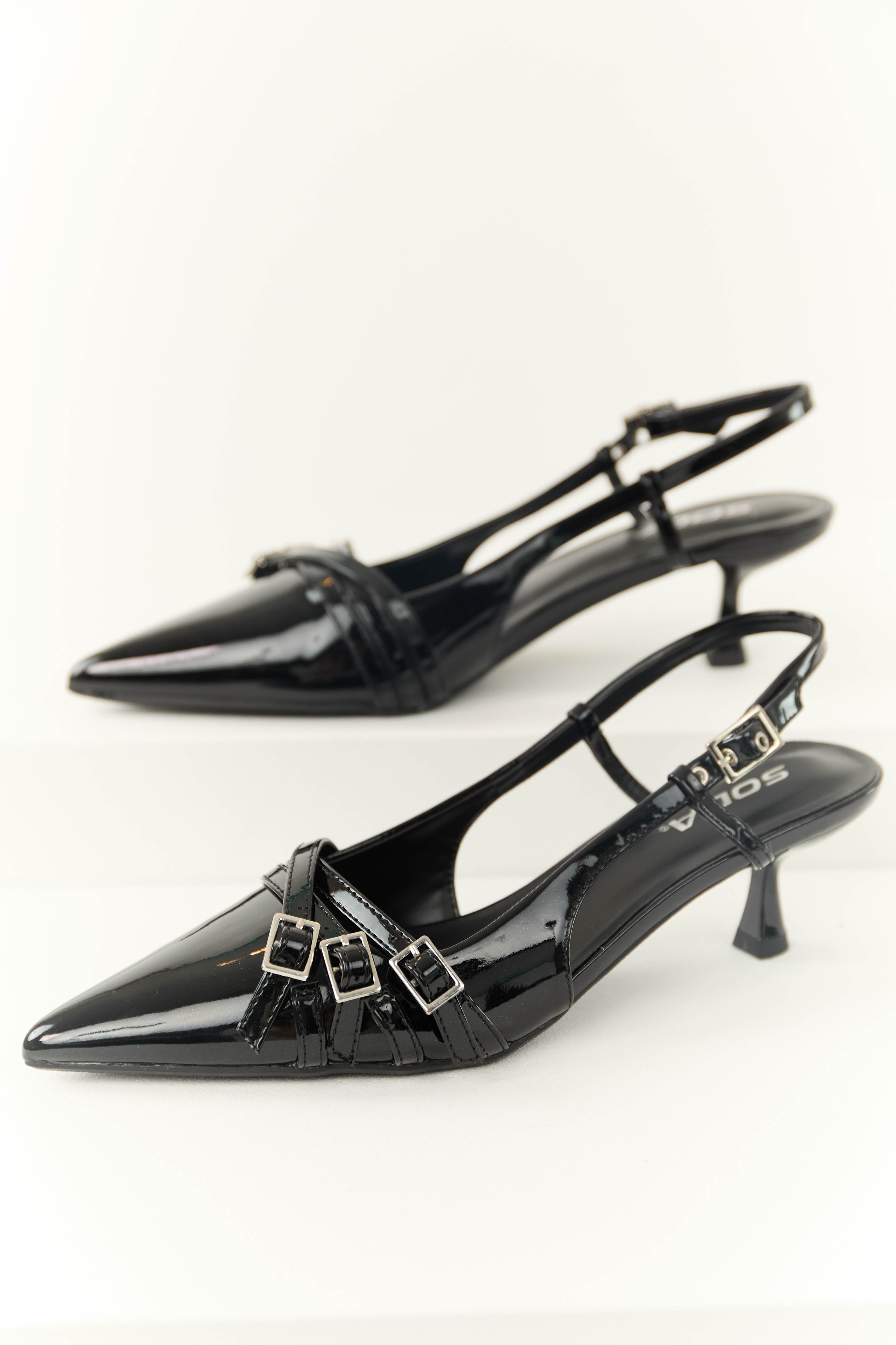 Step out in style with these black patent slingback heels featuring a slightly cushioned insole for all-day comfort. The spool heel and closed toe design provide elegance, while the triple buckle strap detail adds a chic touch. Heel height: 2.5 inches. Perfect for date nights, daytime wear, and work outfits. Imported.