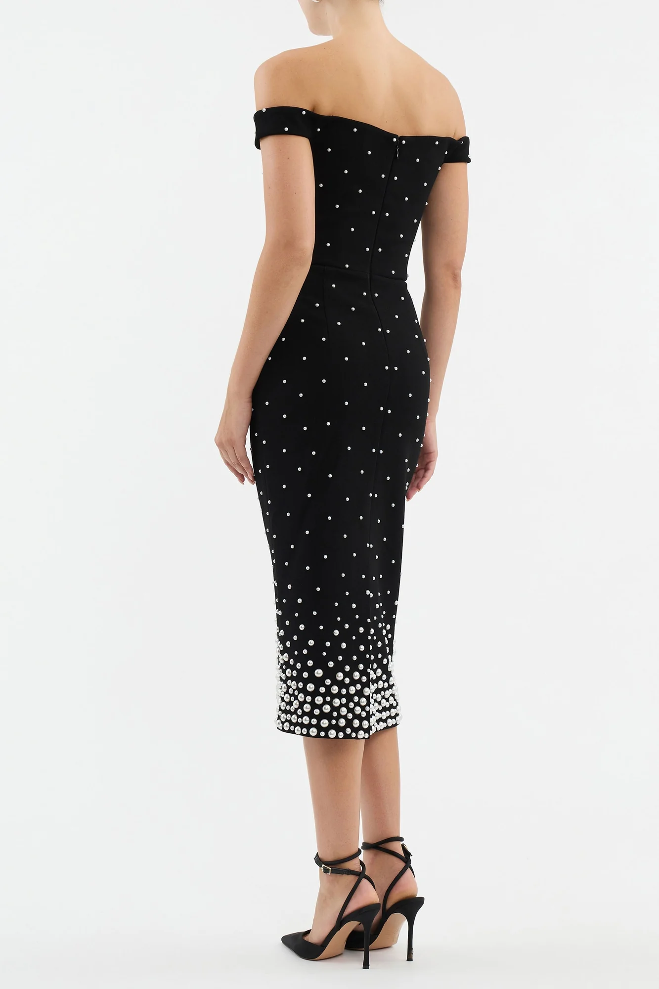 Elevate your style with our black midi dress adorned with playful pearl polka dots, perfect for a night out or special occasions. The V-wire neckline and zip fastening at the back add allure. Designed to turn heads and embrace your inner pearl. Lined for comfort and accuracy with sizing. Color variations may occur due to lighting. Make a statement with this elegant piece. Refer to our size chart for the perfect fit.