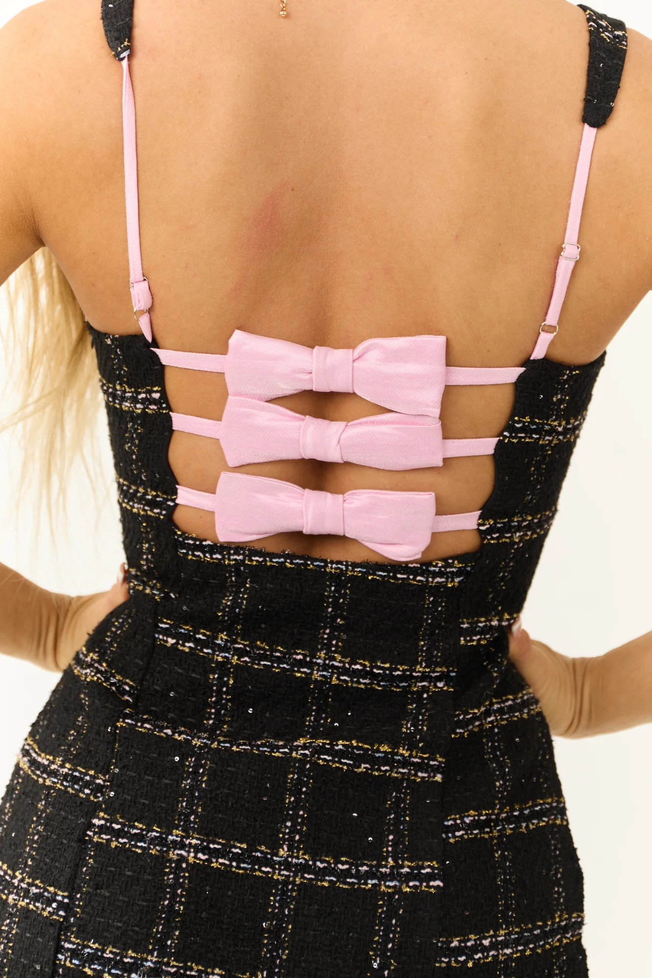 This charming mini dress is a wardrobe essential for your upcoming date night or evening out. Crafted from non-stretchy woven tweed, it features a flattering sheath silhouette and chic plaid stitching in shades of Baby Pink, Sky Blue, and Gold. The sweet open back design adorned with three Baby Pink bow straps adds a touch of playfulness. Adjust the fit with the baby Pink spaghetti straps and secure it easily with the side zipper. The dart seams ensure a tailored look, while the silver sequins scattered throughout give it a touch of sparkle. This dress is lined for comfort and made from high-quality materials for lasting wear. Care for it by washing cold, line drying, and ironing on low heat for the best results.