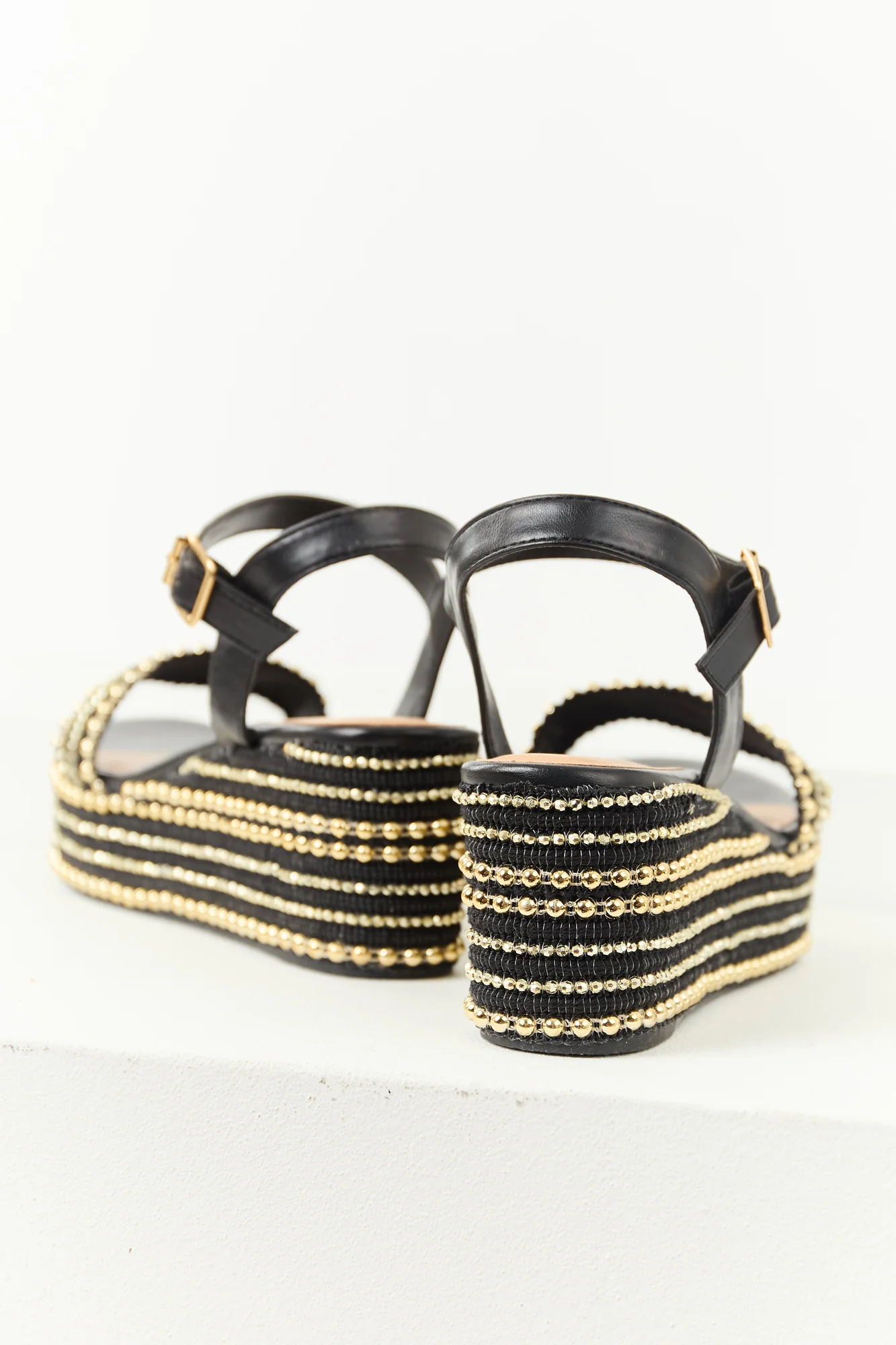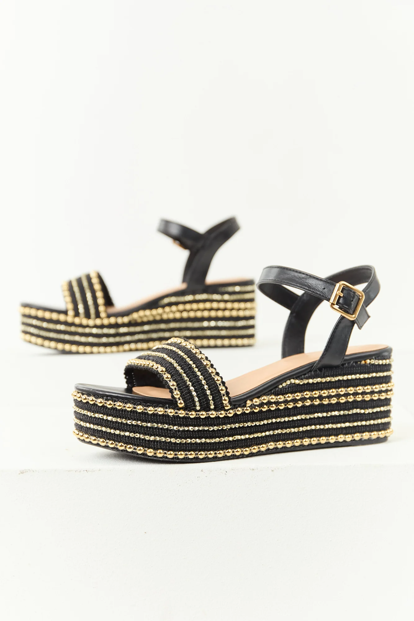 Elevate your style with these chic platform wedges featuring a gold bead accent. Crafted from faux leather with a lightly cushioned insole, an open round toe, adjustable buckle ankle strap, 3.5″ shaft, 3″ heel, 1.75″ platform, and 9.5″ circumference. Imported.