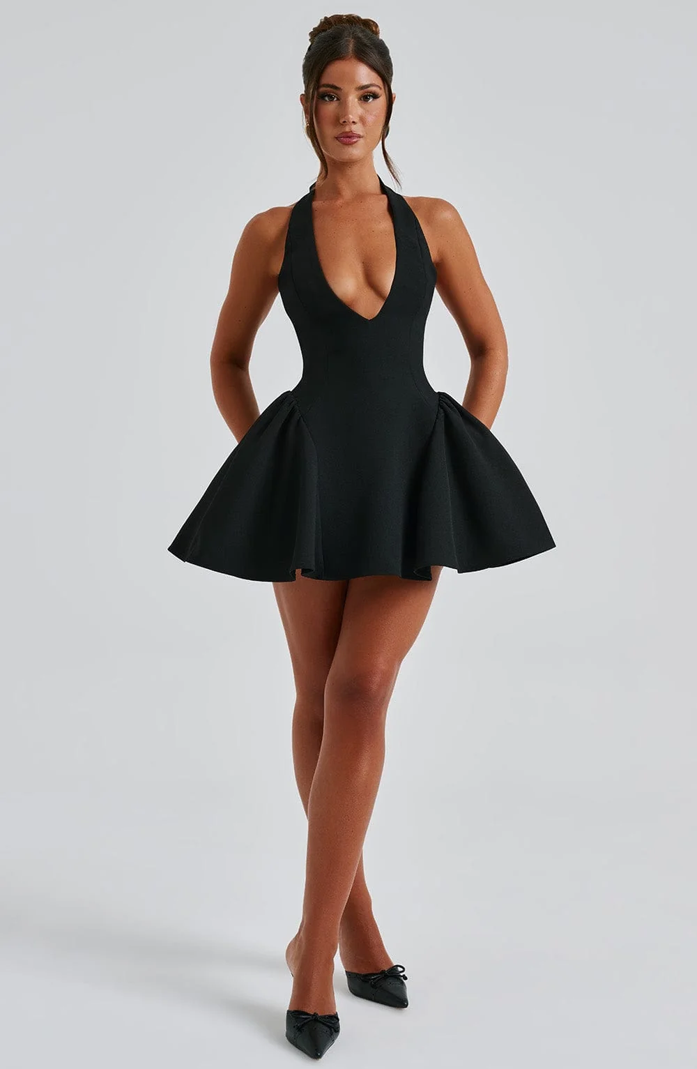 Elevate your look with the black plunge neckline playsuit, crafted from premium non-stretch crepe fabric. Designed with a halter neckline, princess seams, and a voluminous skirt overlay made of tulle for a dramatic effect. This playsuit features in-built shorts for comfort and style. Perfect for various occasions from parties to summer outings. Embrace sophistication with this stunning piece. Available in sizes XS to XXL.