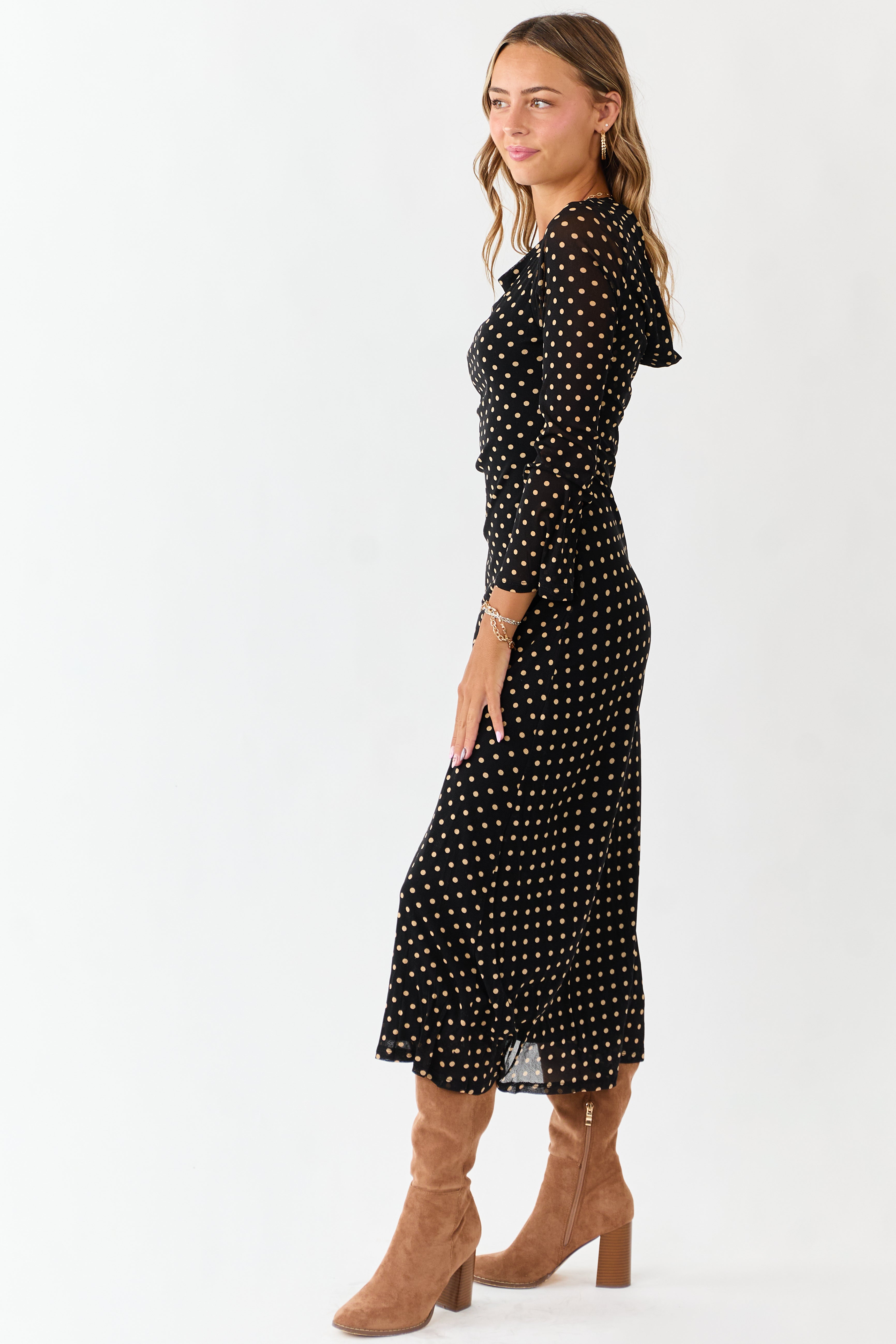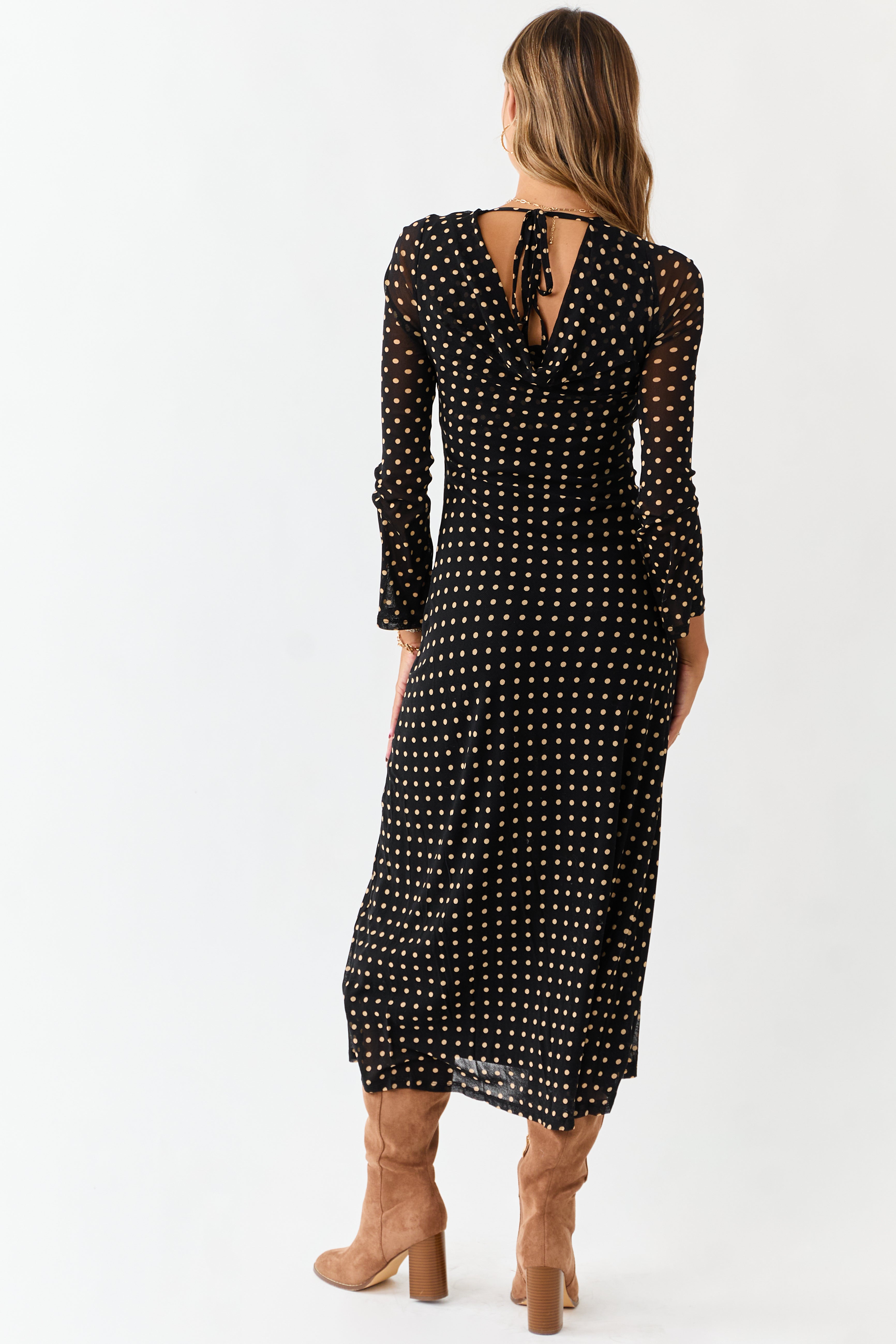 Embrace timeless charm with a modern twist in our Black Polka Dot Mesh Midi Dress. This dress features sheer mesh sleeves, playful polka dots, a stretchy mesh fabric, Desensand hues, a hidden side zipper, and a back cowl neckline with a tie for added elegance. Made of 90% Polyester and 10% Spandex with 100% Polyester lining, this dress is both stylish and comfortable. Available in sizes XS, S, M, L, and XL, it fits true to size. Elevate your wardrobe with this chic and versatile piece that will surely turn heads wherever you go. Add it to your collection today!