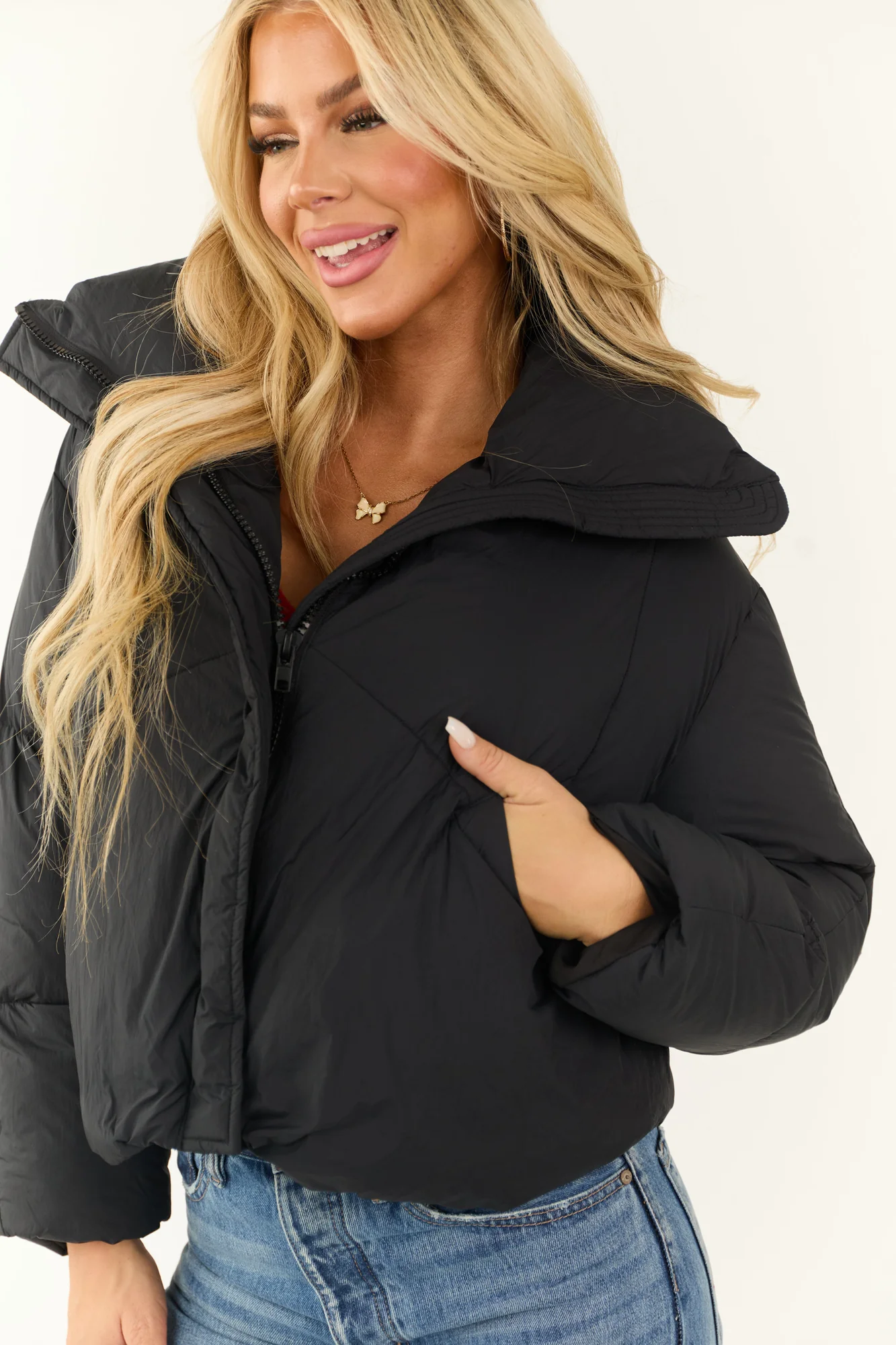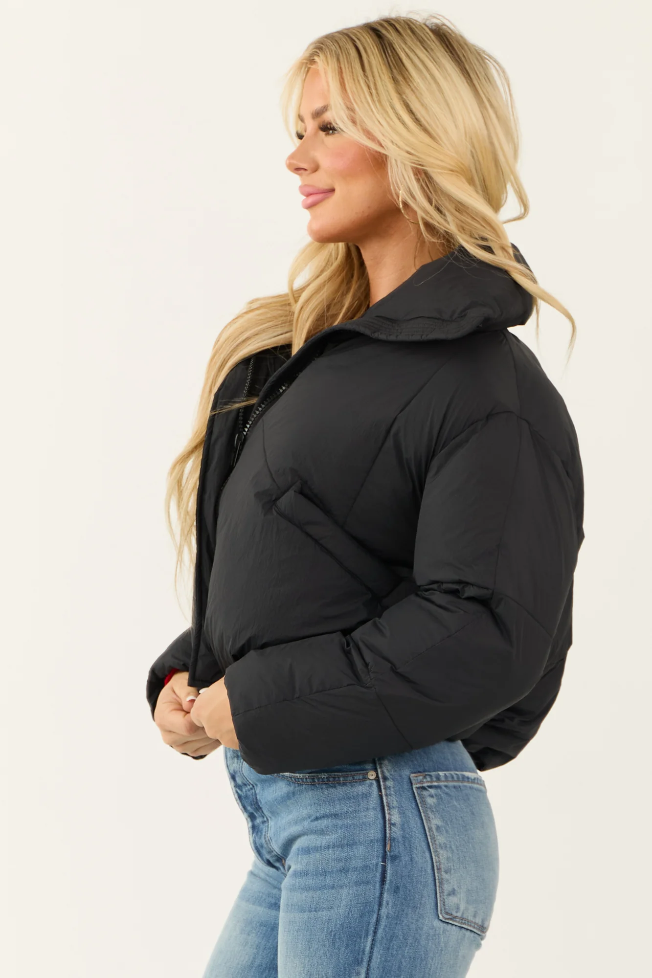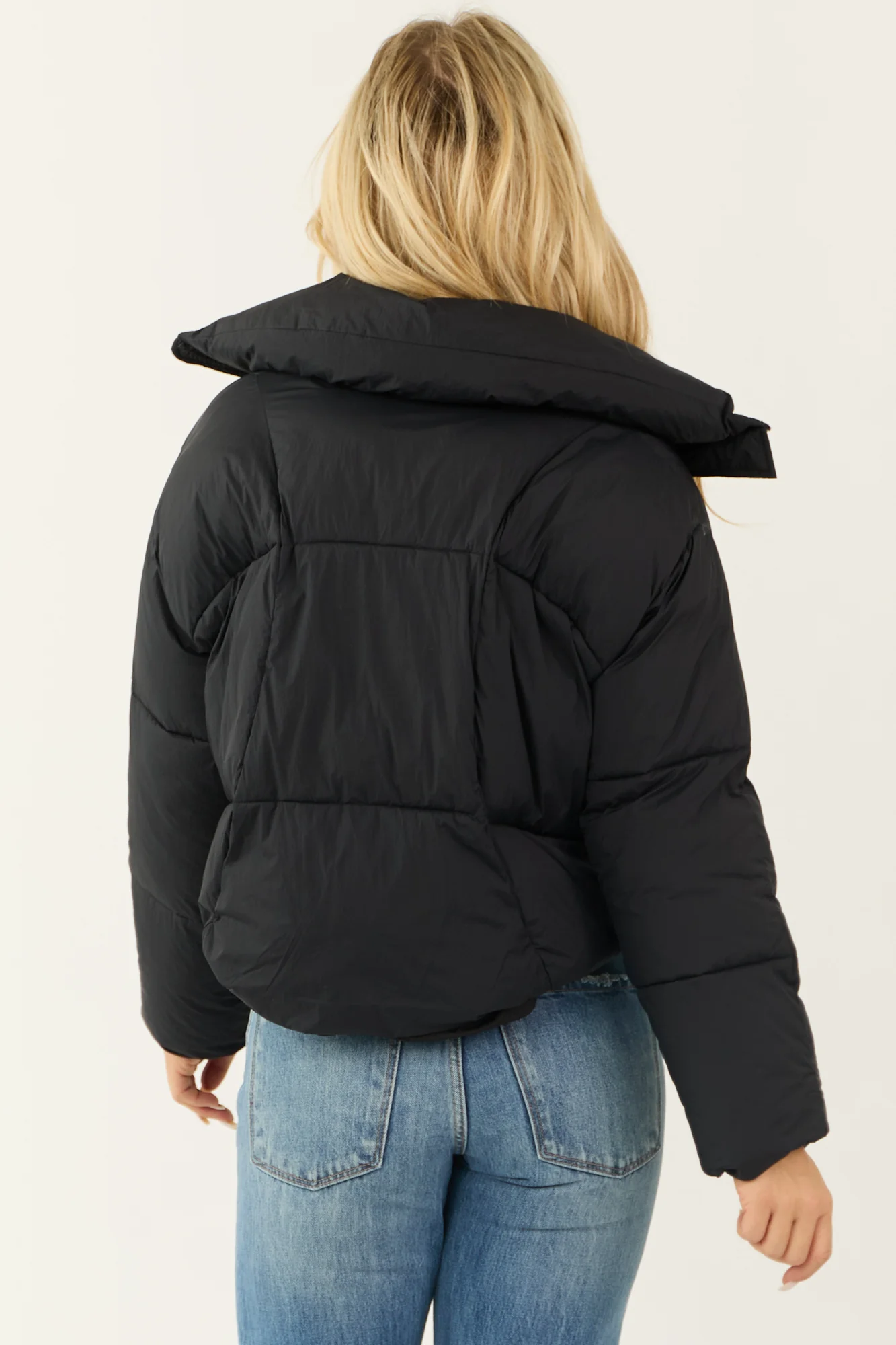 Stay warm and stylish with our Black Puffer Jacket featuring a mock neck, long sleeves, and bungee drawstring waist for a flattering fit. Made of non-stretchy Nylon with medium filling, this jacket offers comfort and warmth in chilly weather. The jacket also includes pockets, a lined interior, and a 100% Polyester filling. Care instructions: Hand wash cold, line dry. Perfect for casual daytime wear during the winter season.