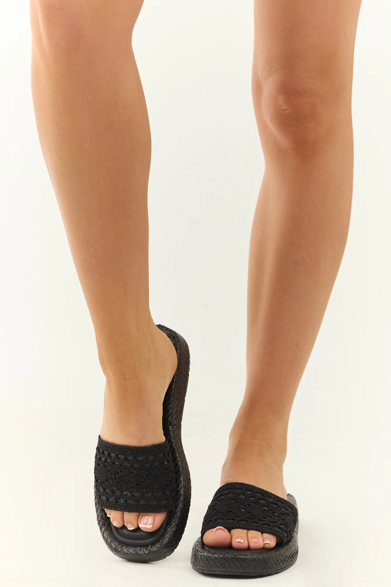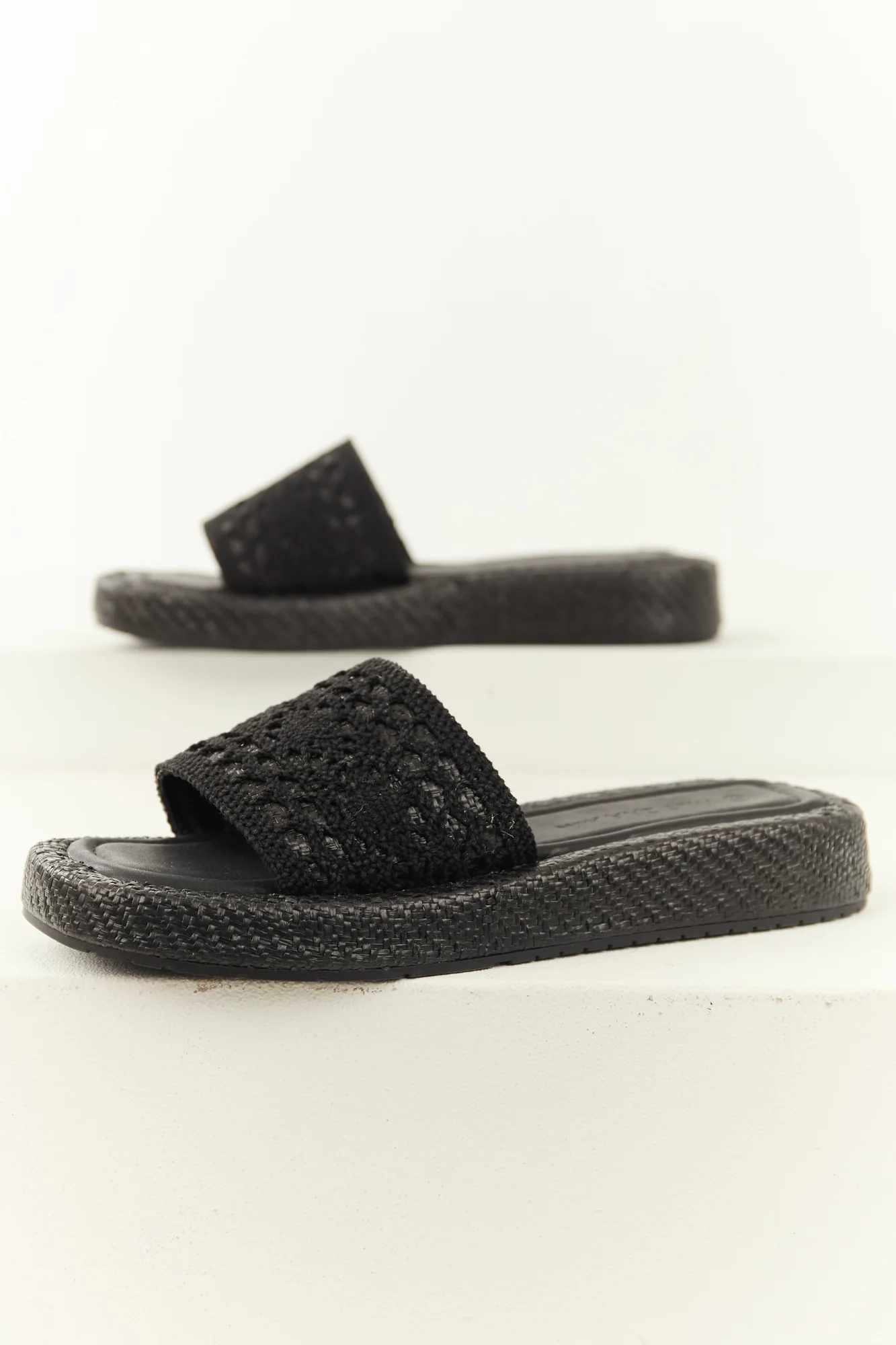 Elevate your style with these black raffia platform slip-on sandals. Crafted with a non-stretchy raffia material and featuring a rounded square open toe, black crochet strap overlay, and a cushioned insole for all-day comfort. The 1-1.25″ tapered platform adds a trendy touch. With a circumference of 8.5″, these sandals are a perfect addition to your summer wardrobe. Product measured on size 8 for accurate fit.