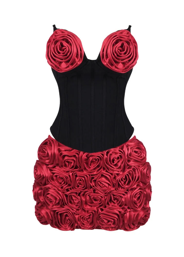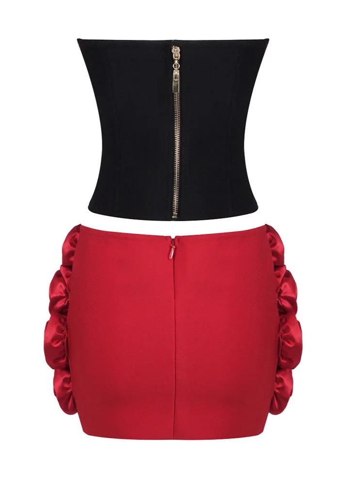 Elevate your style with our Black Red Floral Print Strapless Corset Mini Dress. Designed with a structured silhouette and delicate floral details, this dress features a sleeveless design and an exposed zipper at the back for easy wear. Crafted from a high-quality blend of Polyester and Cotton with YKK zipper for durability. Follow care instructions for long-lasting beauty. Find the perfect fit according to our size chart for a true size match. Embrace elegance and vibrance in this chic outfit thats sure to turn heads wherever you go.