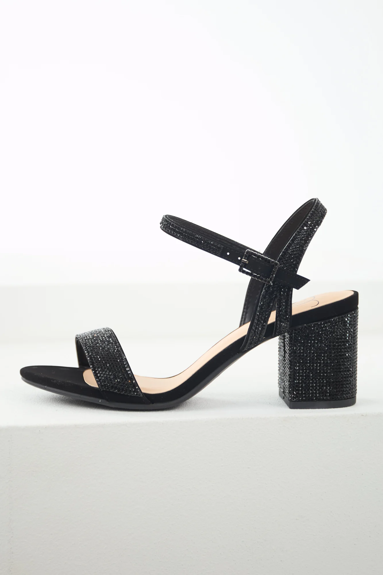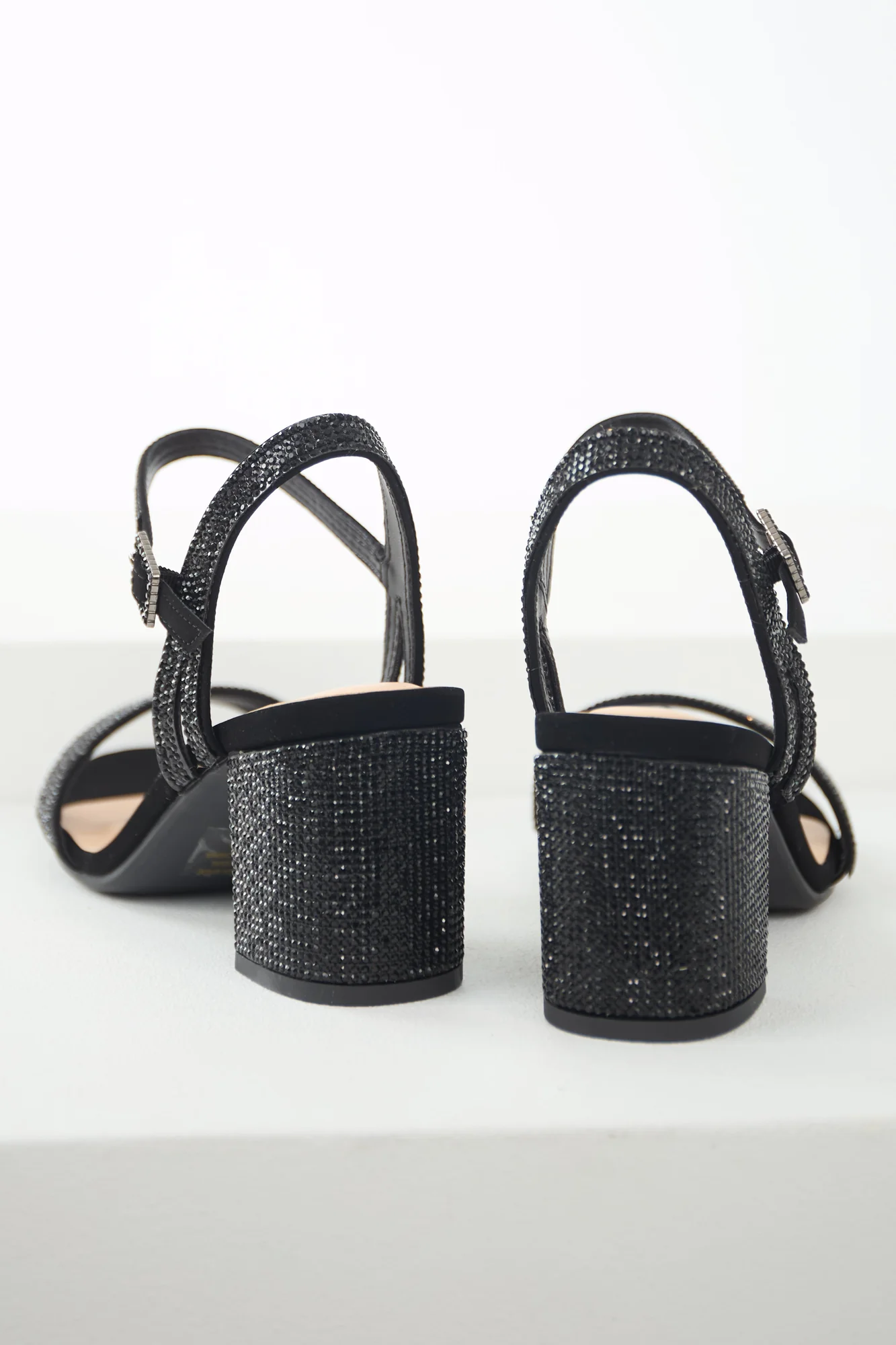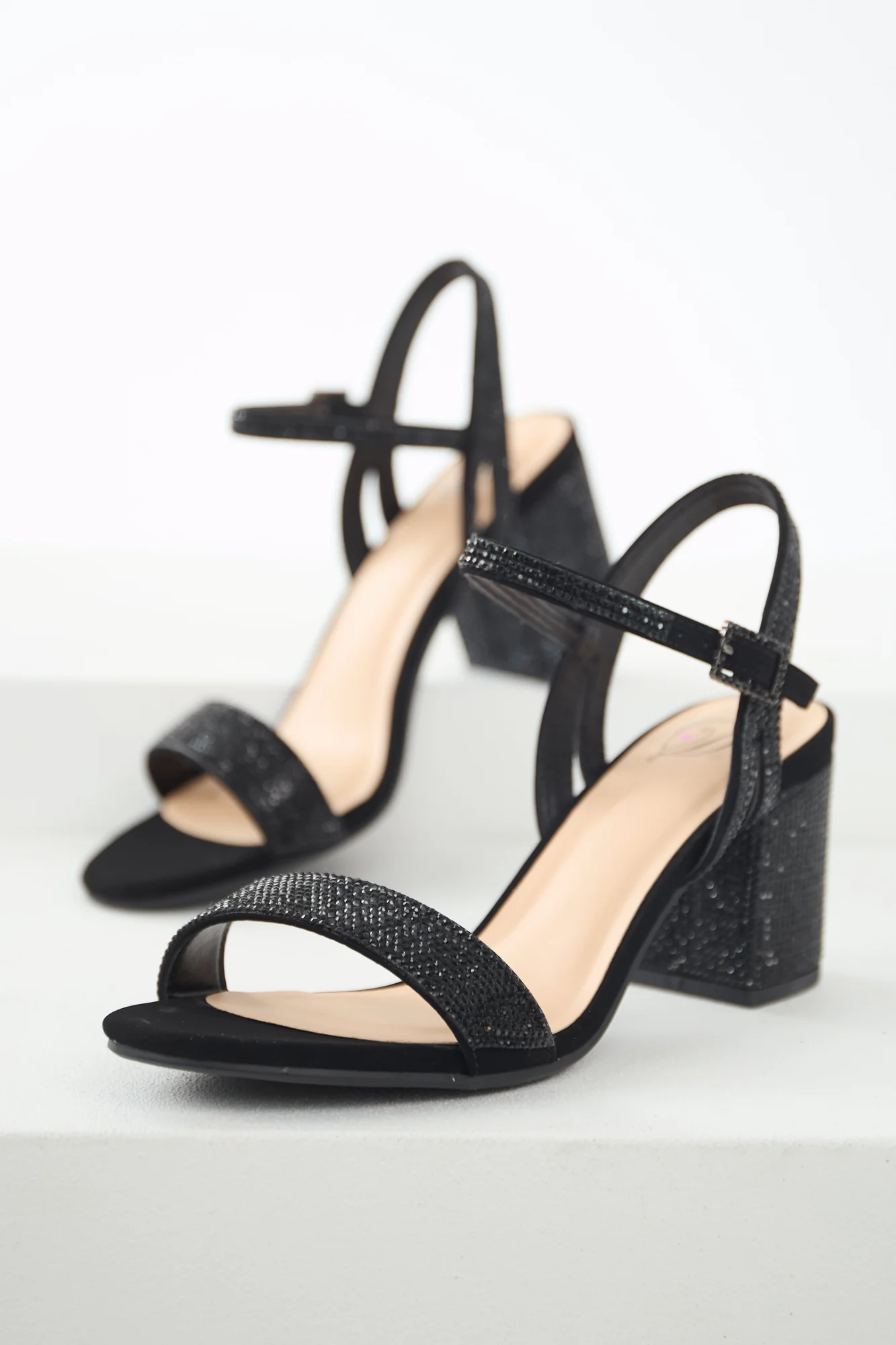 Discover the elegance of black rhinestone block heel sandals designed . These faux suede sandals feature a round open toe, adjustable ankle buckle strap, and cross toe strap. Step comfortably with a slightly cushioned nude insole. Heel height measures 3 inches, shaft height is 4 inches, with an adjustable circumference. Imported and available in various sizes.