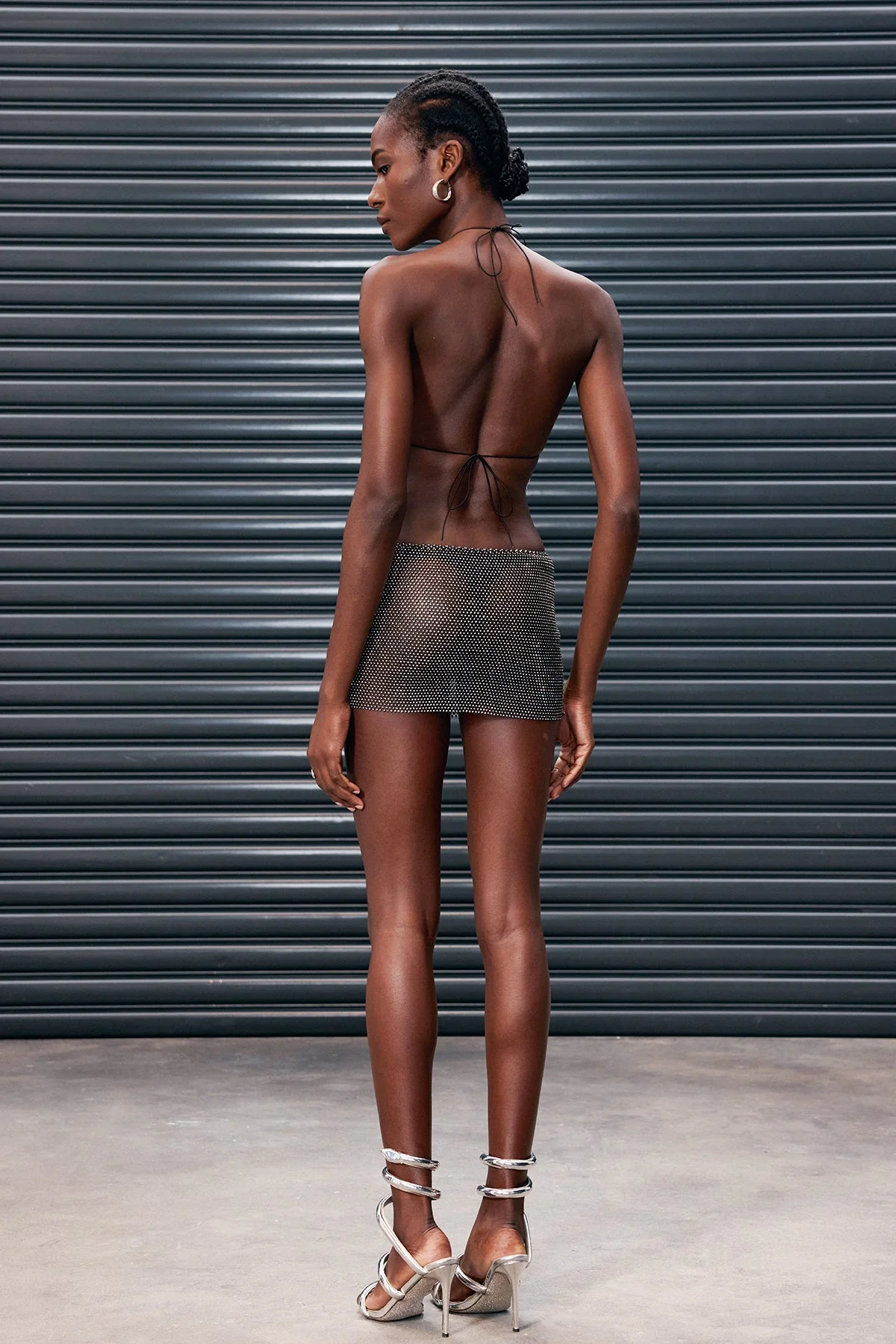 Elevate your style with the Black Rhinestone Chain Cutout Mini Dress. Designed with intricate rhinestone embellishments, a daring cutout silhouette, and a chic mesh chain pattern, this dress exudes confidence and sophistication. Made of 50% Polyester and 50% Cotton, this non-stretch dress is easy to care for with a gentle machine wash. Note: Color variations may occur due to lighting. Step out in this stunning piece and make a bold fashion statement.