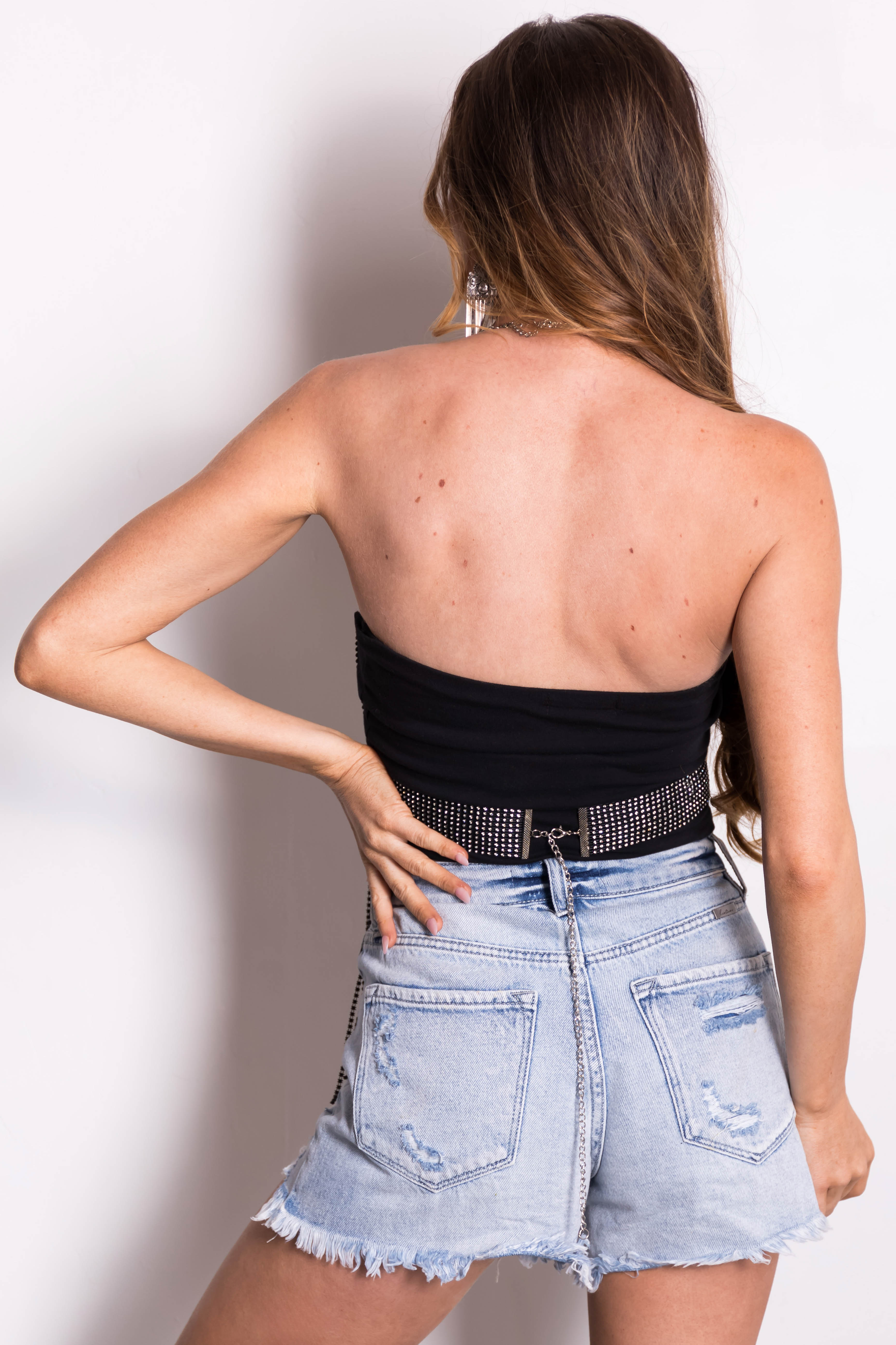 Make a statement in this Black Rhinestone Chain Mesh Fringe Tank Top. Featuring chain straps, a V neckline, and open back design with silver rhinestones, this non-stretchy metallic mesh top exudes glamour. The lobster clasp chain straps and waist strap add a touch of elegance. Perfect for date nights and going out, this top is a must-have for a stylish wardrobe. Hand wash cold. Model is wearing a size OS. Model stats: Size 2, Height 58″, Bust 32″, Waist 25″.