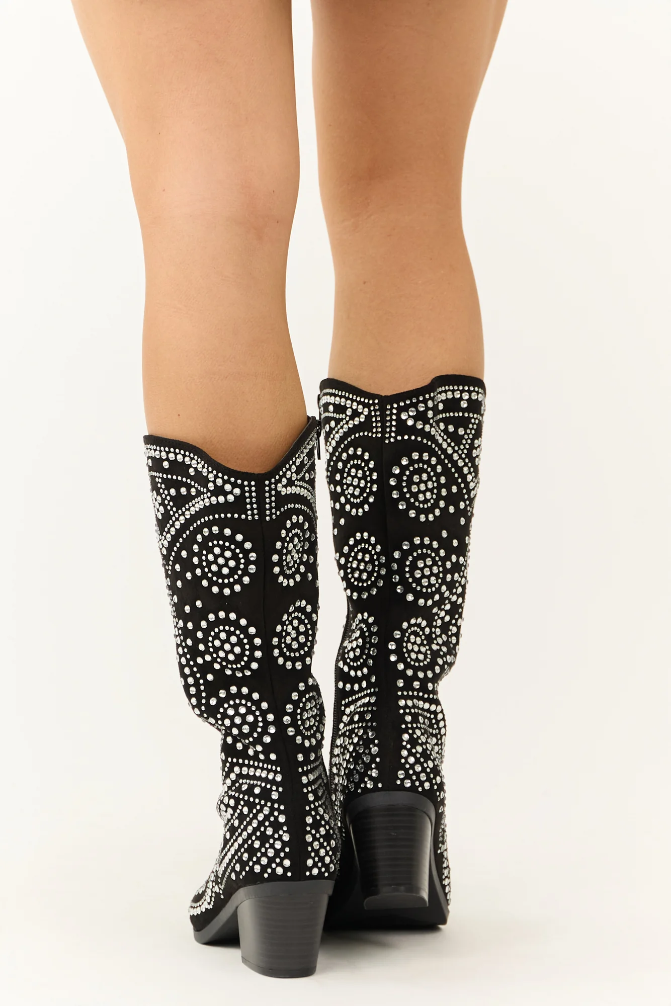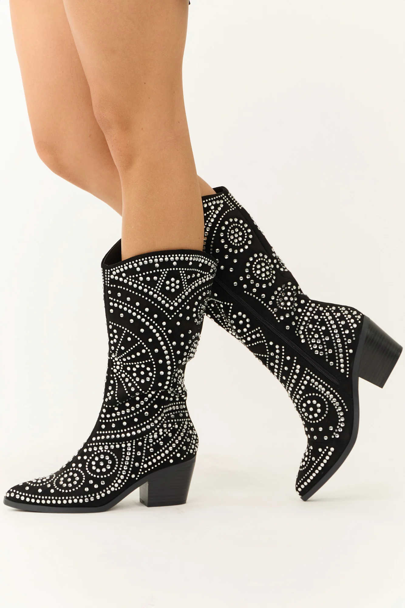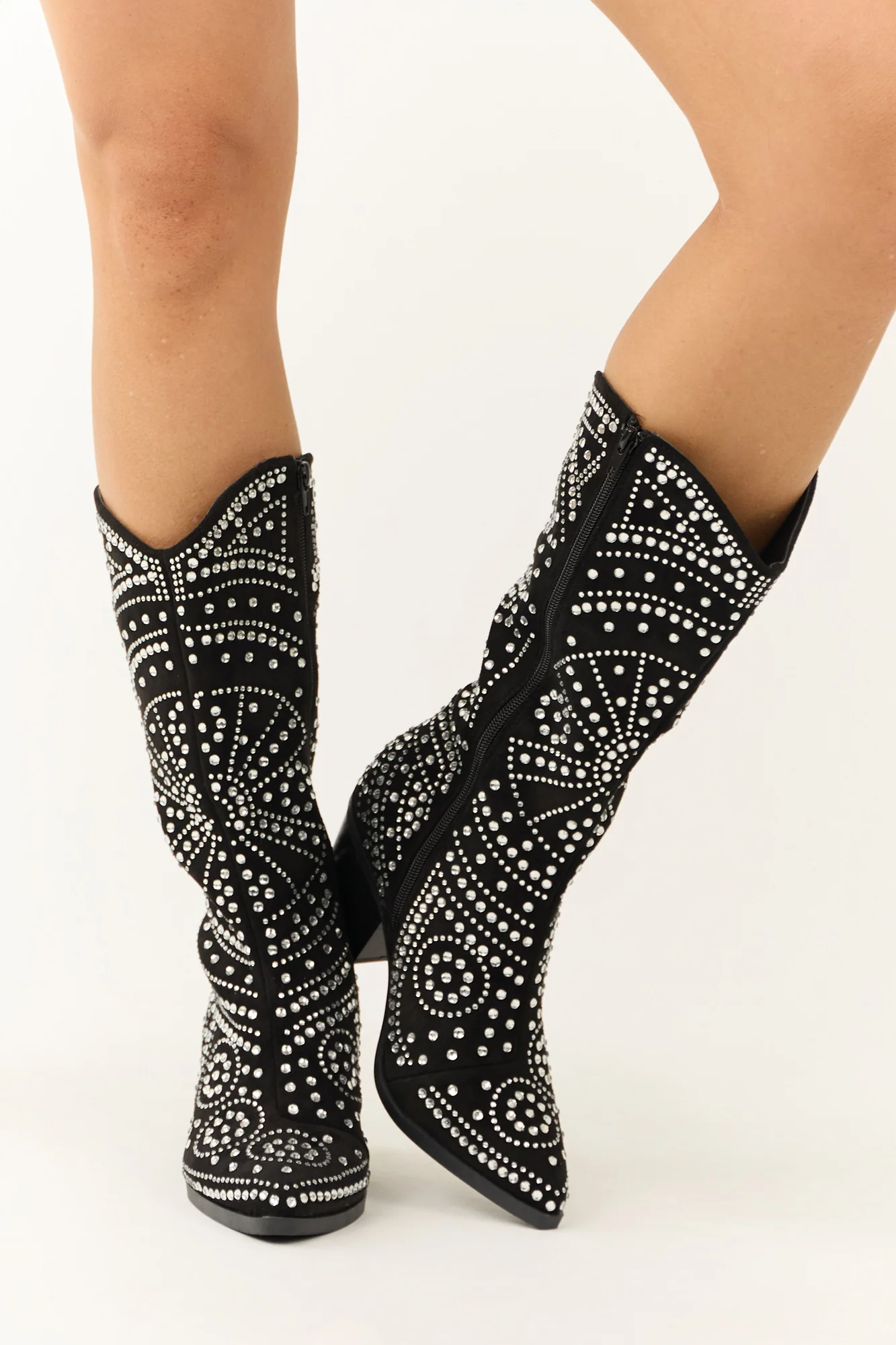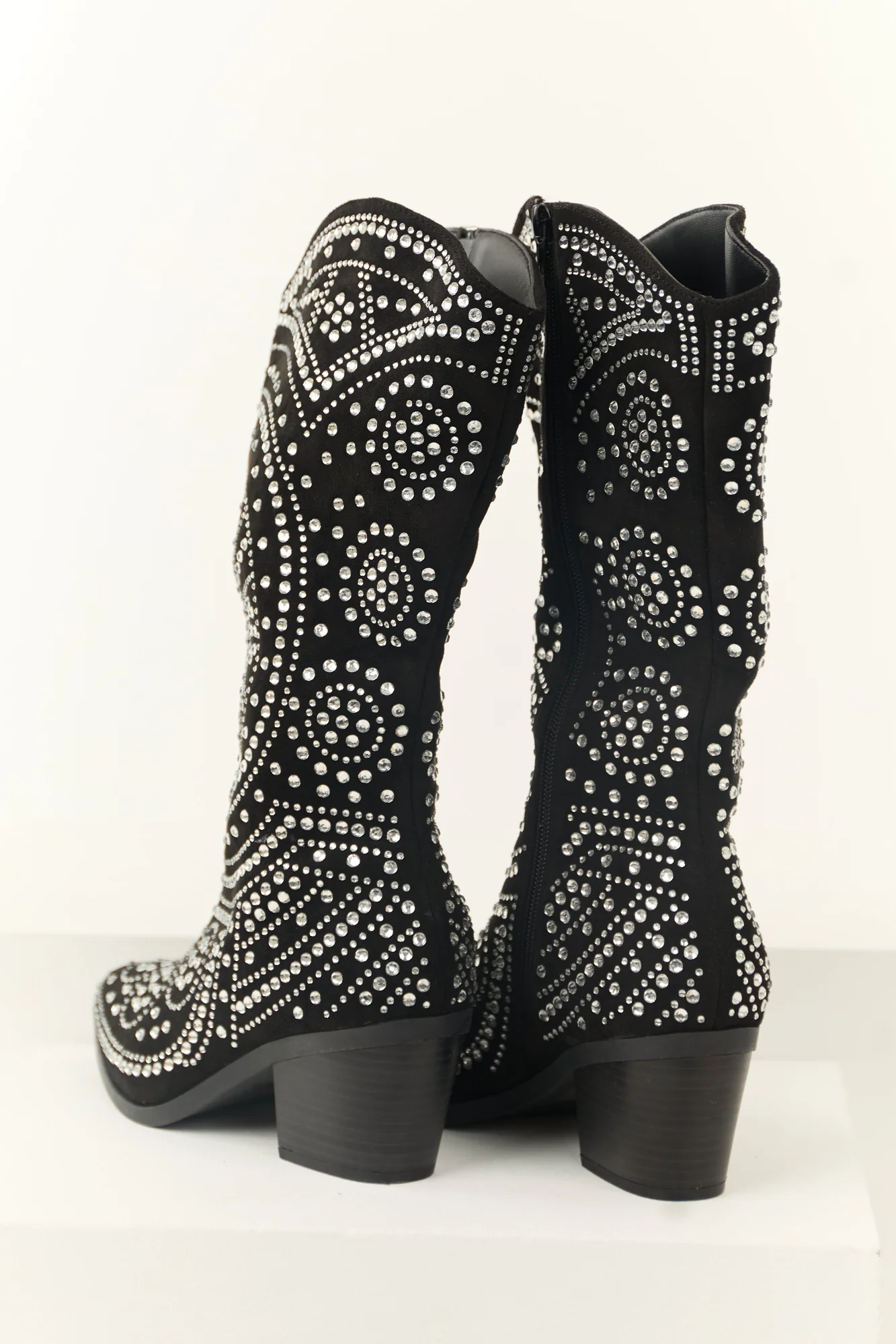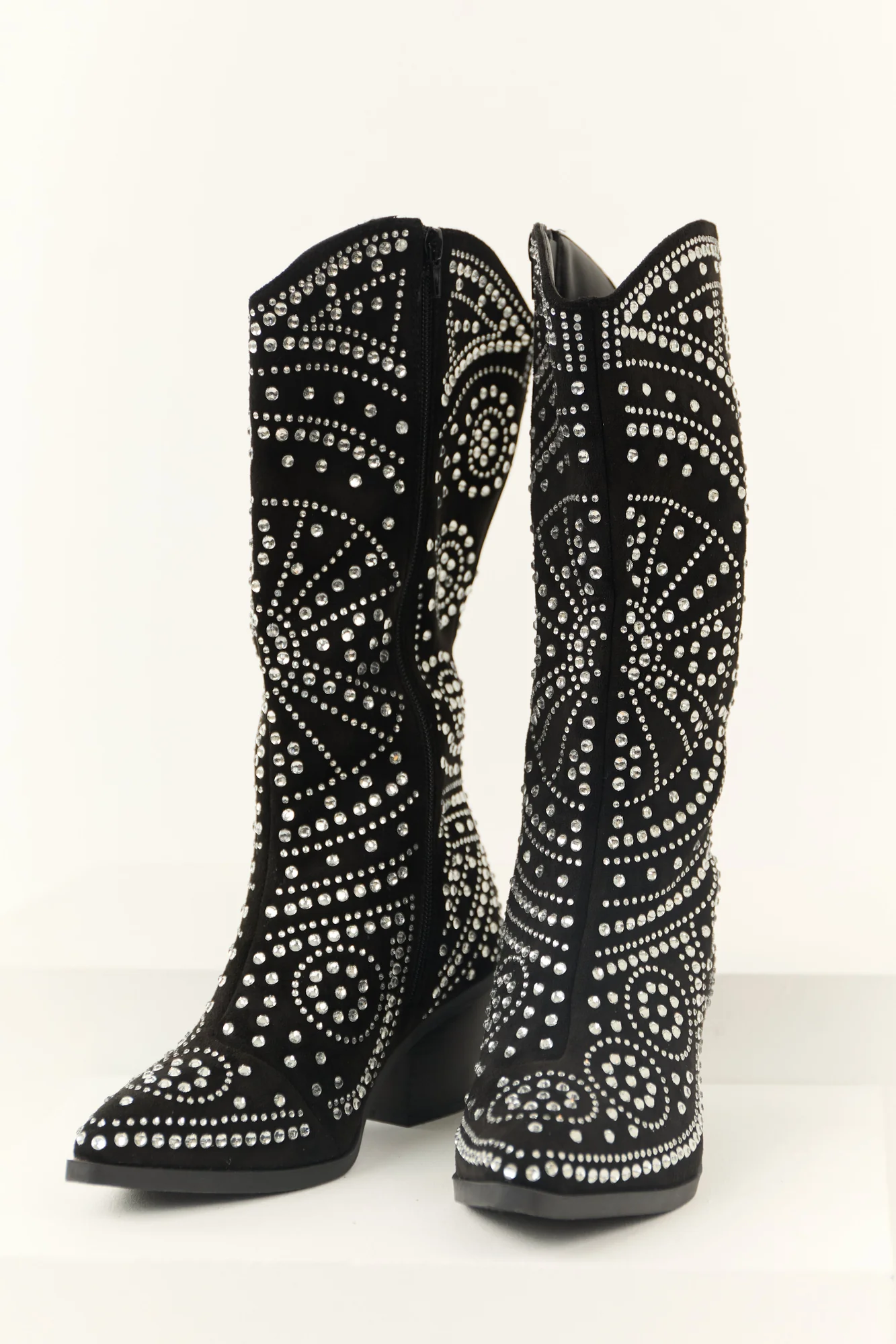 Step out in style with these black faux suede calf boots featuring rhinestone detailing. The stacked block heel and curved opening add a touch of glamour, while the side pull tabs ensure easy wear. With a shaft height of 14 inches, circumference of 20 inches, and a comfortable 2.75-inch heel height, these imported boots are a perfect blend of fashion and function, suitable for any occasion. Elevate your look with these stunning boots available in sizes ranging from 5.5 to 10.
