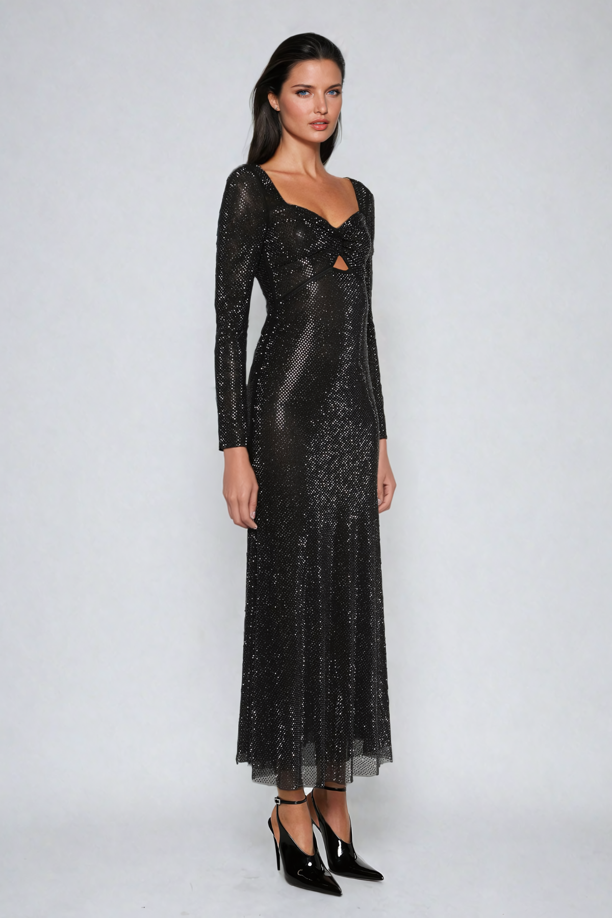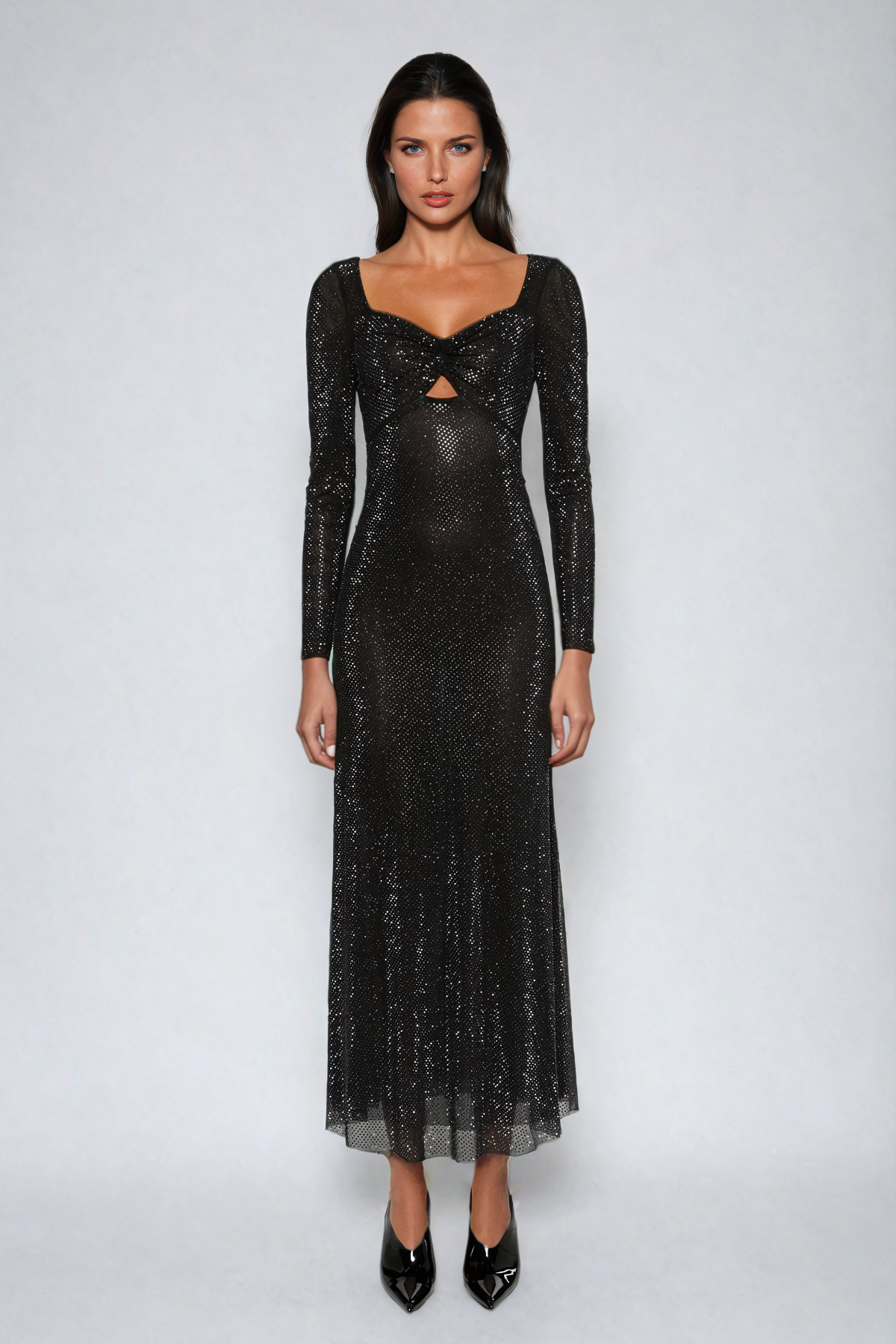 Elevate your evening with the Black Rhinestone Mesh Maxi Dress designed . This chic essential boasts intricate rhinestone embellishments on flowy mesh fabric, ensuring you make a glamorous statement at any event. The maxi length exudes elegance while the stretchy material guarantees a comfortable fit throughout the night. Ideal for formal occasions or a night out, this dress is a timeless wardrobe piece. Crafted from 50% Polyester and 50% Cotton. *Color may vary due to lighting on images.