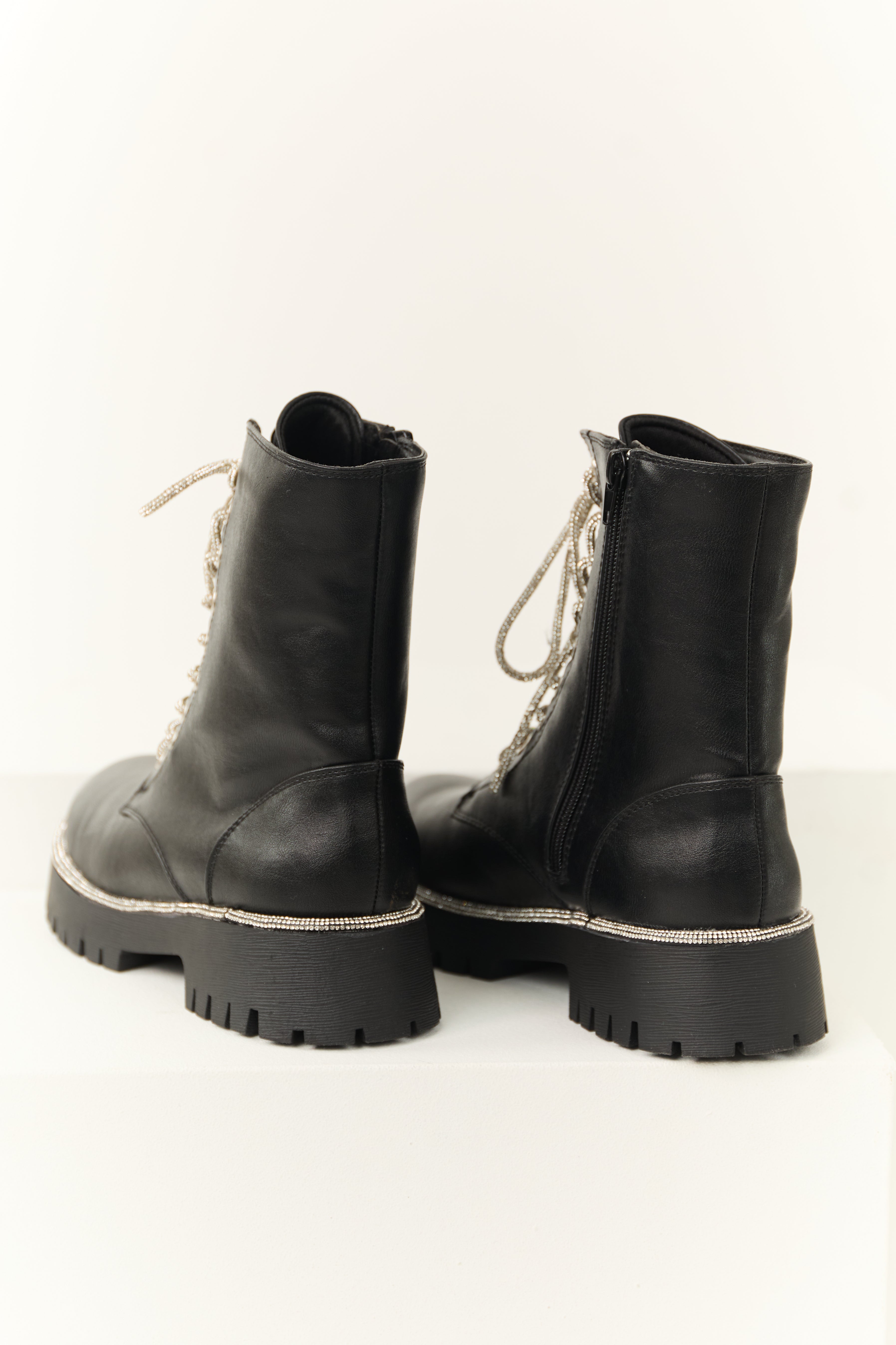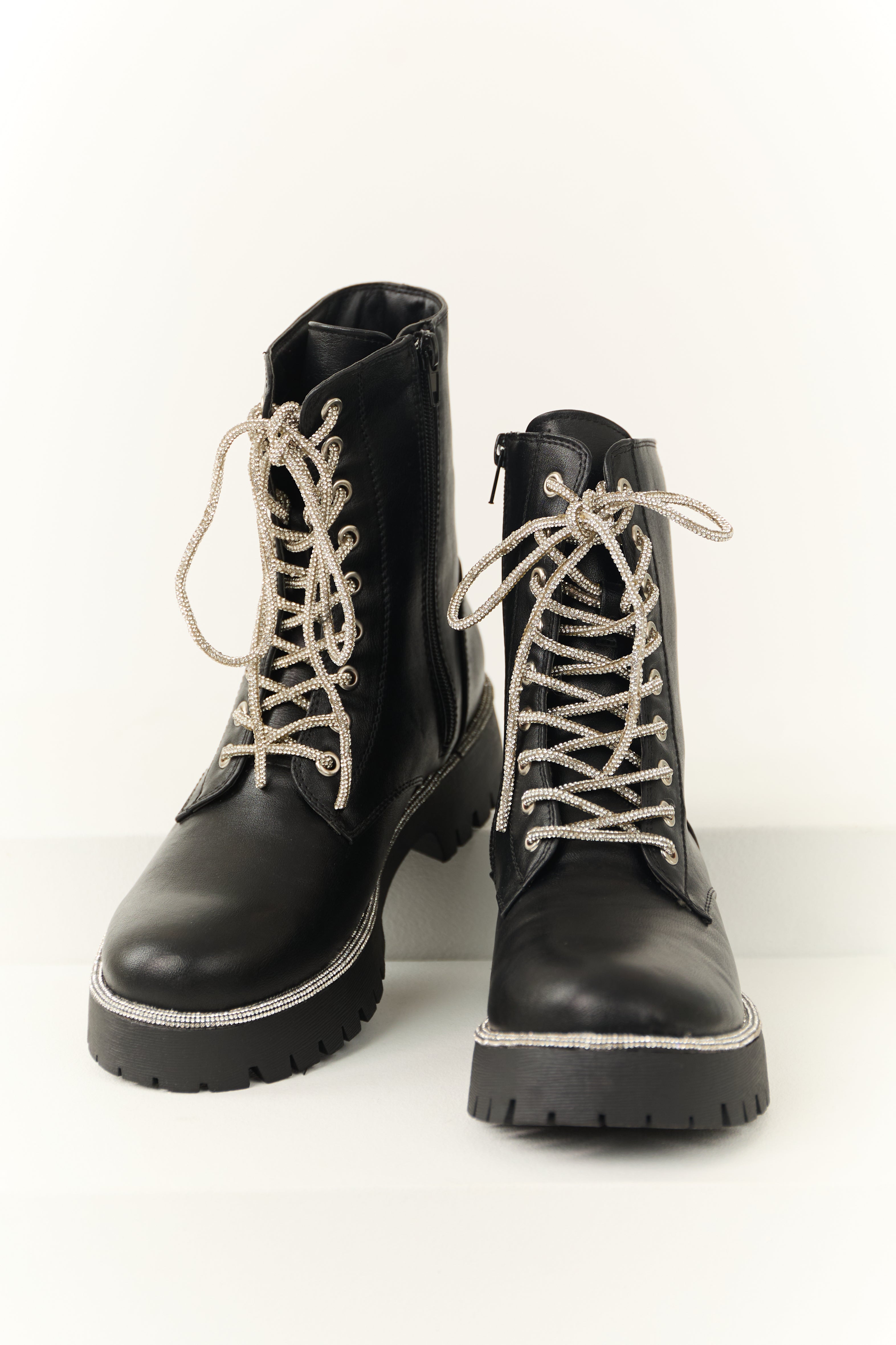 Upgrade your shoe game with these black platform combat boots featuring rhinestone details. Made of faux leather, these boots come with a side zipper, lace-up closure, rounded toe, and a comfortable 1.75″ platform. Perfect for casual or daytime wear during fall and winter seasons. Step up your style with these imported boots that measure 8″ in shaft height and 10″ in circumference. Available in multiple sizes.