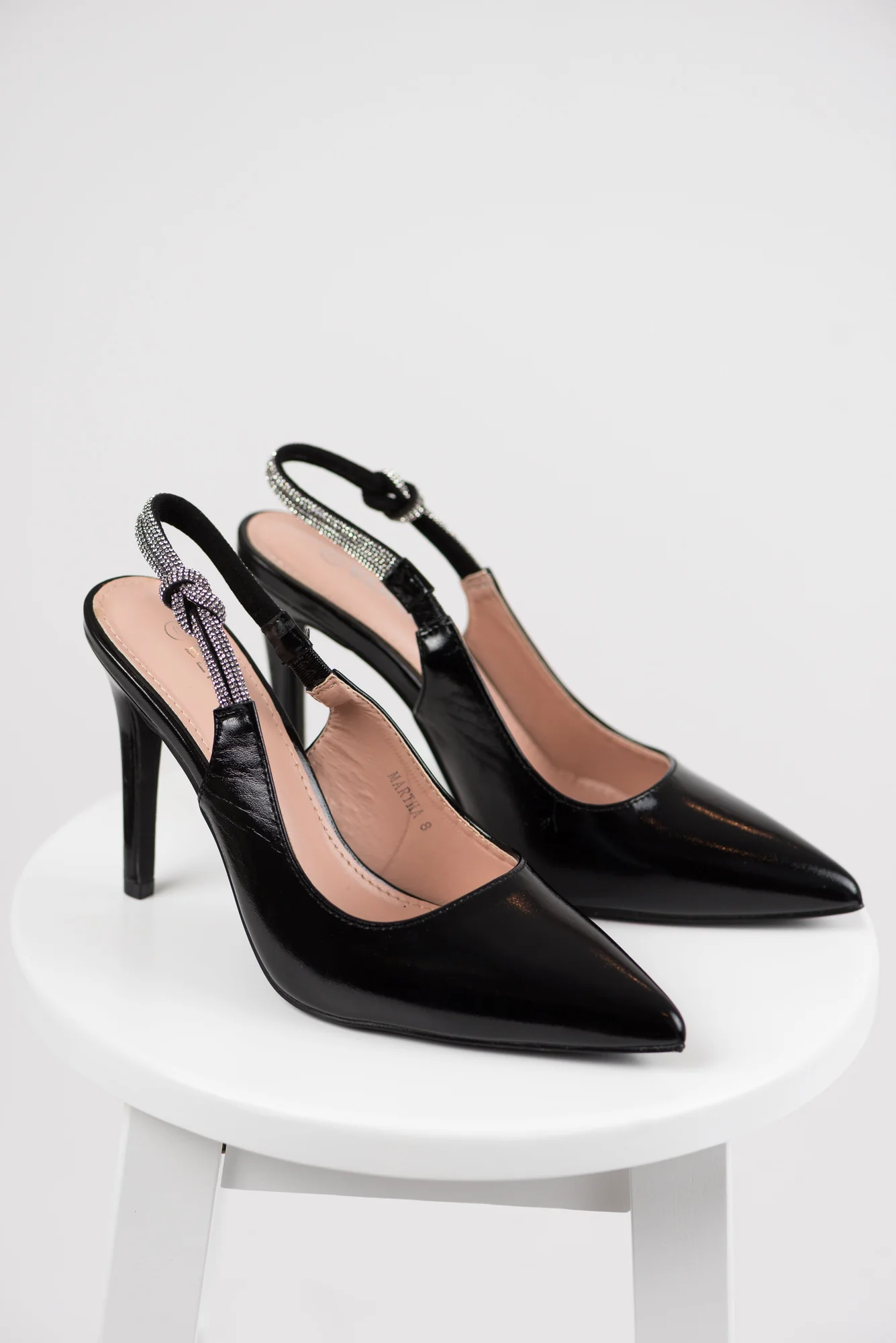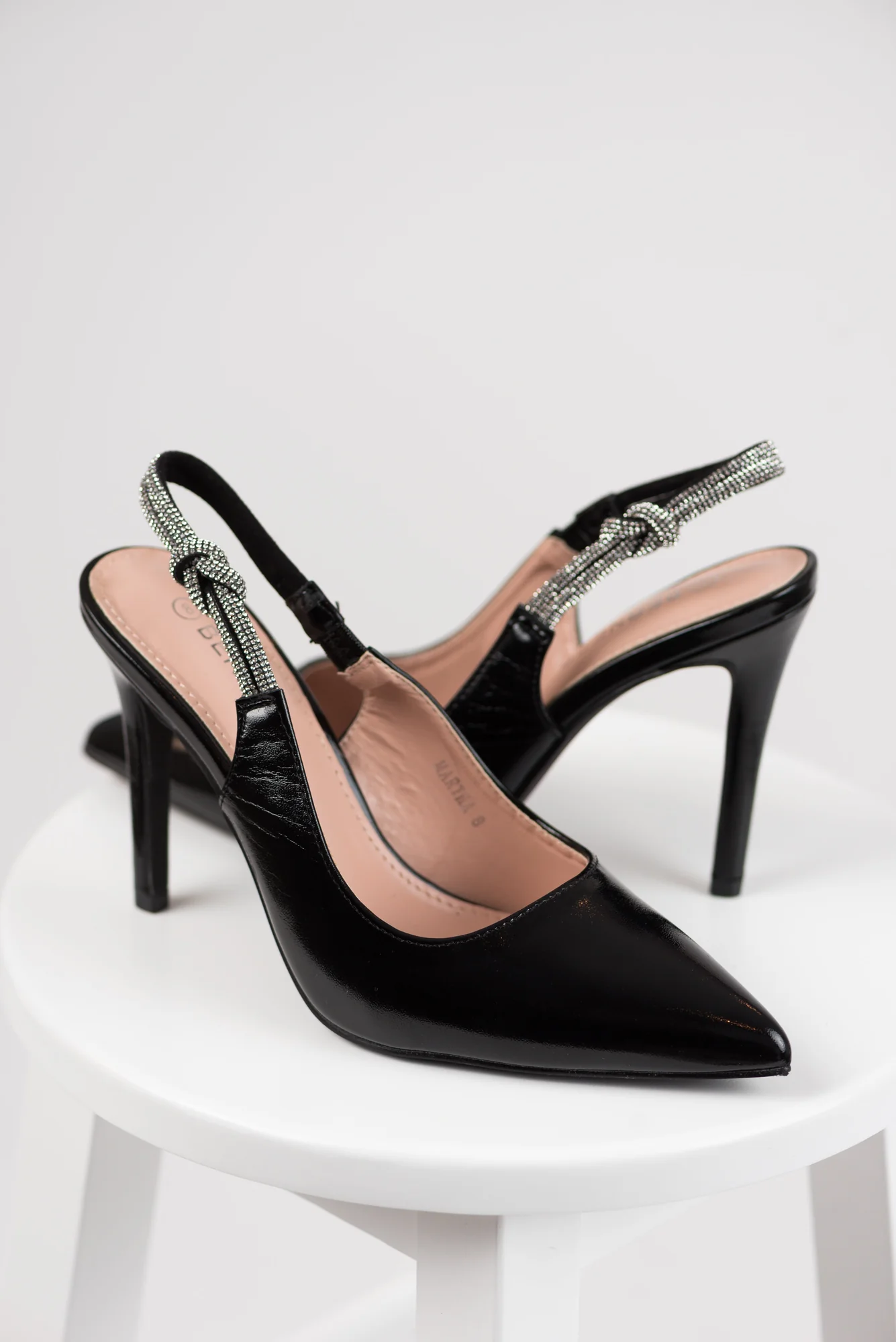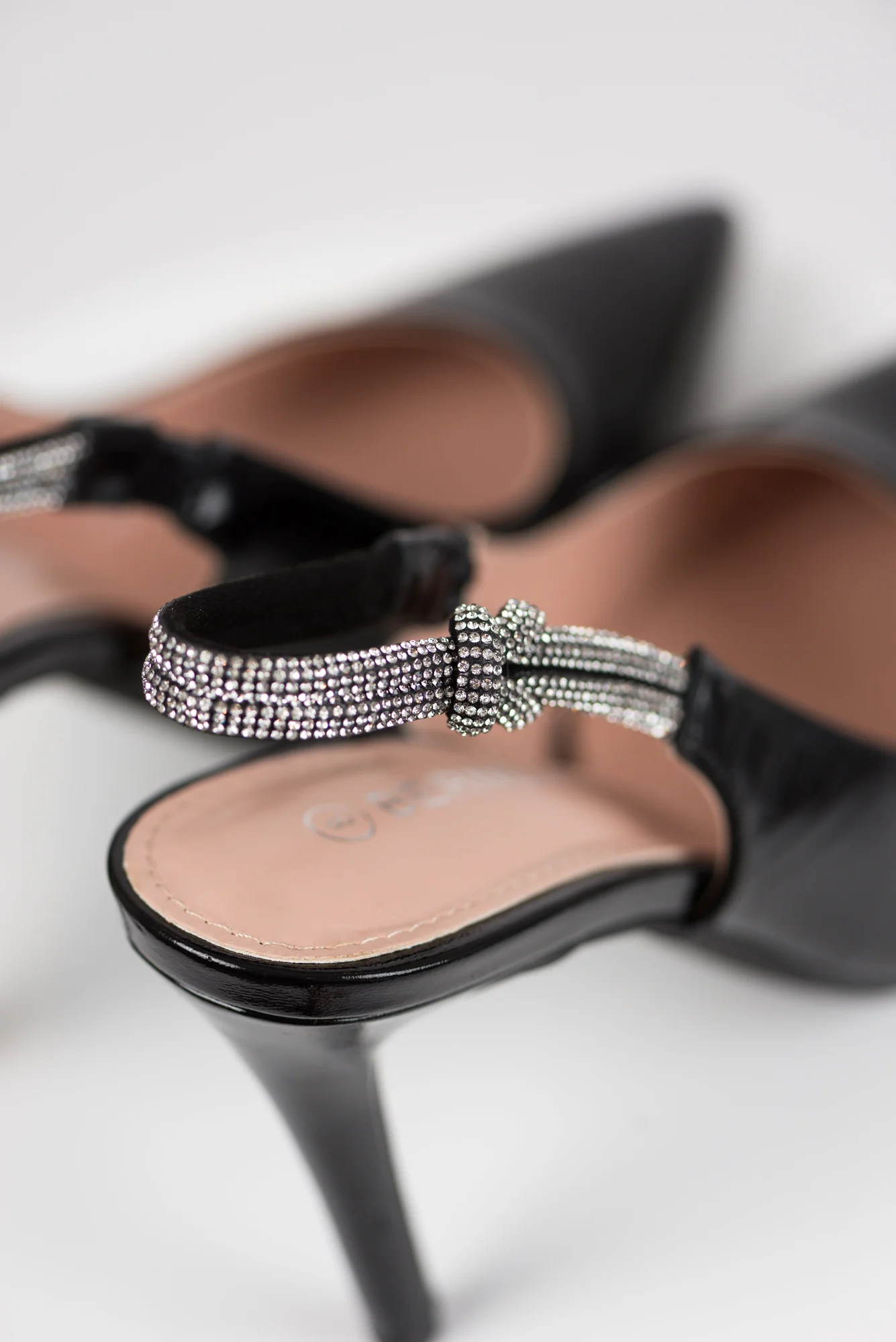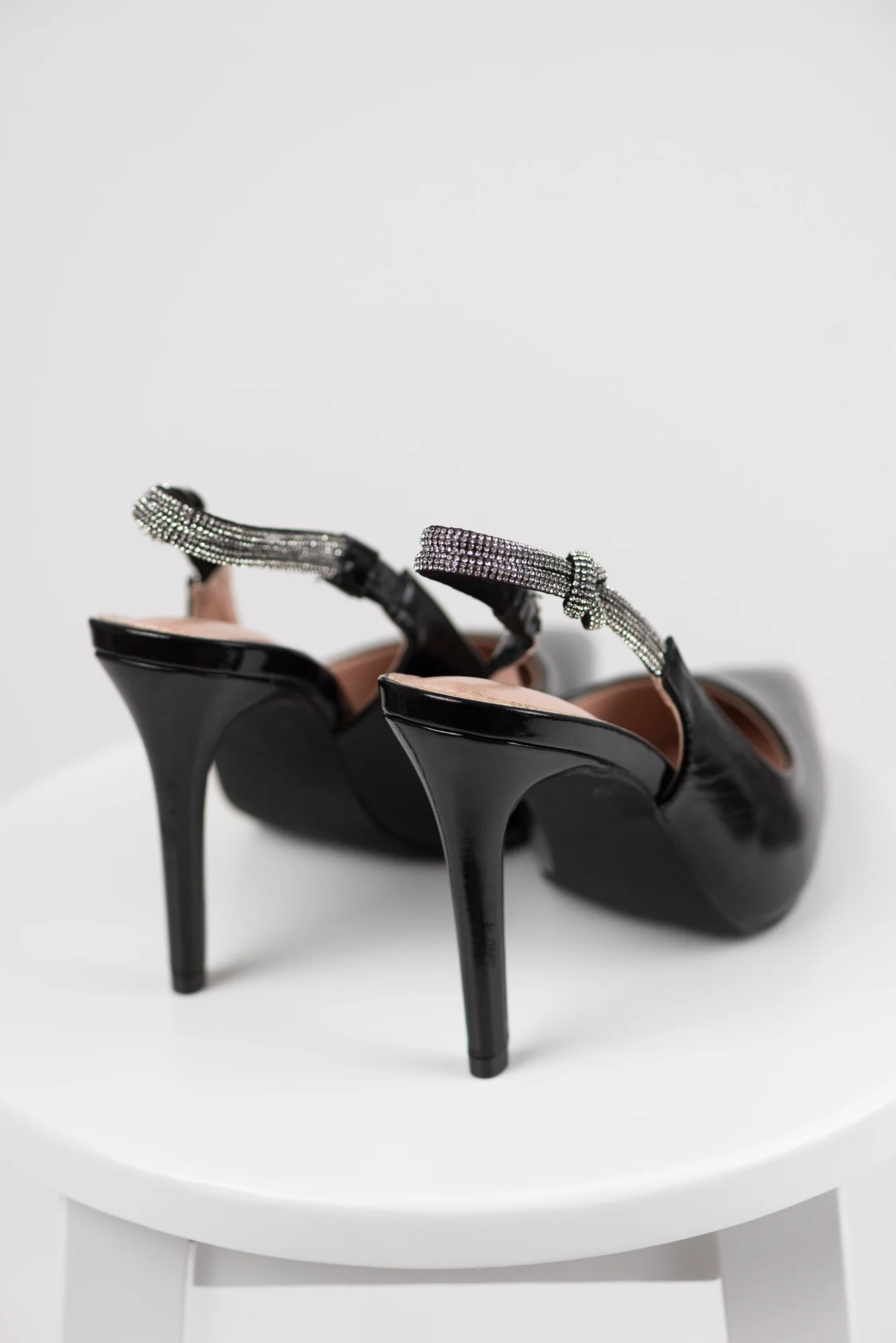 Step out in style with these black slingback shoes featuring silver rhinestones. Made of shiny faux leather with a pin stiletto high heel and knot detail, these shoes offer both elegance and comfort. Slip-on design with lightly cushioned insole, rubber sole, and 4″ heel. Shaft measures 3.5″ with a circumference of 9″. Imported. Available in sizes 5.5 to 10. Elevate your evening with these trendy heels .