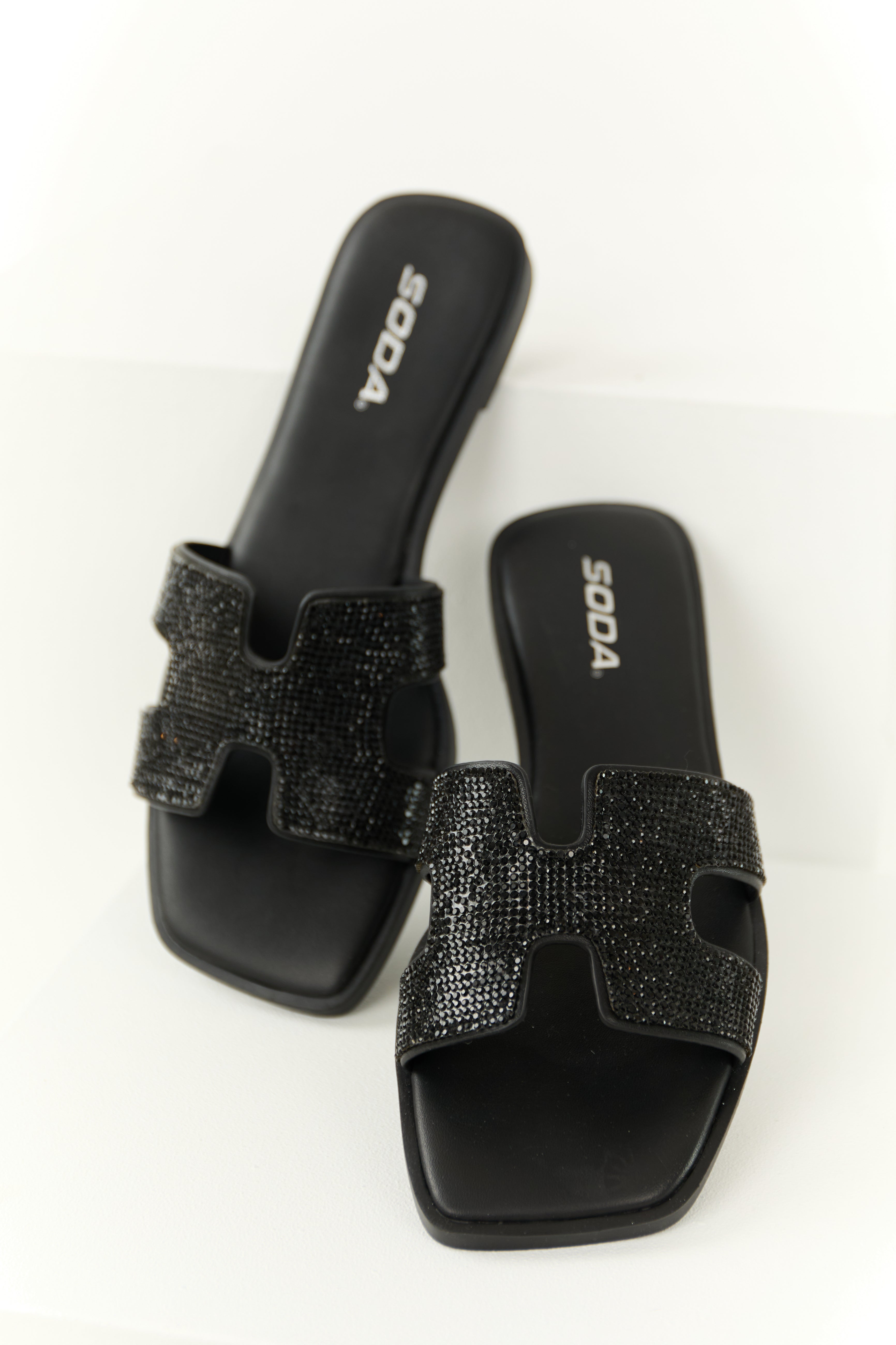 Discover the elegance and comfort of these Black Rhinestone Open Toed Slip-On Sandals for women. Made of faux leather with a square toe design, these sandals feature a slightly cushioned insole, one strap, and a low heel height of 0.25 inches. Perfect for casual daytime wear during the spring and summer seasons. Available sizes range from 5.5 to 10. Elevate your style with these fashionable sandals. Order now!