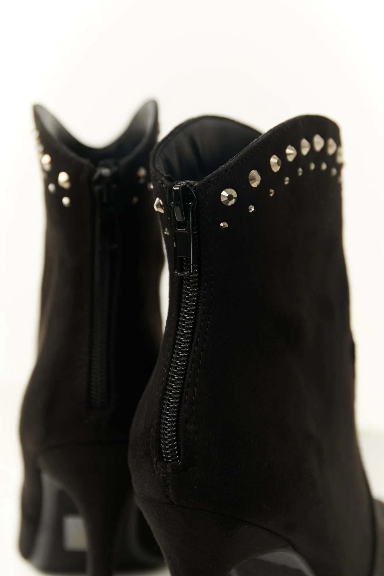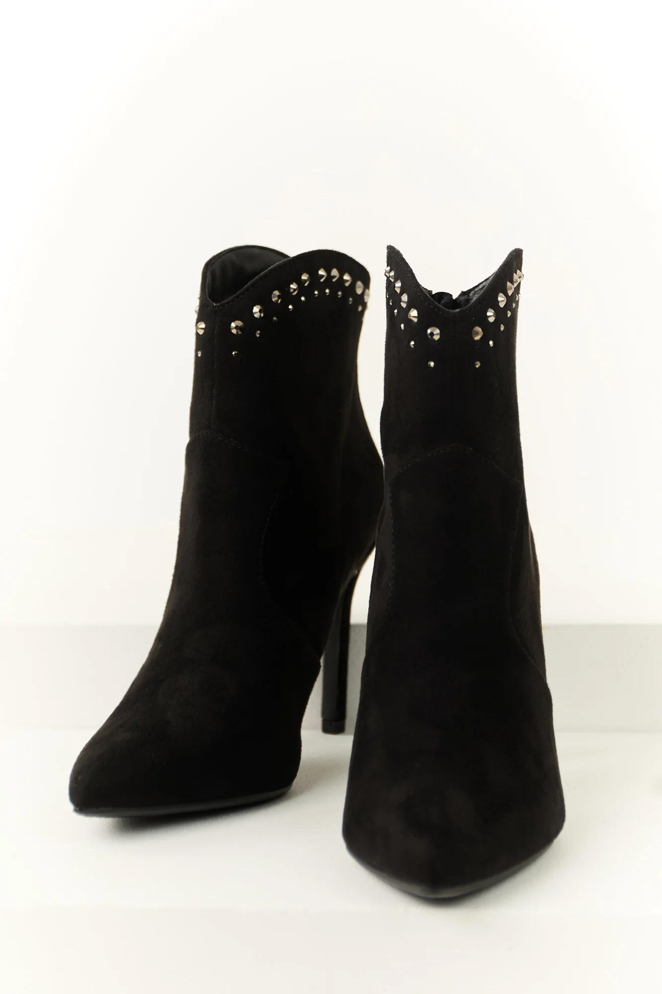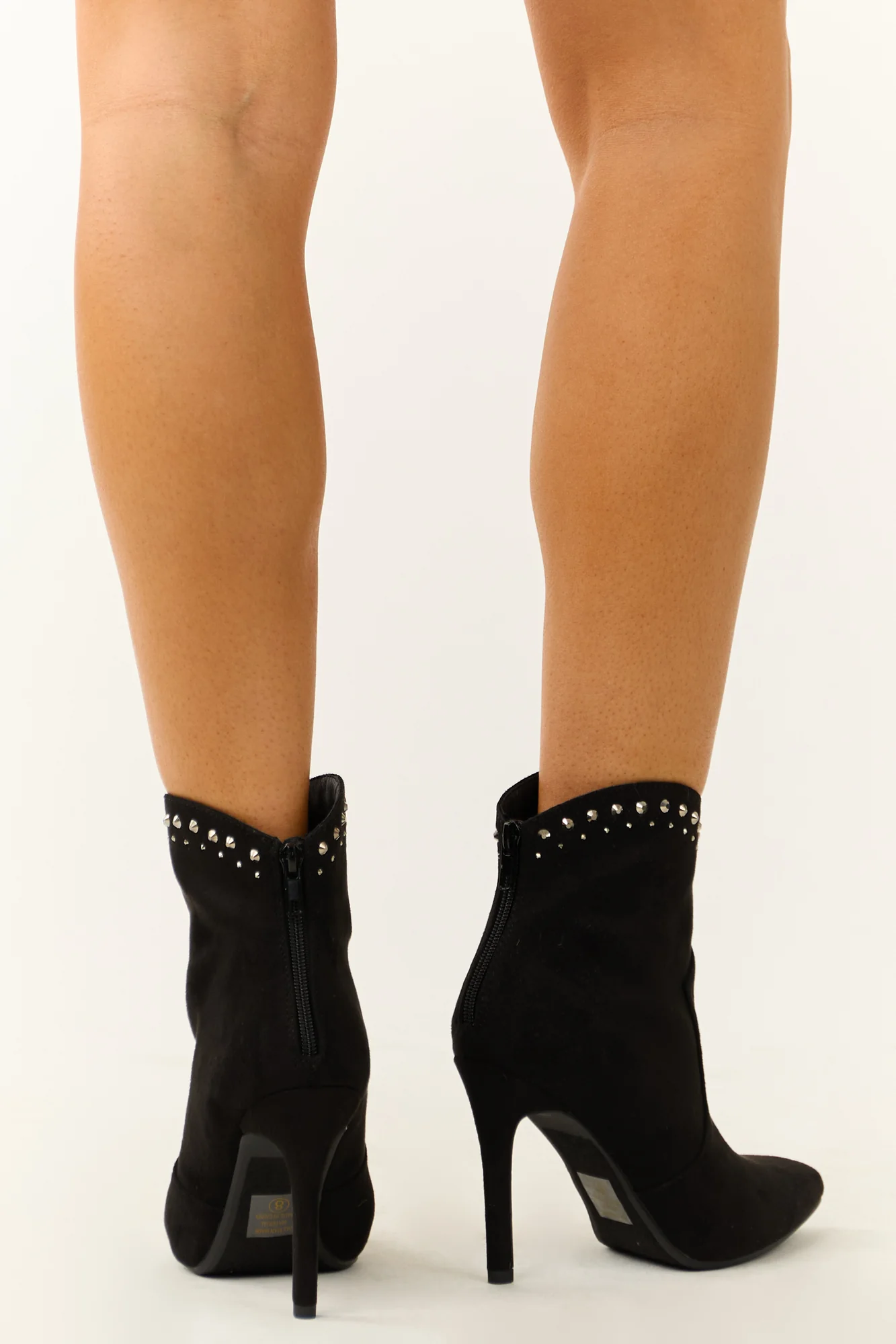 Step up your shoe game with these elegant Black Rhinestone Stiletto Heel Ankle Boots. Crafted from faux suede with a cushioned insole, pointed toe, and a stylish curved opening. The 4″ heel adds a touch of allure. Imported.