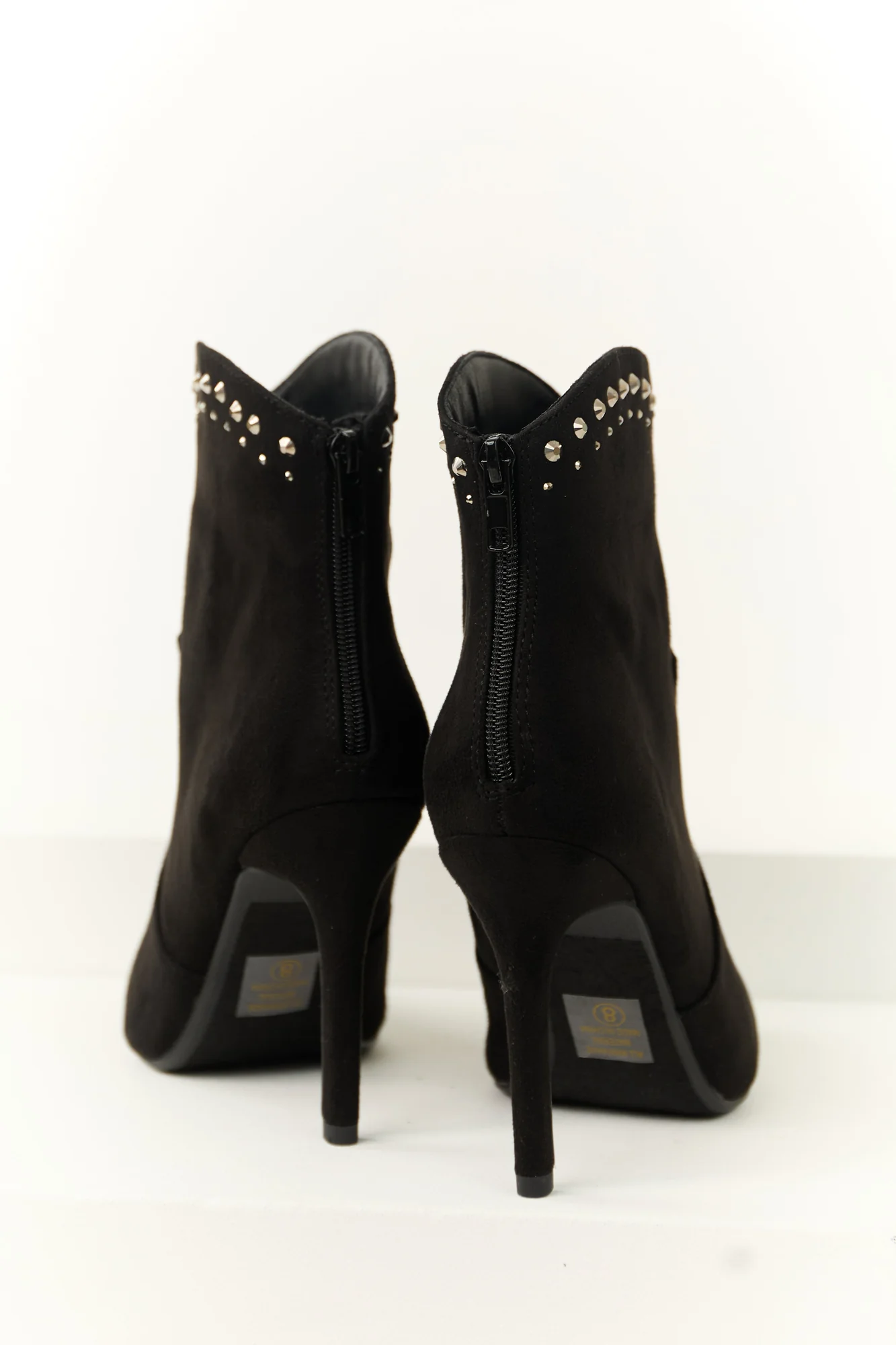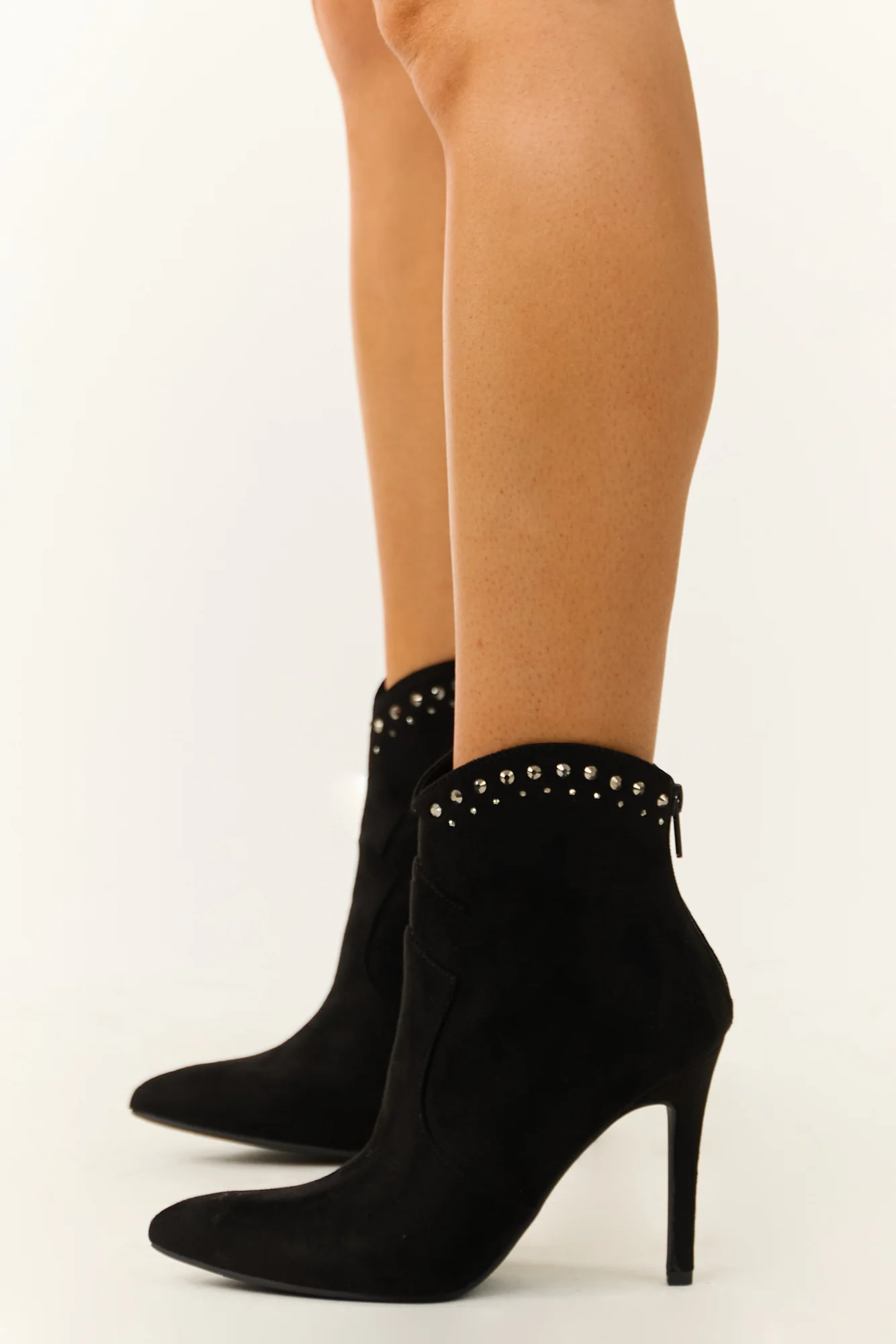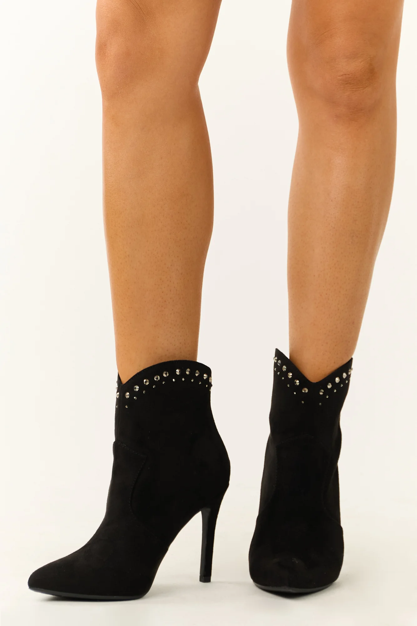 Step up your shoe game with these elegant Black Rhinestone Stiletto Heel Ankle Boots. Crafted from faux suede with a cushioned insole, pointed toe, and a stylish curved opening. The 4″ heel adds a touch of allure. Imported.
