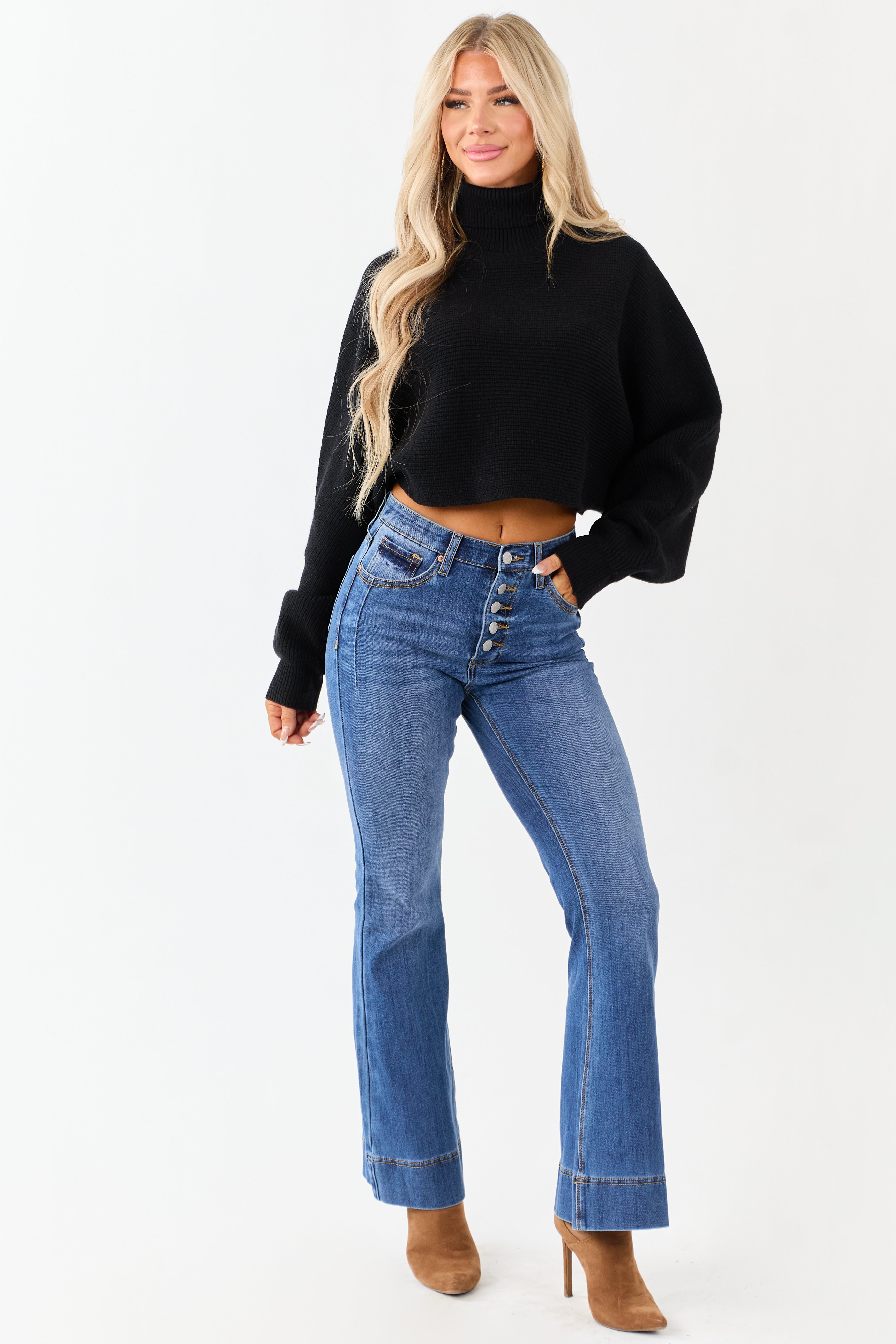 Stay cozy and stylish with our Black Rib Knit Turtleneck Sweater. This sweater features a wide fit with stretchy rib knit fabric, long balloon sleeves, and ultra-cropped design for a trendy look. The ribbed turtleneck and fitted cuffs add texture and warmth while the drop shoulder silhouette offers a relaxed fit. Made of 40% Acrylic, 40% Nylon, and 20% Polyester. Care instructions: Hand wash cold, do not bleach, line dry, iron low. Model is wearing a size Small. Ideal for casual outings or lounging at home.